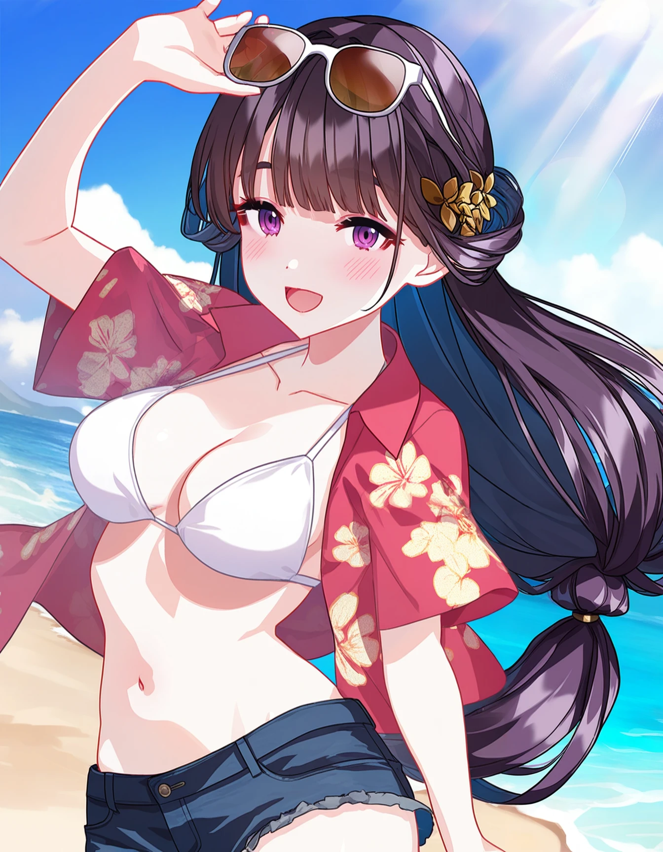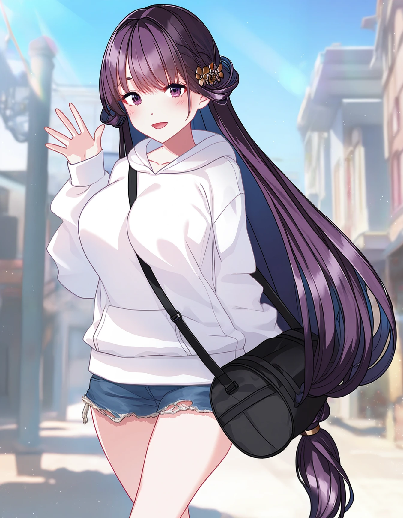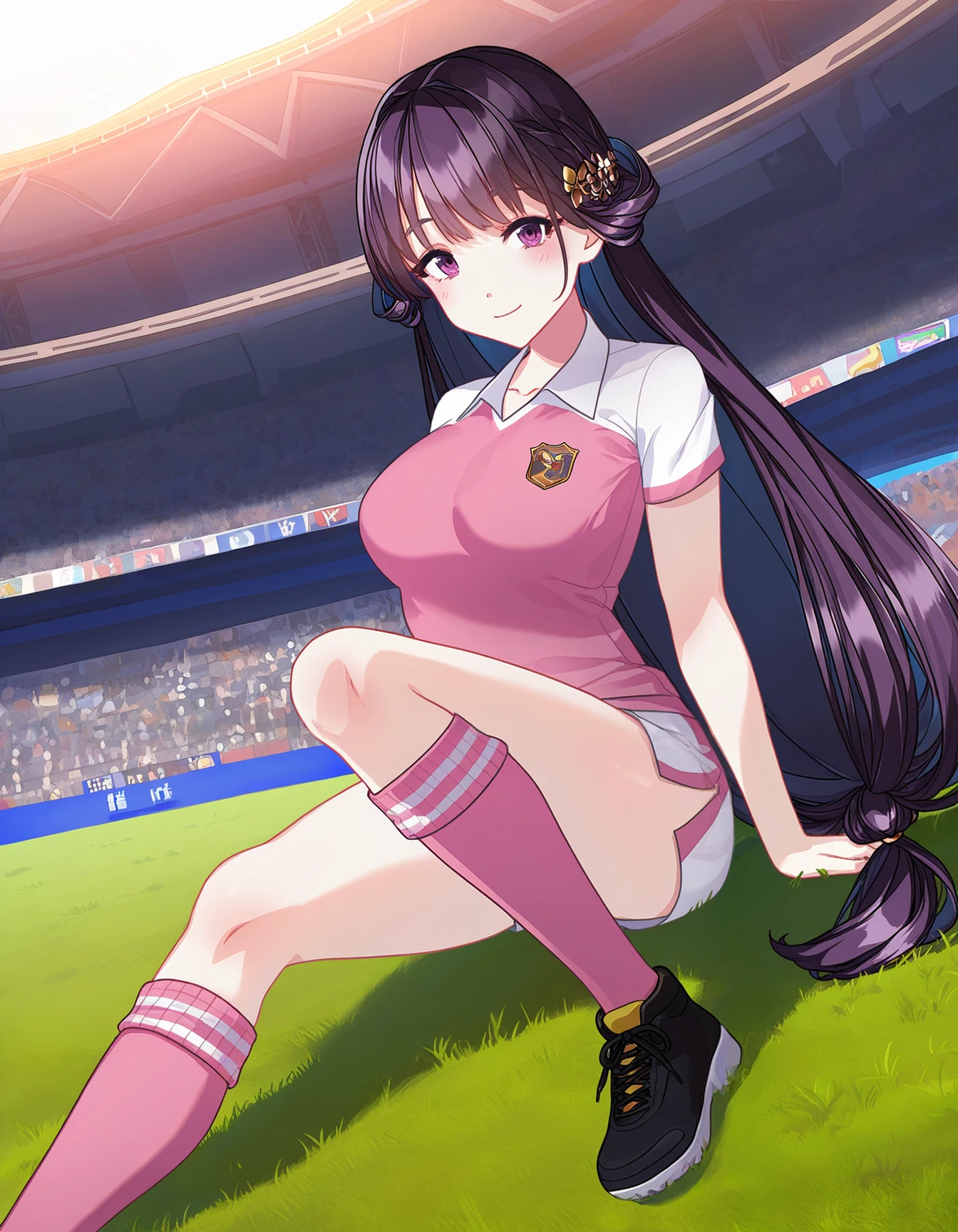 sat, 1girl, purple hair, half updo, hair ornament, low-tied long hair, purple eyesOutfit 1: (Red Soccer Uniform)