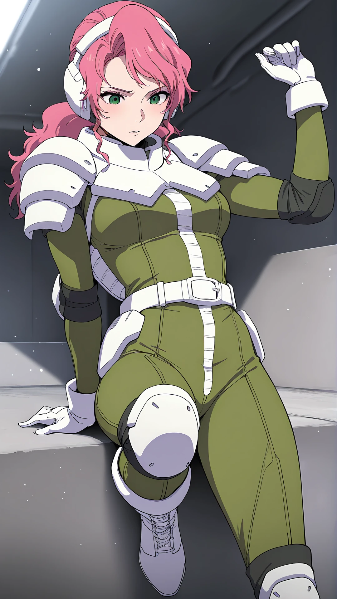 hilde nietzsche,solo,pink hair,1girl,gloves,belt,green ,long hair,white gloves,armor,boots,knee pads,