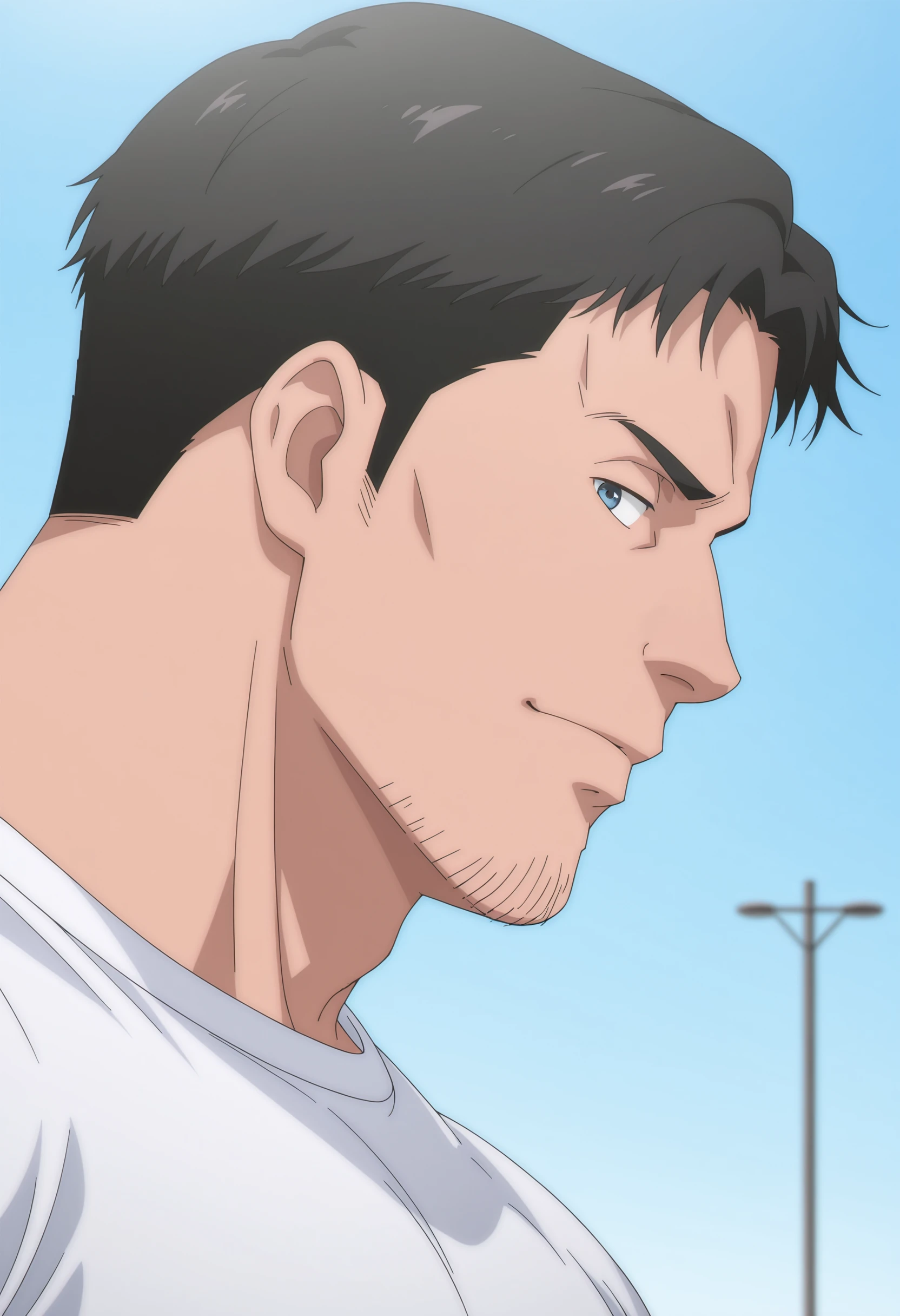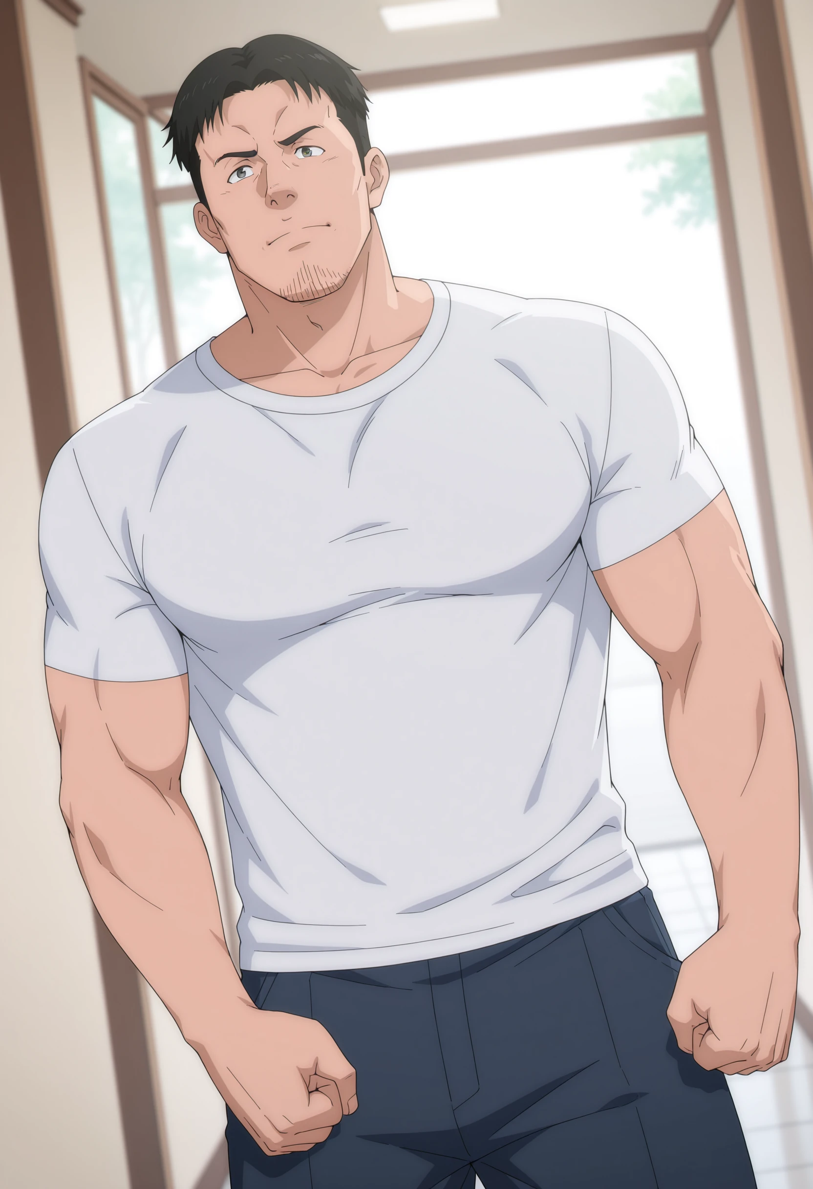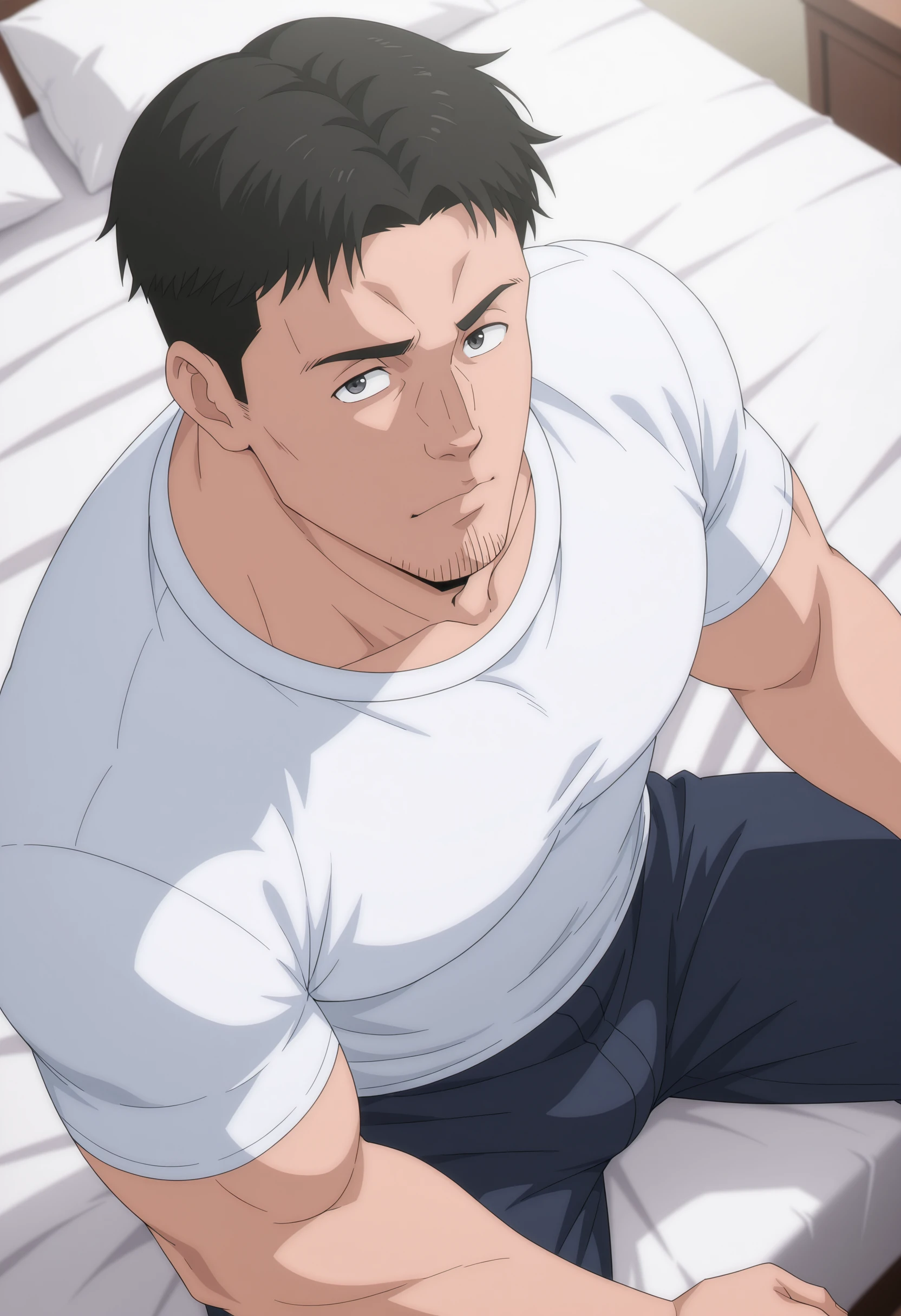 black hair, black eyes, stubble on chin, white t-shirt
