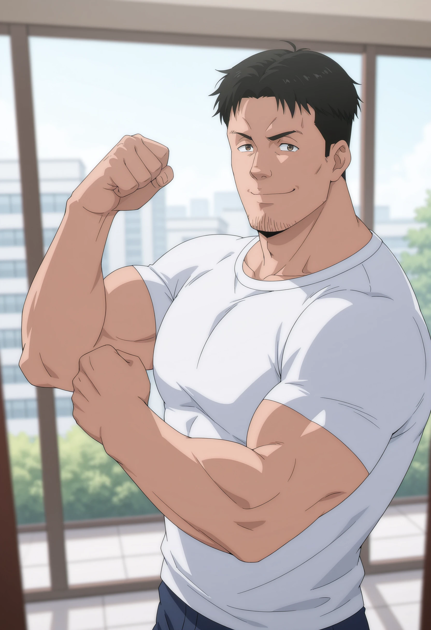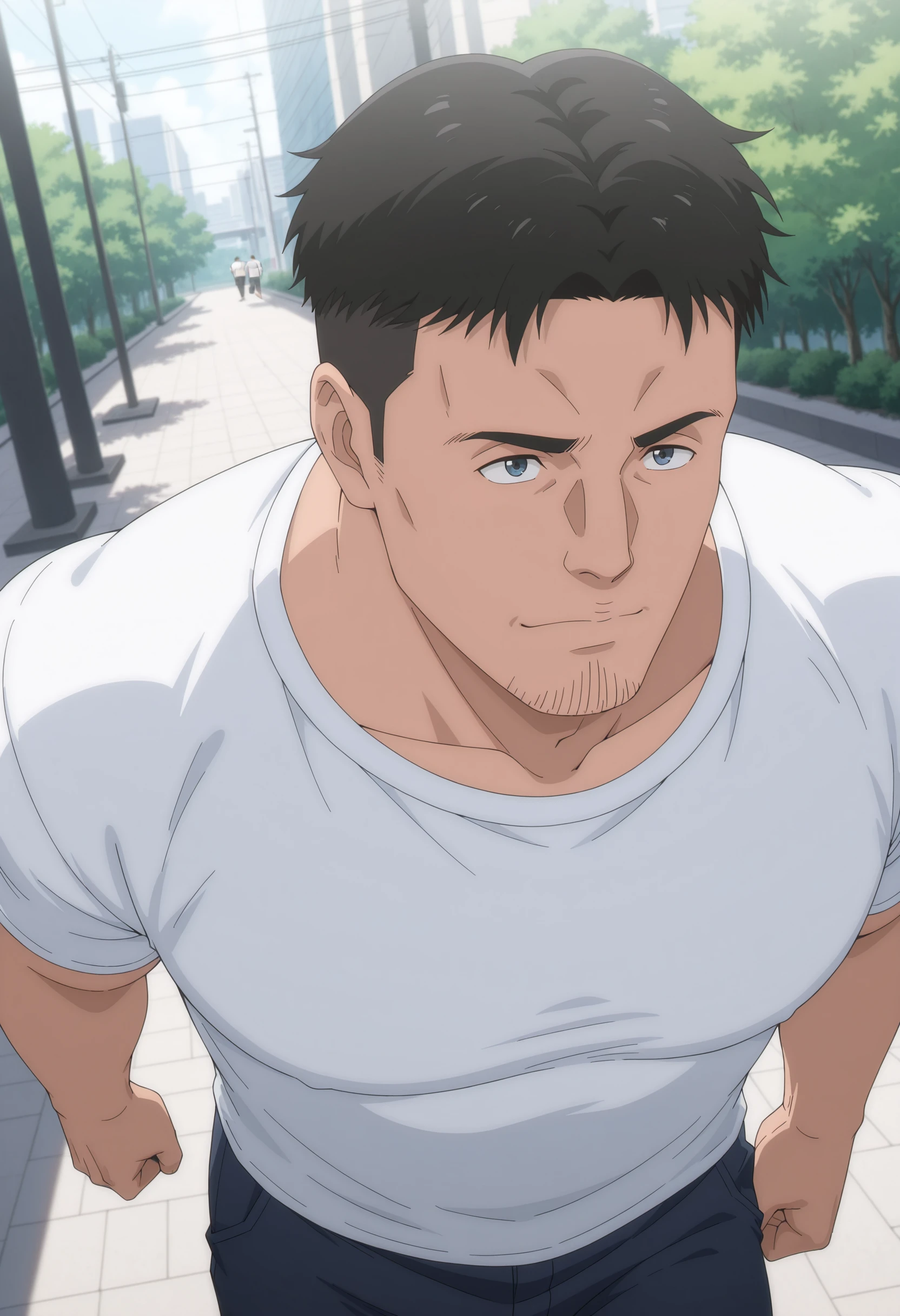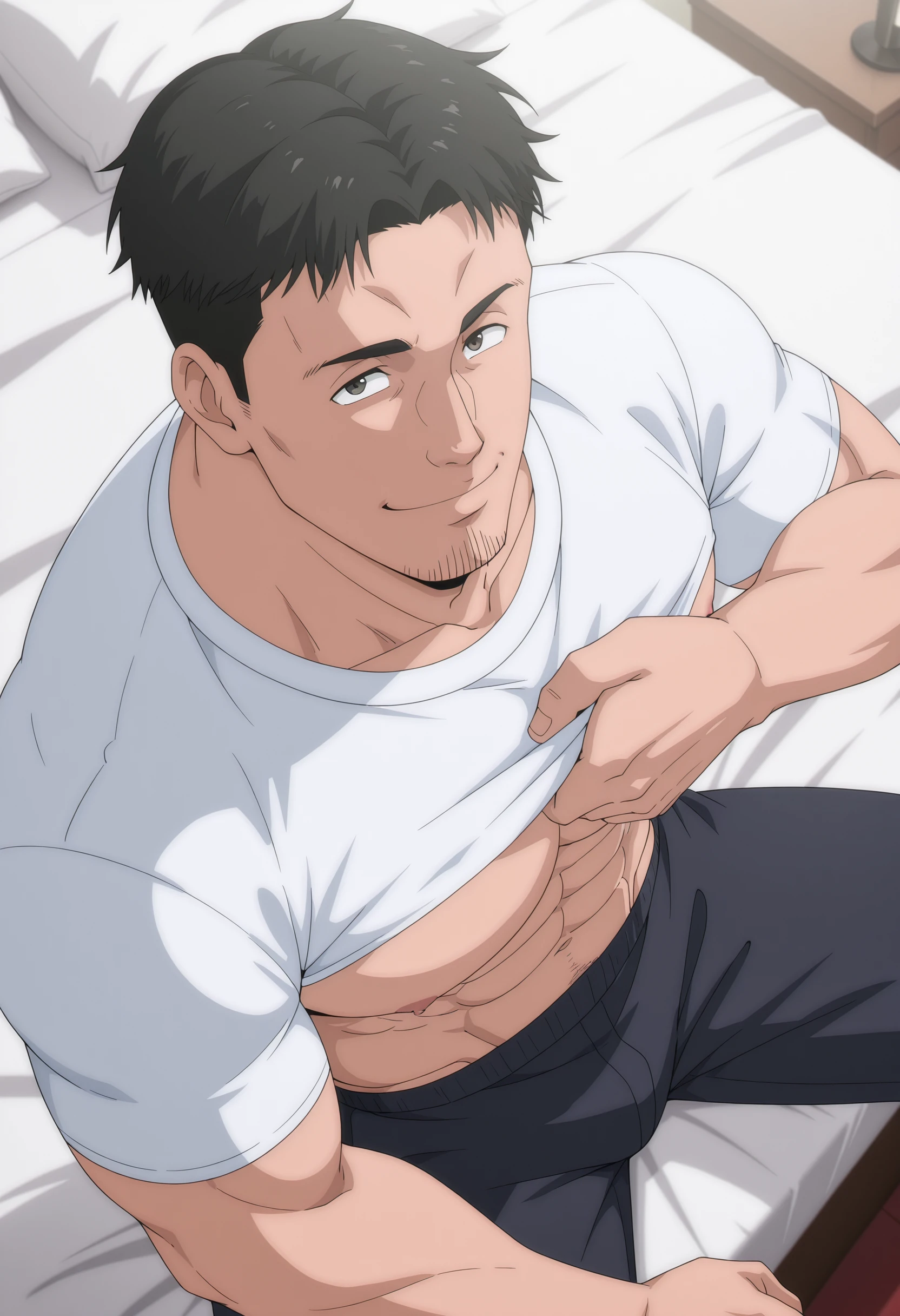 black hair, black eyes, stubble on chin, white t-shirt