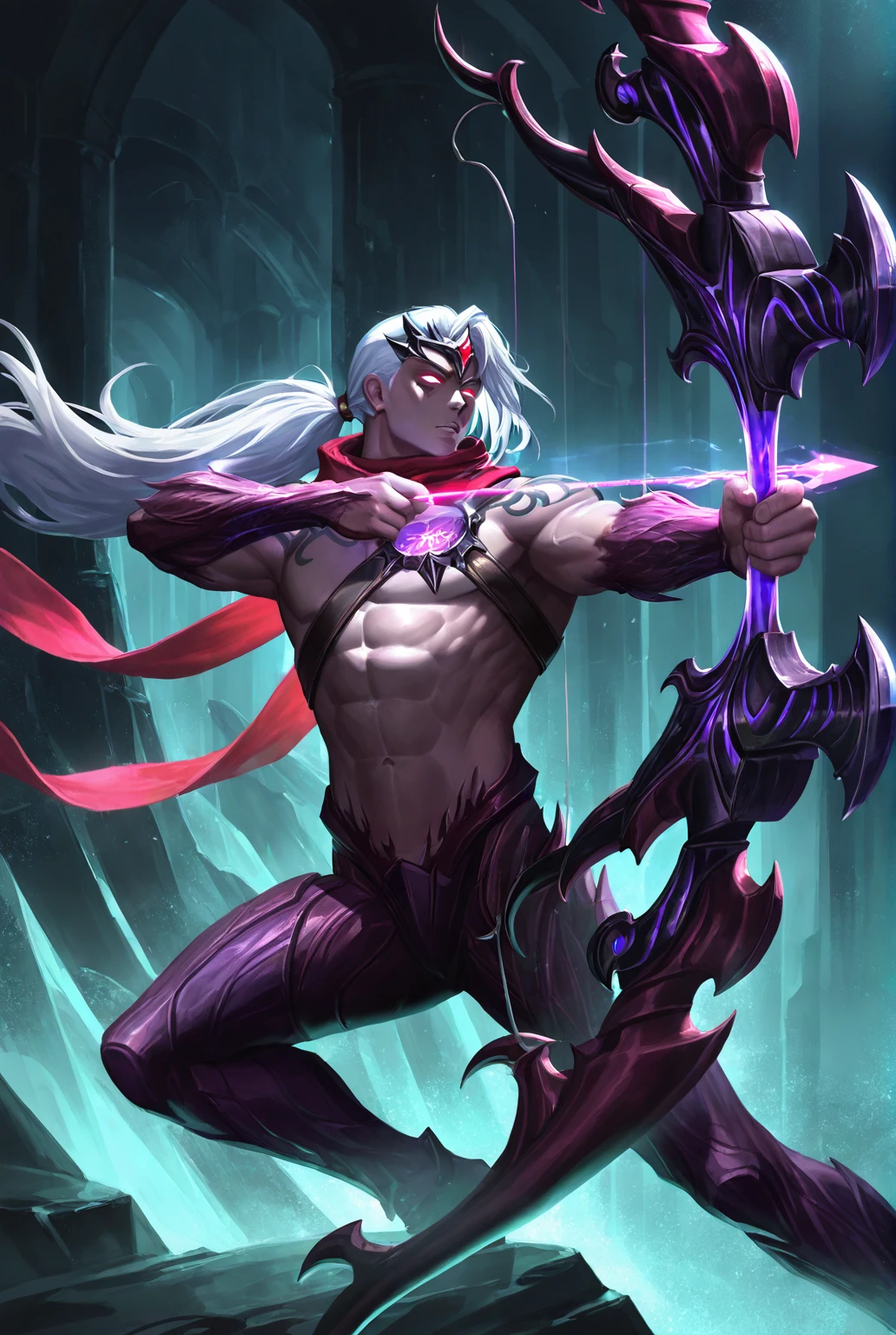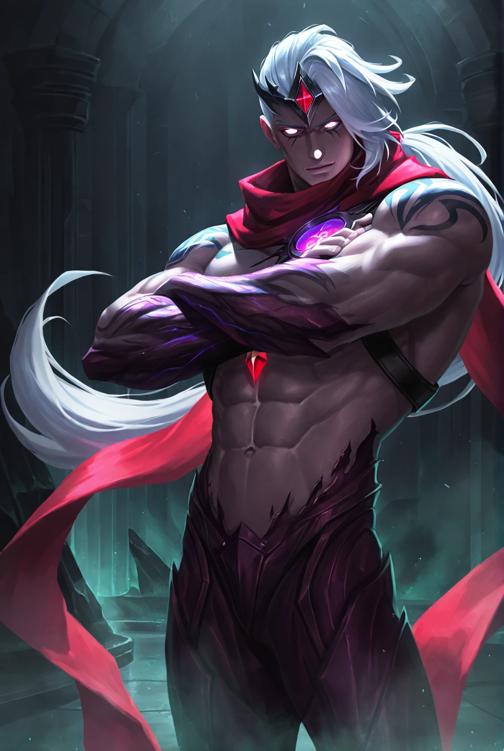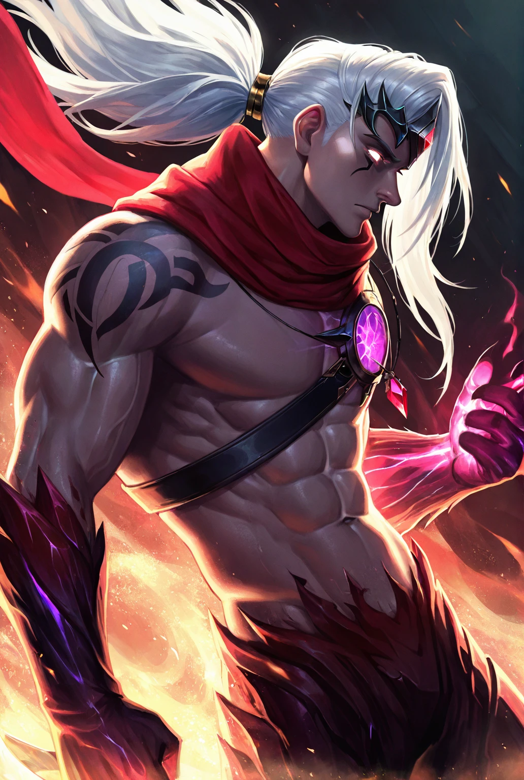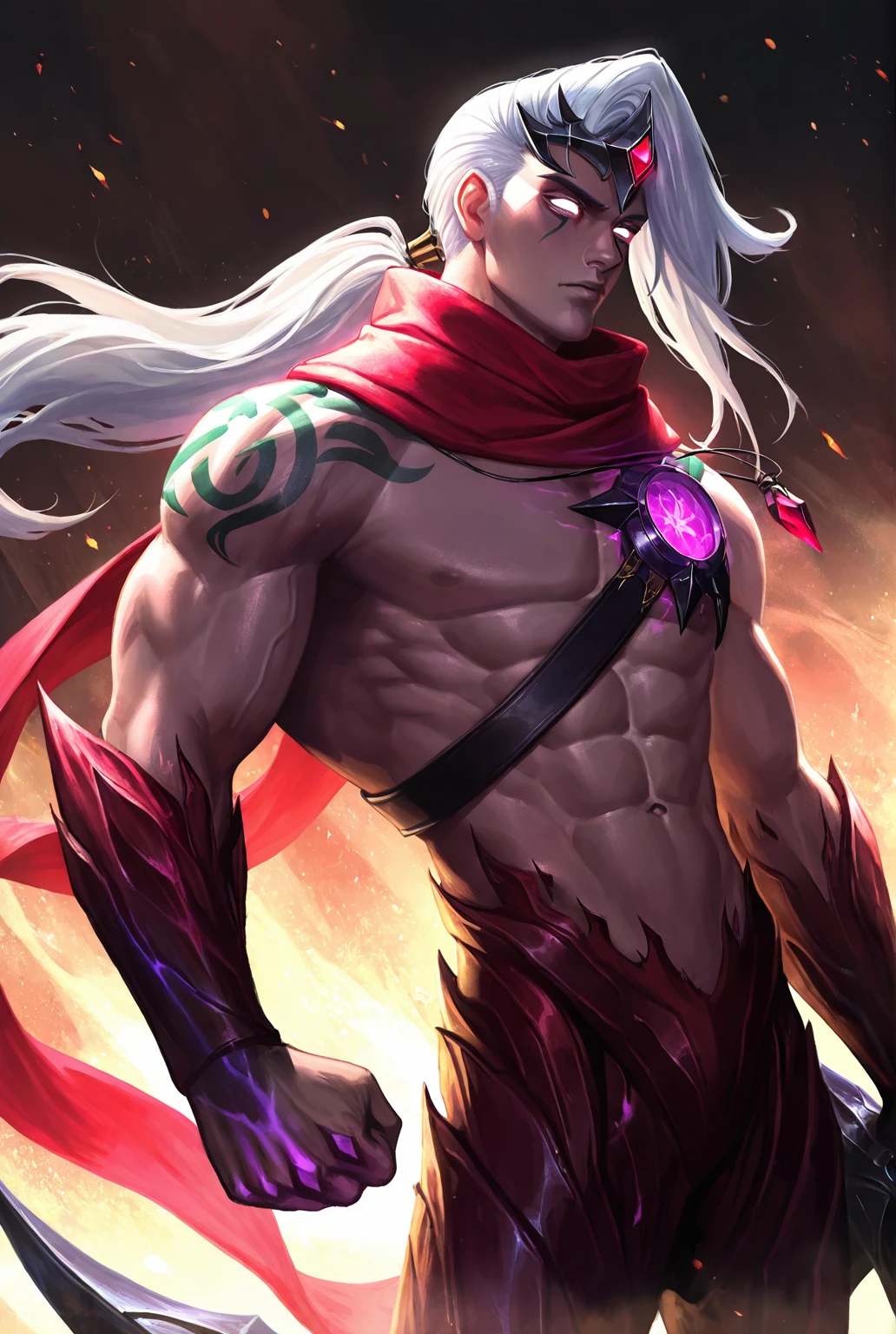v4rus lol, scarf,muscular,white hair,long hair,abs,glowing eyes,gem,tattoo,red scarf,ponytail,