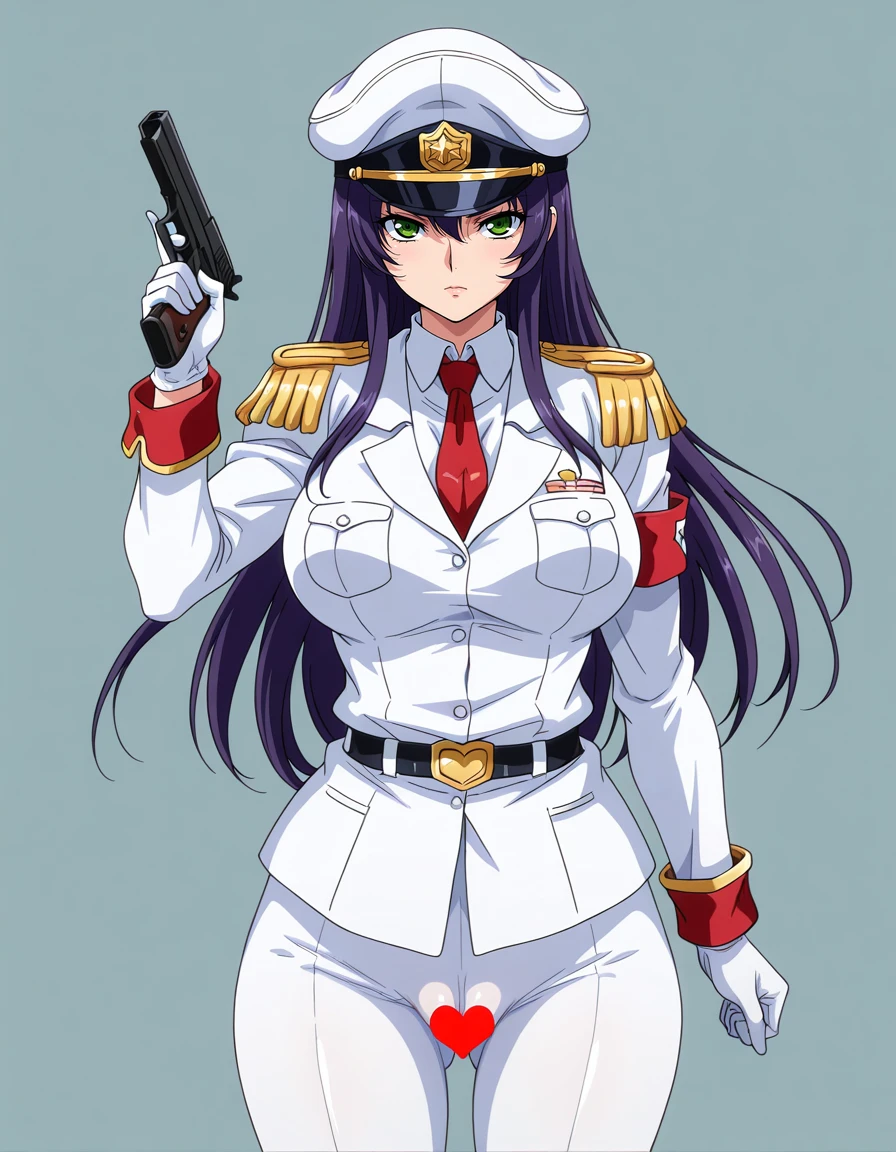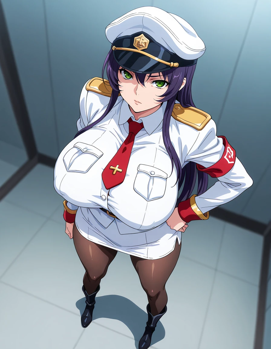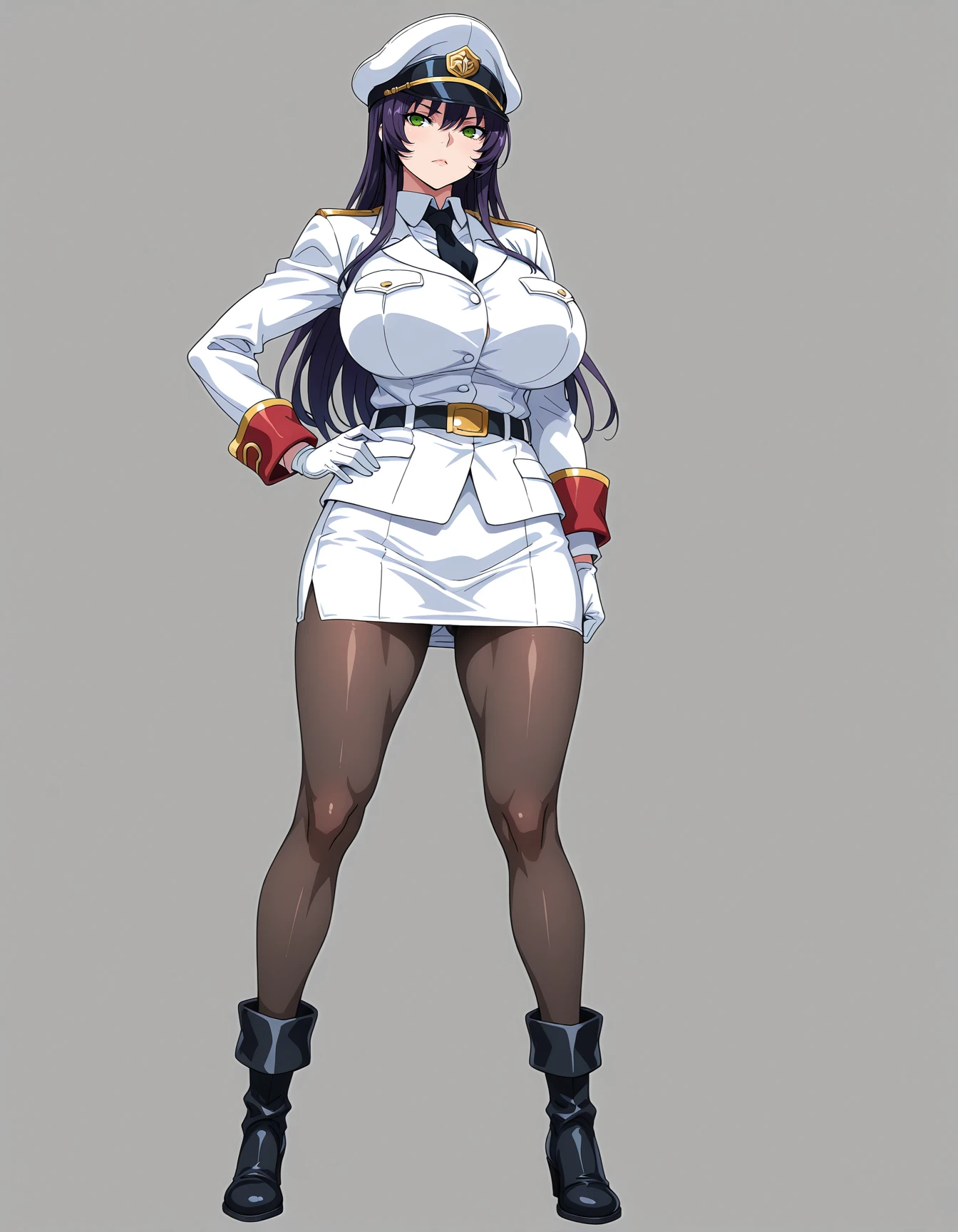 maimariaag4o,purple_hair,long_hair,hair_between_eyes,huge_breasts,green_eyes,military_cap,necktie,military_uniform,pencil skirt,pantyhose,boots,white clothesRecommend preferred Strength: 0.7~1.