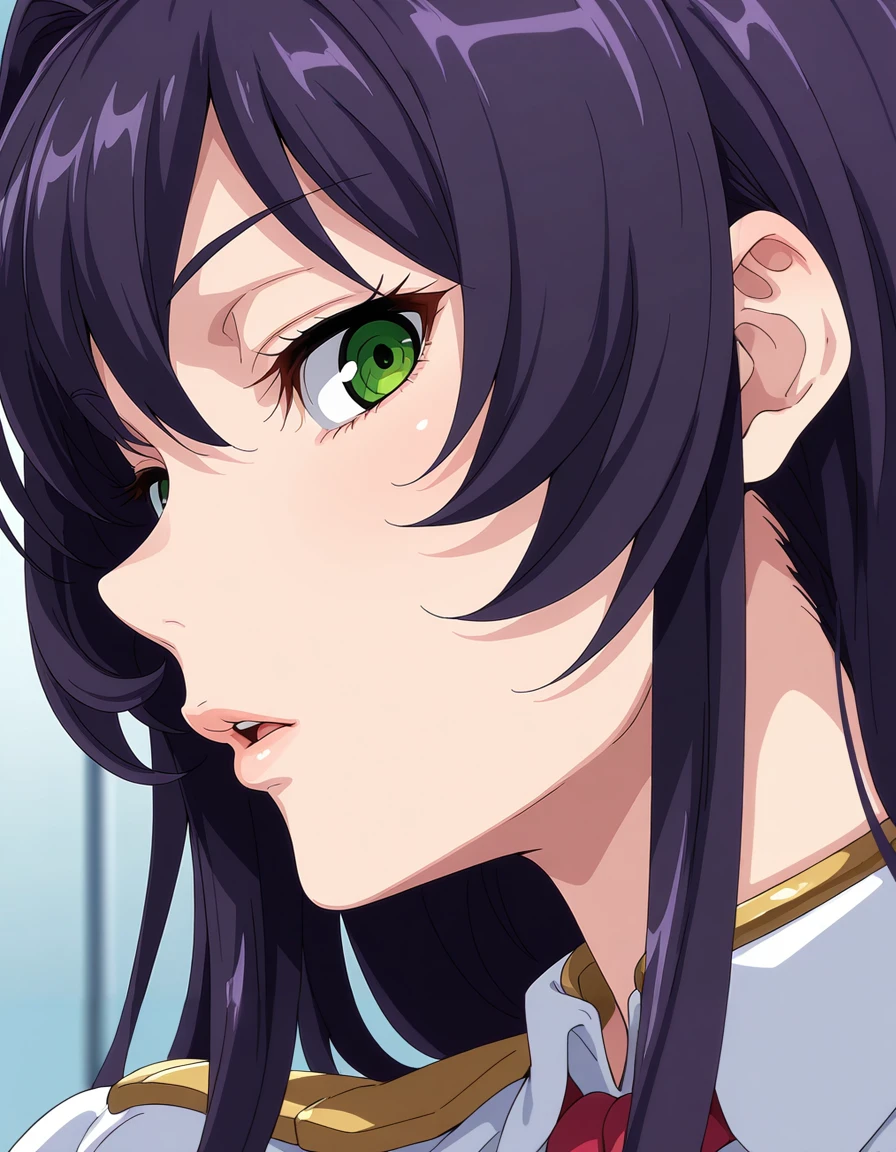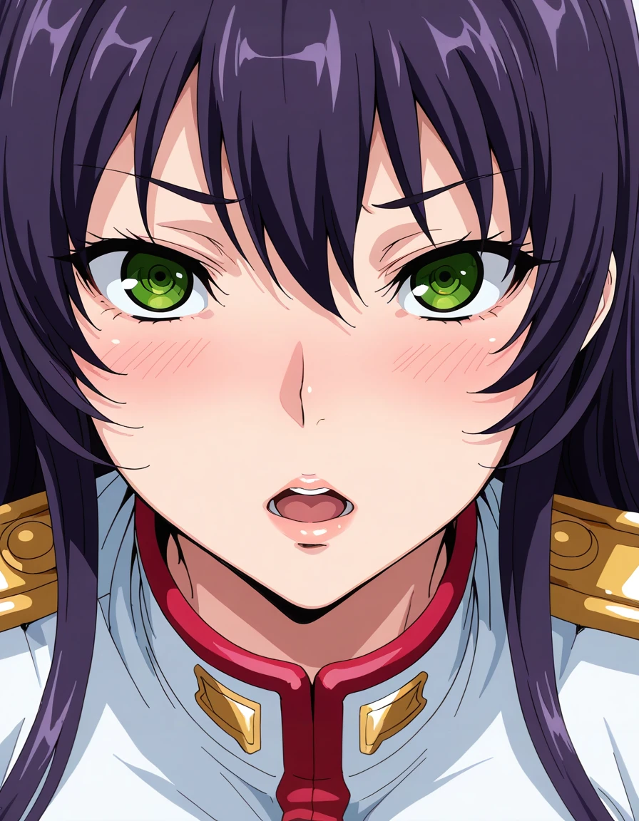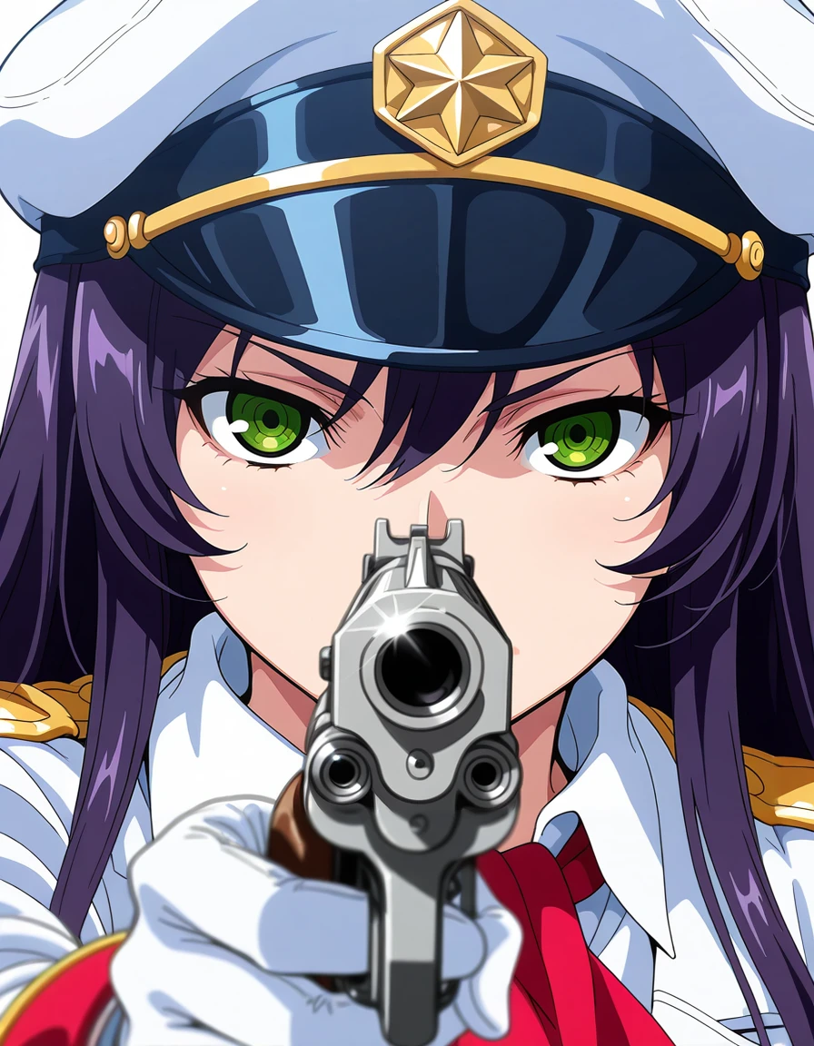 maimariaag4o,purple_hair,long_hair,hair_between_eyes,huge_breasts,green_eyes,military_cap,necktie,military_uniform,pencil skirt,pantyhose,boots,white clothesRecommend preferred Strength: 0.7~1.
