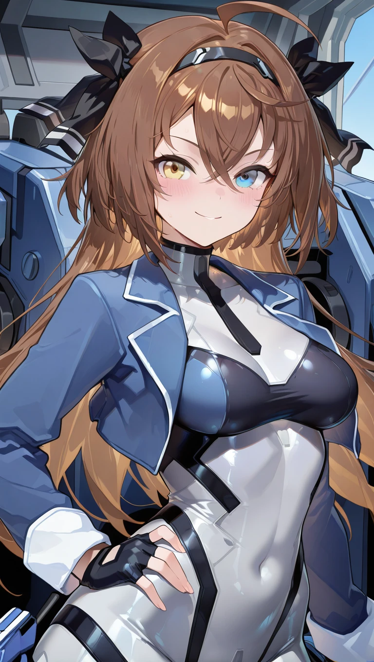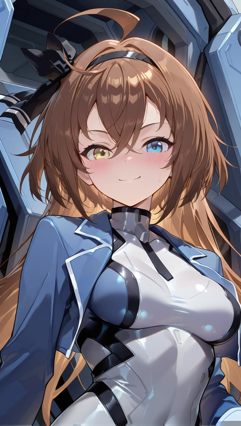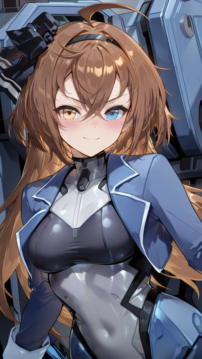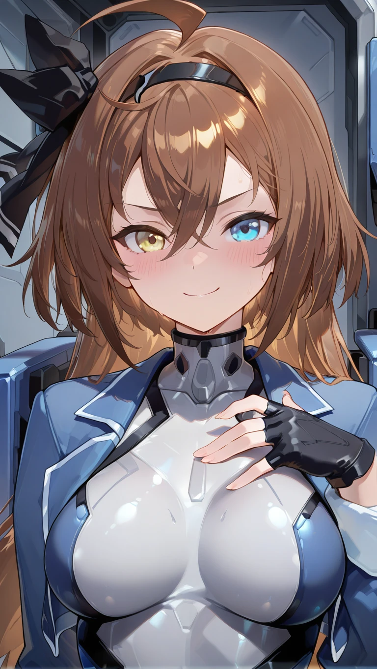 ahoge,brown hair,long hair,hairband,hair between eyes,blue eyes,heterochromia,yellow eyes