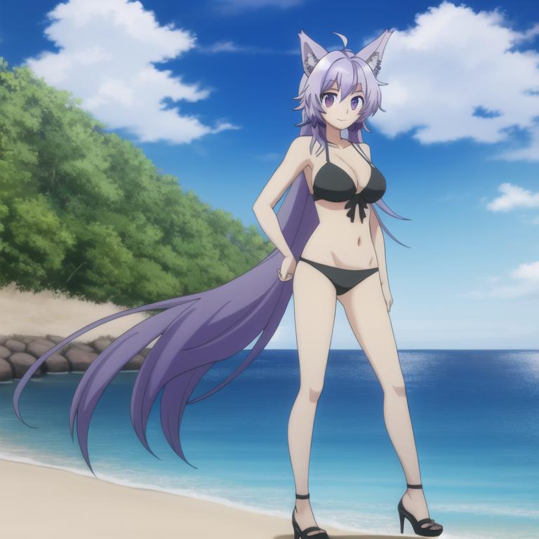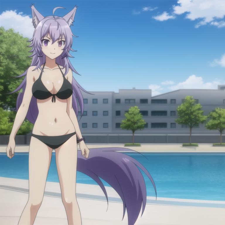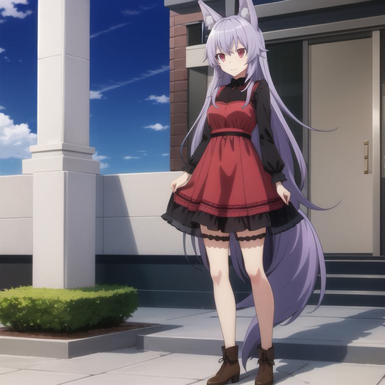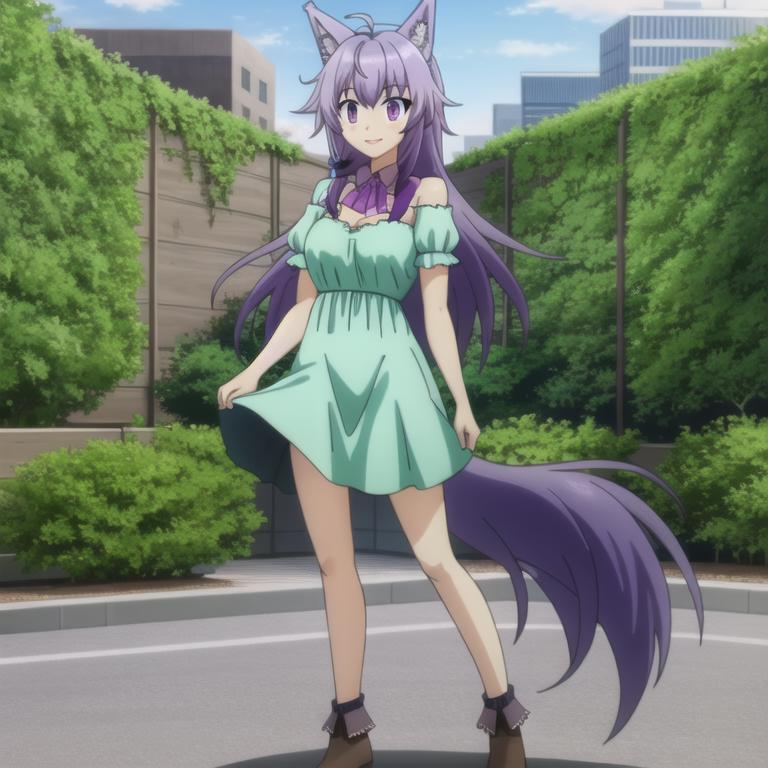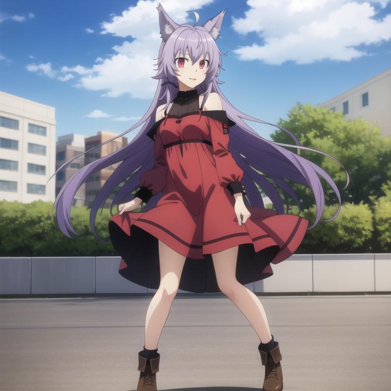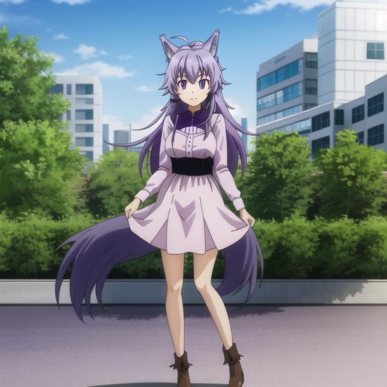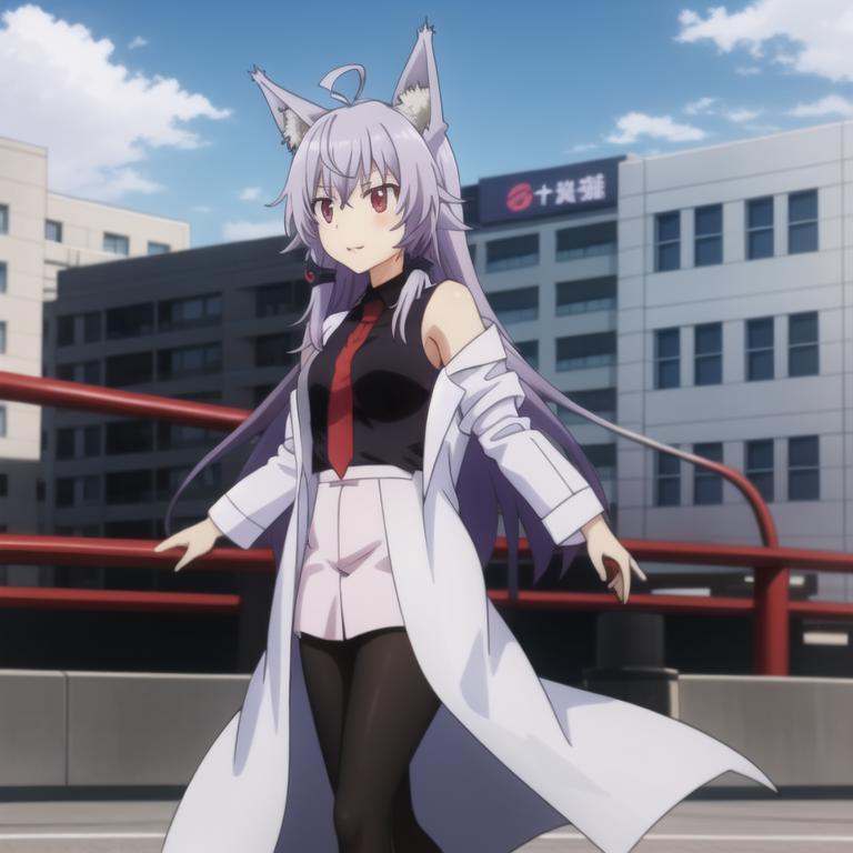 Trigger Word: agastya-wolfbete, wolf ears, purple hair, wolf tail, black shirt labcoat necktie