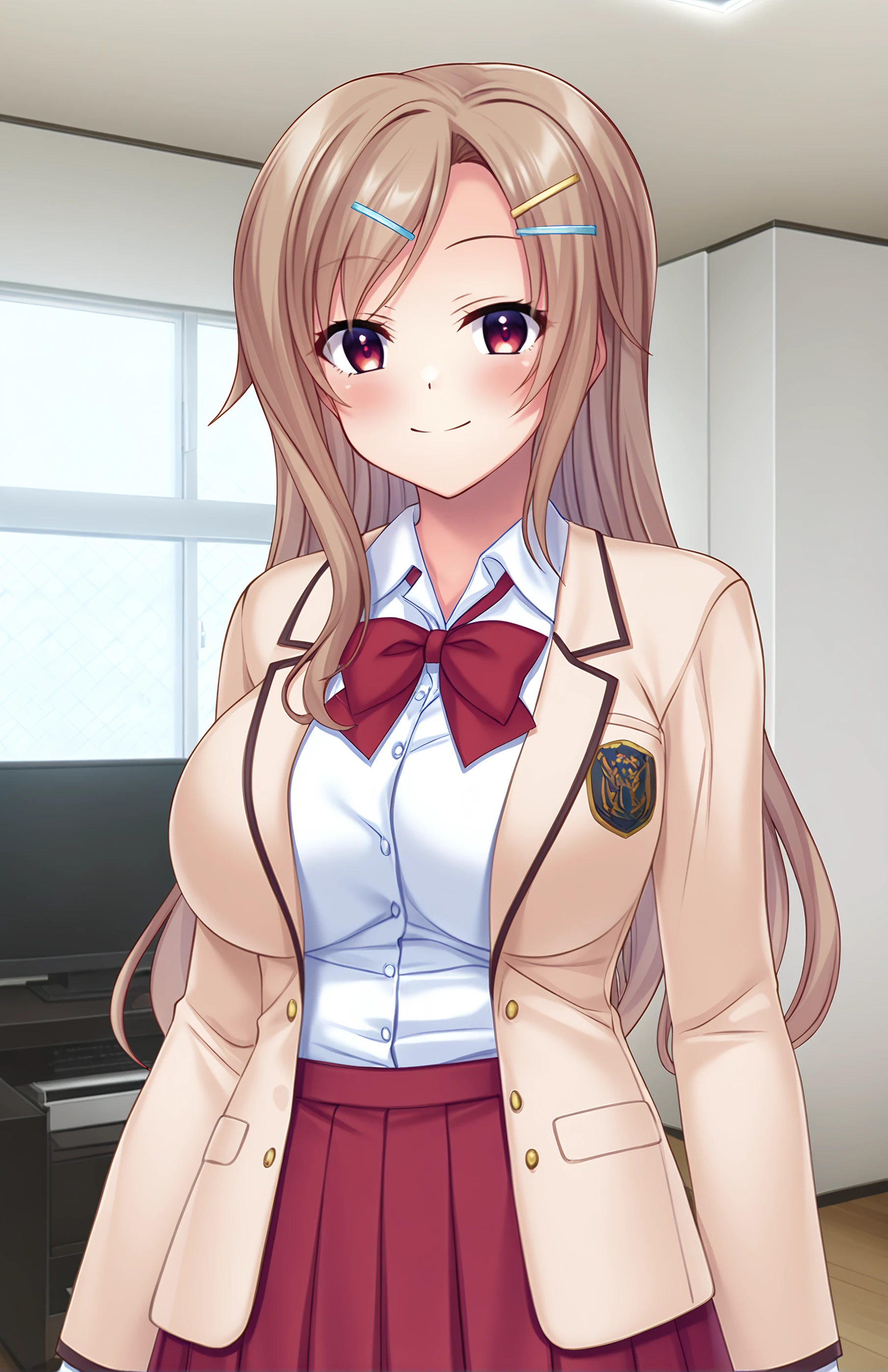 SakuraiMarin, long hair, , bangs, skirt, , brown hair, shirt, hair ornament, long sleeves, bow, school uniform, jacket, white shirt, pleated skirt, , hairclip, collared shirt, bowtie, red bow, dress shirt, red skirt, blazer, red bowtie, brown jacket