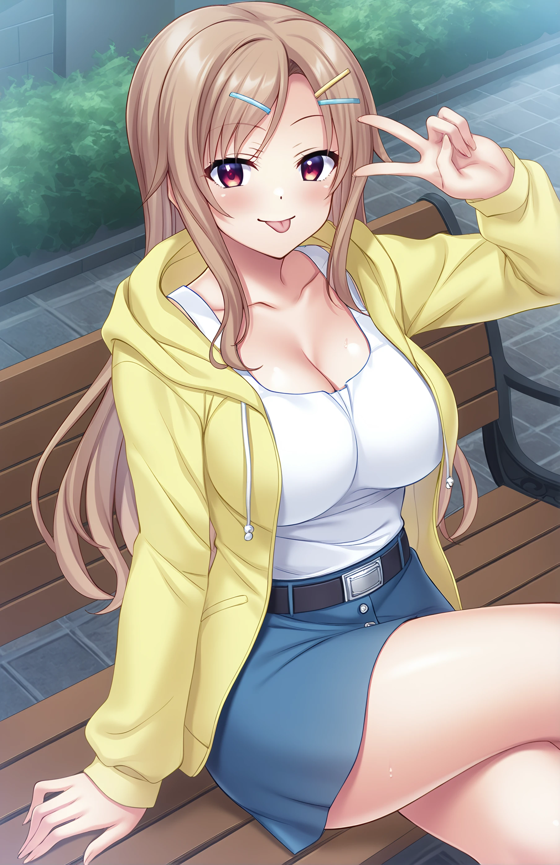 SakuraiMarin, long hair, , bangs, skirt, , brown hair, shirt, hair ornament, long sleeves, cleavage, collarbone, jacket, white shirt, , hairclip, belt, hood, miniskirt, open jacket, blue skirt, hood down, hooded jacket, yellow jacket