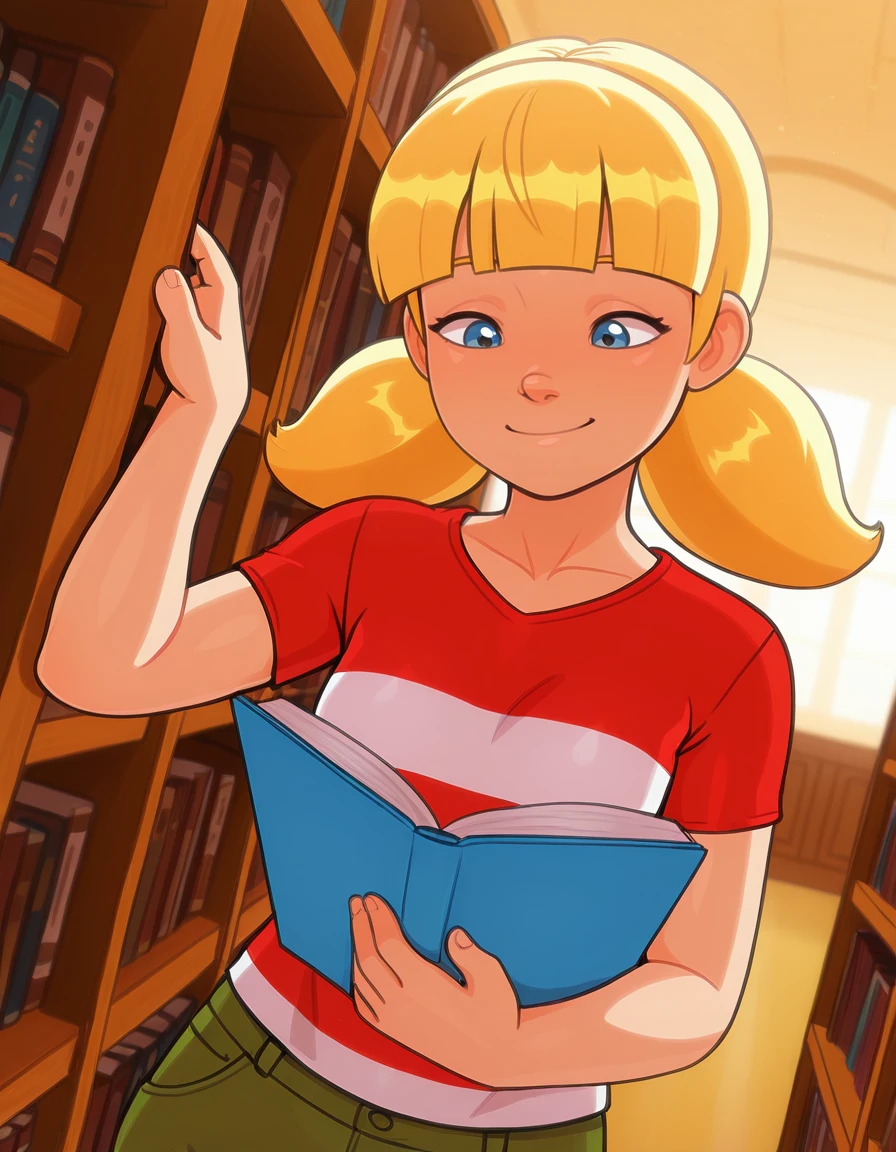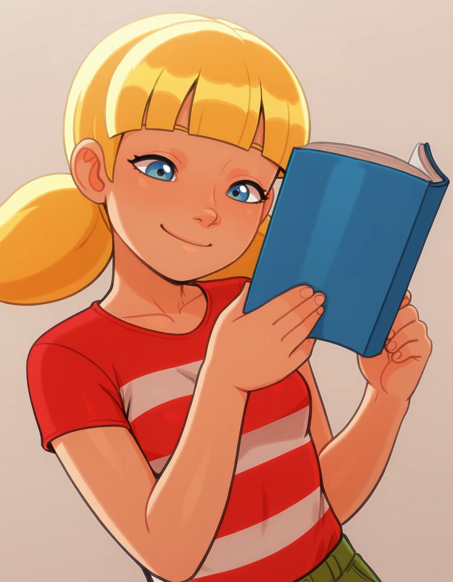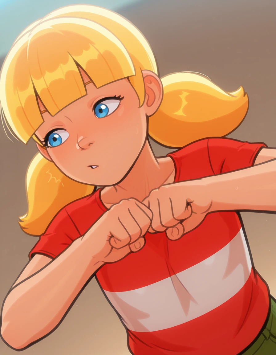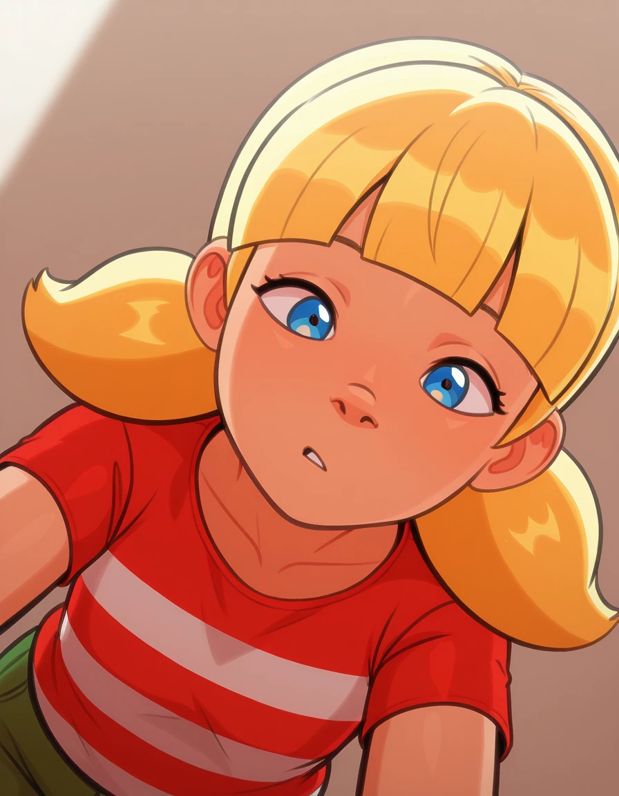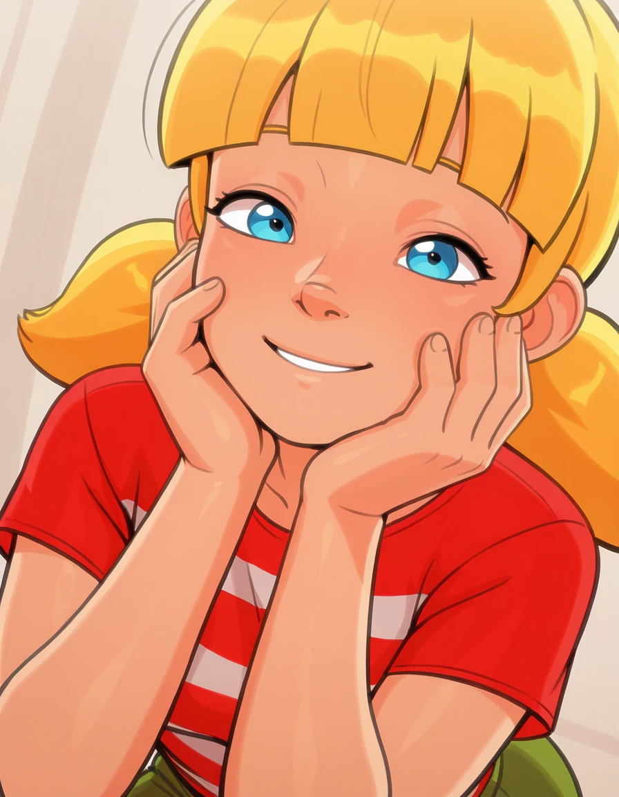 -ponpupenny,1girl,solo,blonde hair, blunt bangs, blue eyes,low twintails,Red shirt, white striped shirt, short sleeves,green pants