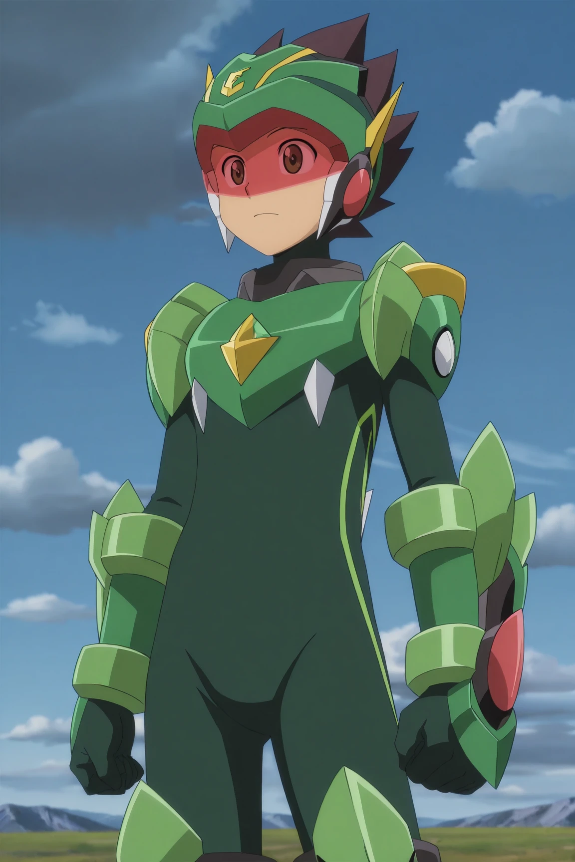 - force_da, brown hair, brown eyes, green helmet, green bodysuit, green gloves, tinted eyewear, green boots