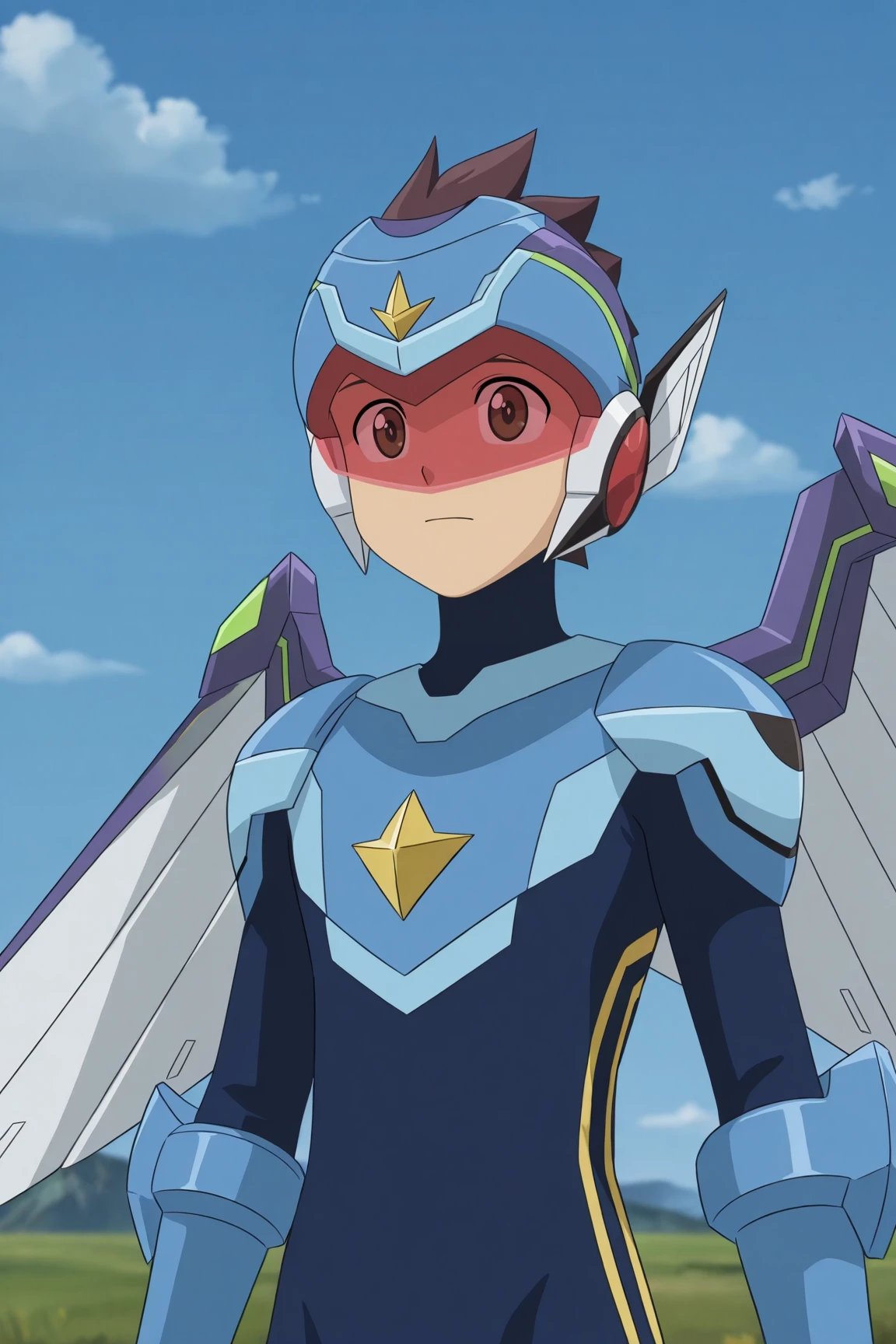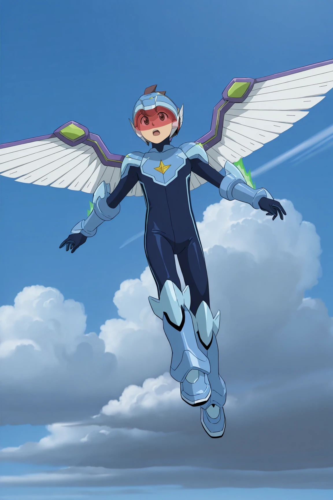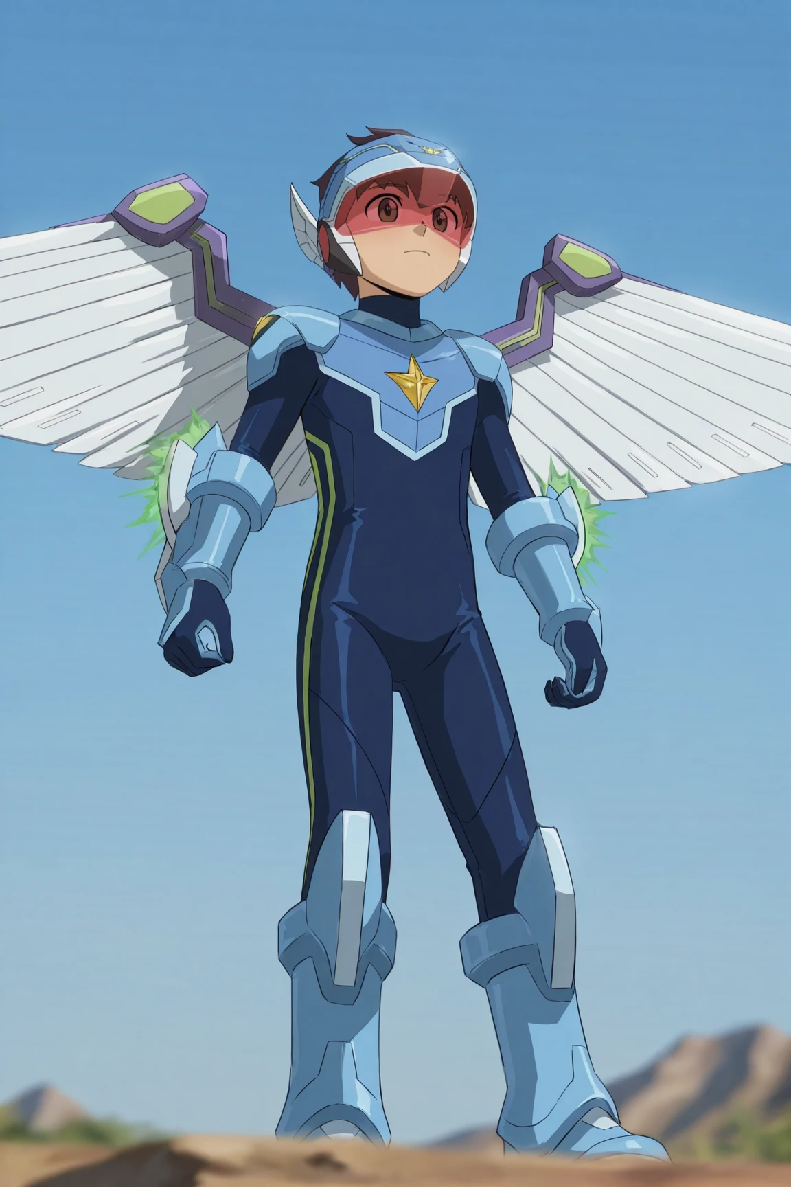 - force_pega, brown hair, brown eyes, light blue helmet, two-tone bodysuit, light blue gloves, light blue boots, tinted eyewear, mechanical wings,