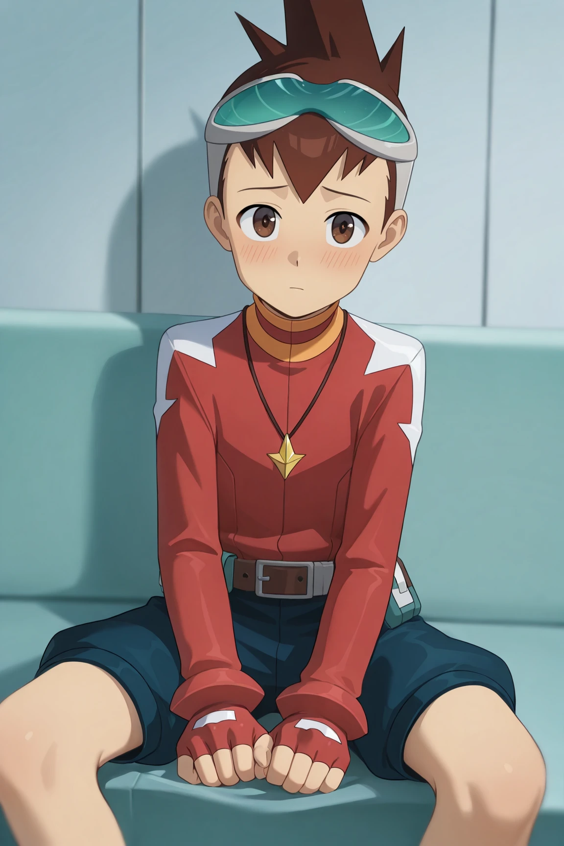 -red jacket, necklace, red fingerless gloves, goggles on head, blue shorts, blue shorts, red knee boots