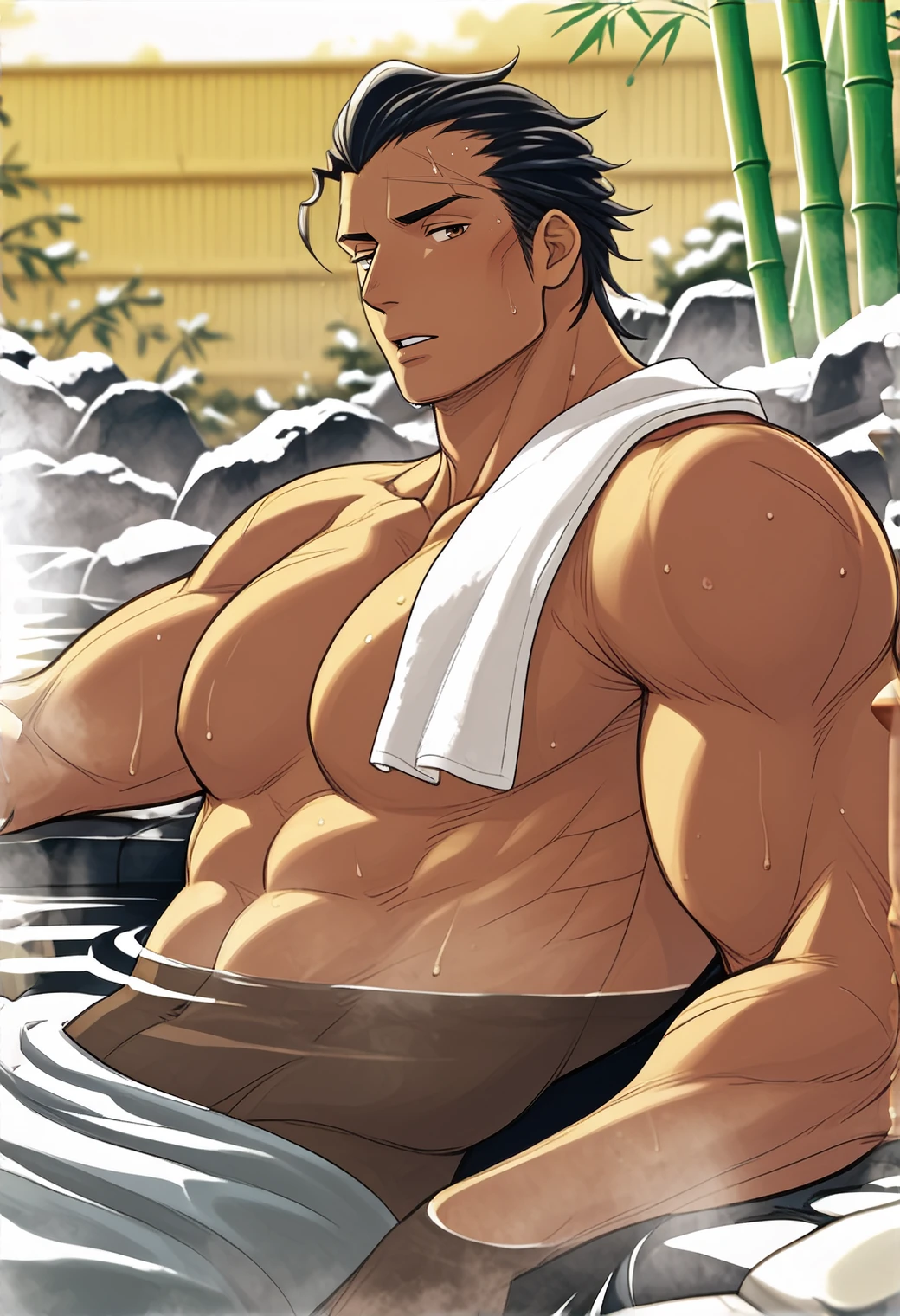 01b3r1c,black hair,short hair,hair slicked back,sideburns,single bang,brown eyes,scar on forehead,tan,