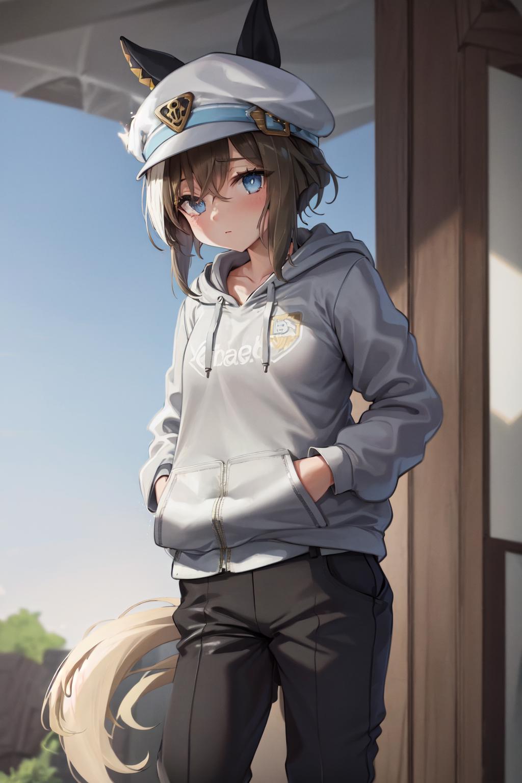 1girl, hair between eyes, short hair, hat, tail, brown hair, green eyes, simple background, solo, horse ears, streaked hair, animal ears, bangs, horse girl, white headwear, black hair, medium hair, white hair, horse tail, blue eyes, multicolored hair, two-tone hair, ears through headwear