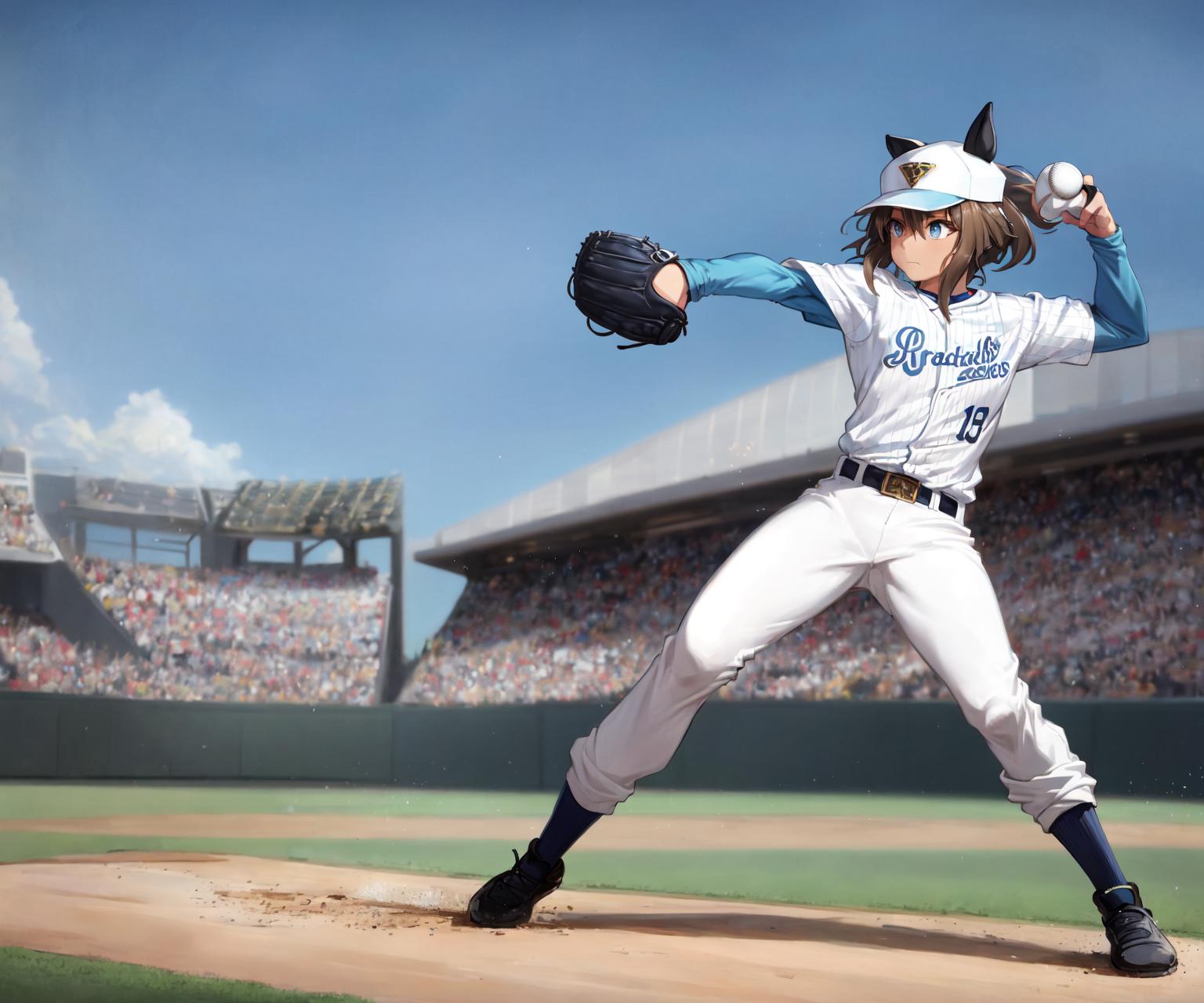alternate costume, white headwear, short over long sleeves, white shirt, sportswear, baseball uniform, belt, white pants, socks, shoes, black footwear