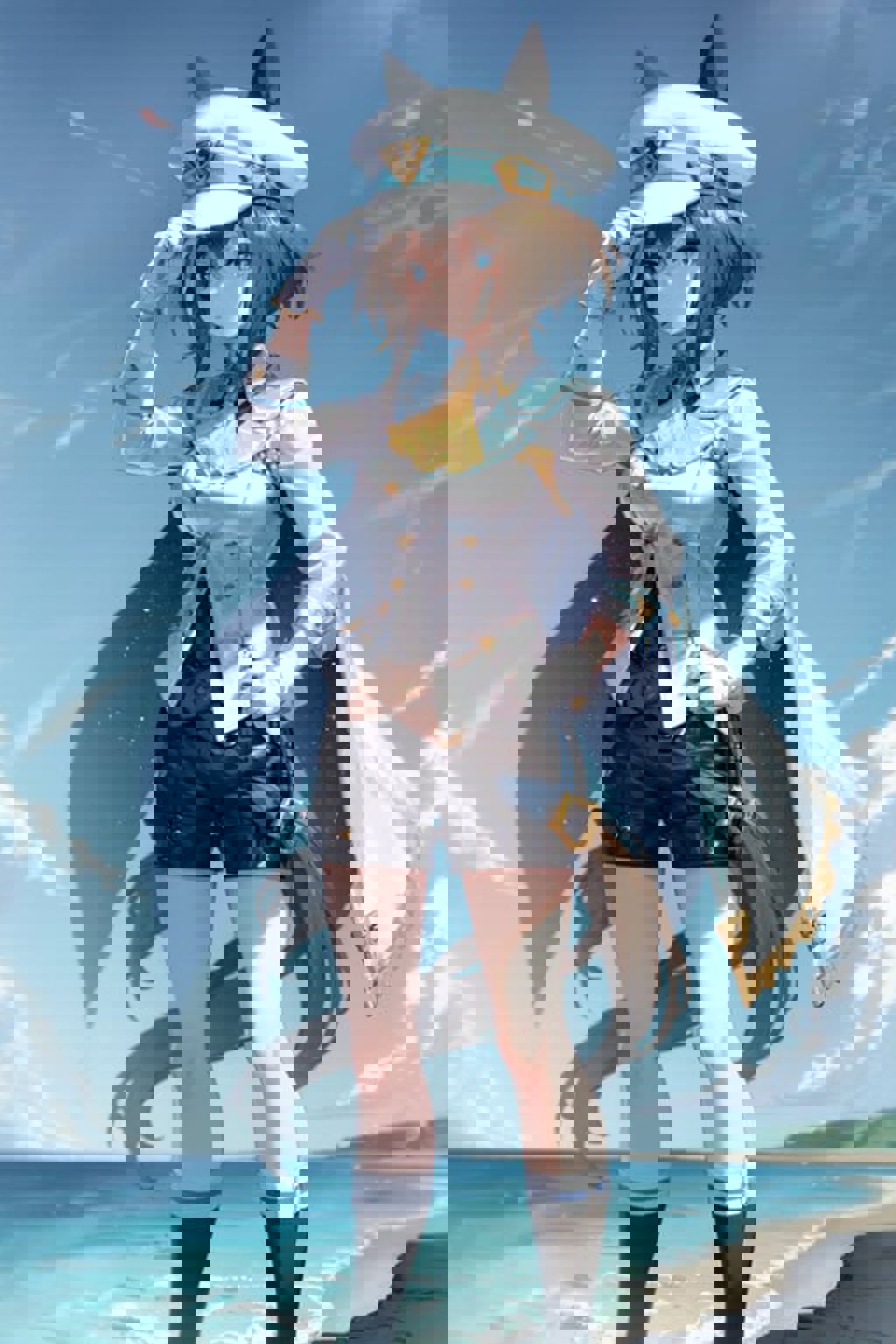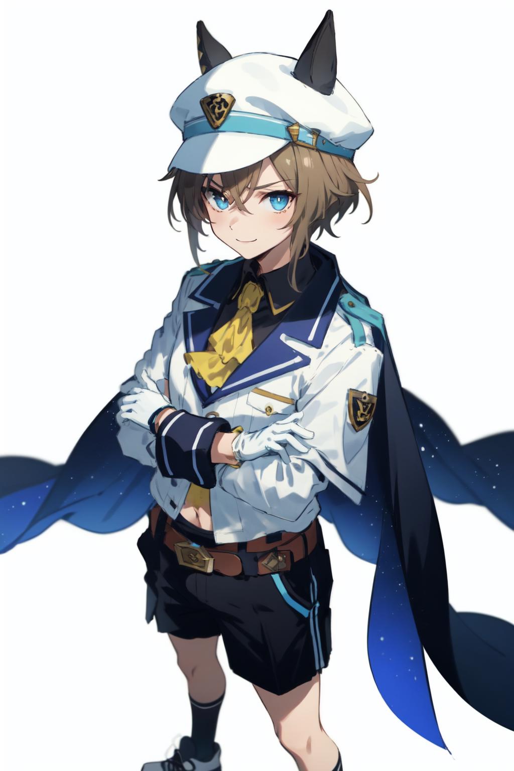 long sleeves, cape, sailor collar, white shirt, yellow ascot, white jacket, white gloves, belt, black shorts, black socks, shoes, white footwear