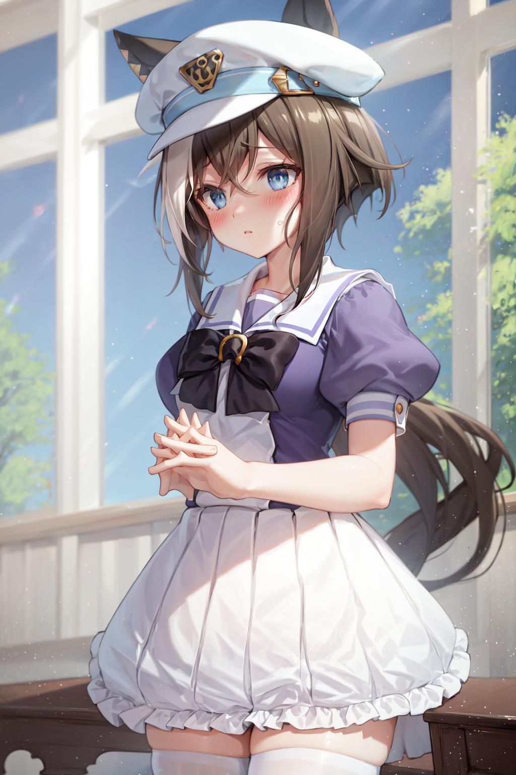 tracen school uniform, summer uniform, serafuku, puffy short sleeves, bowtie, horseshoe ornament, sailor collar, sailor shirt, frills, white skirt, purple shirt, miniskirt, zettai ryouiki, white thighhighs, brown footwear, shoes