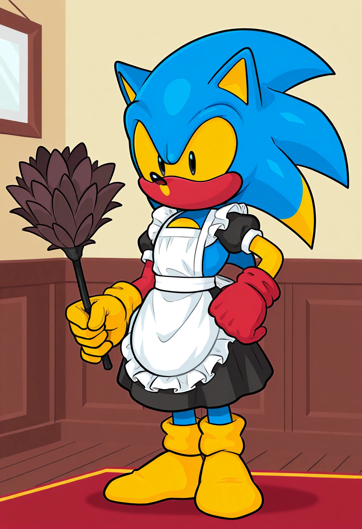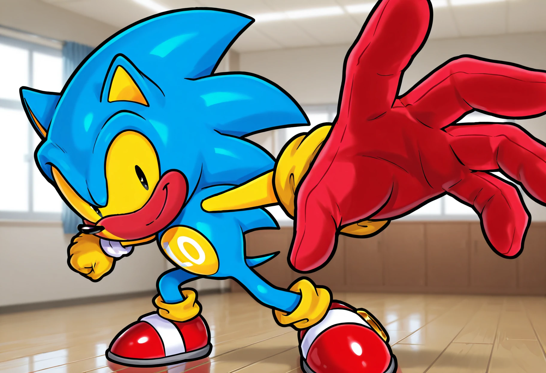 Obama sonic, anthro hedgehog, black eyes, blue body fur, yellow and red gloves, yellow glove, red glove, yellow skin, yellow sclera, red muzzle fur, red and yellow arms, yellow socks