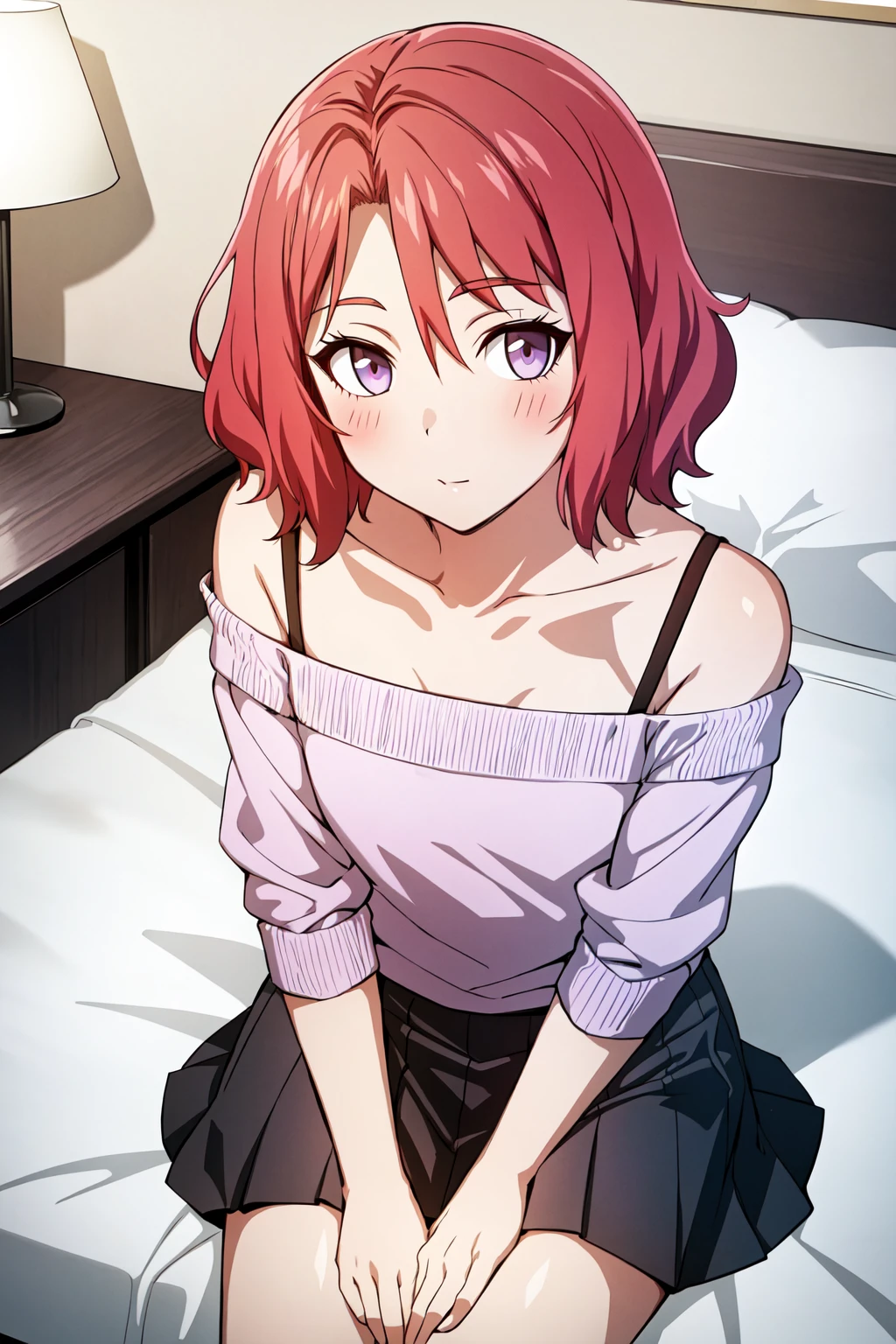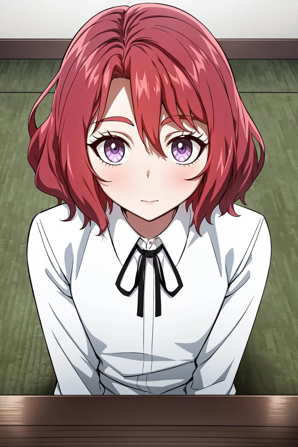 aselle, 1girl, purple eyes, red hair, short hair, flat chest, solo, looking at viewer, scared, school uniform, indoors, closeup,