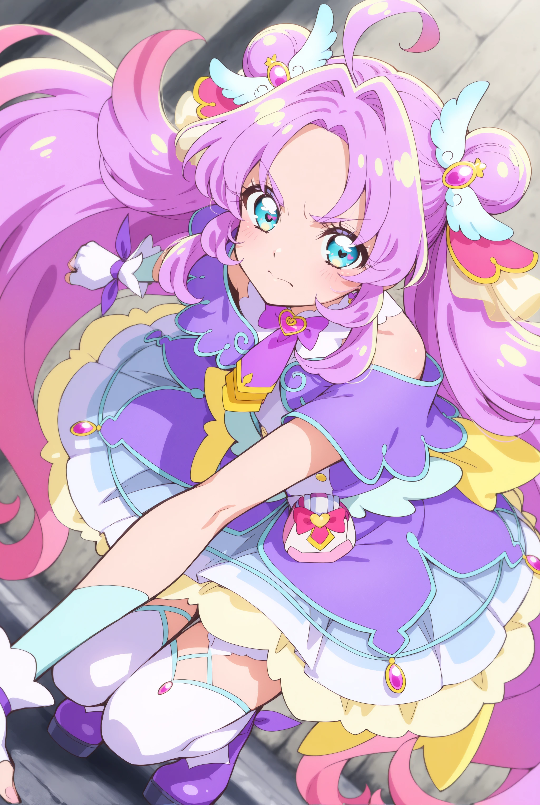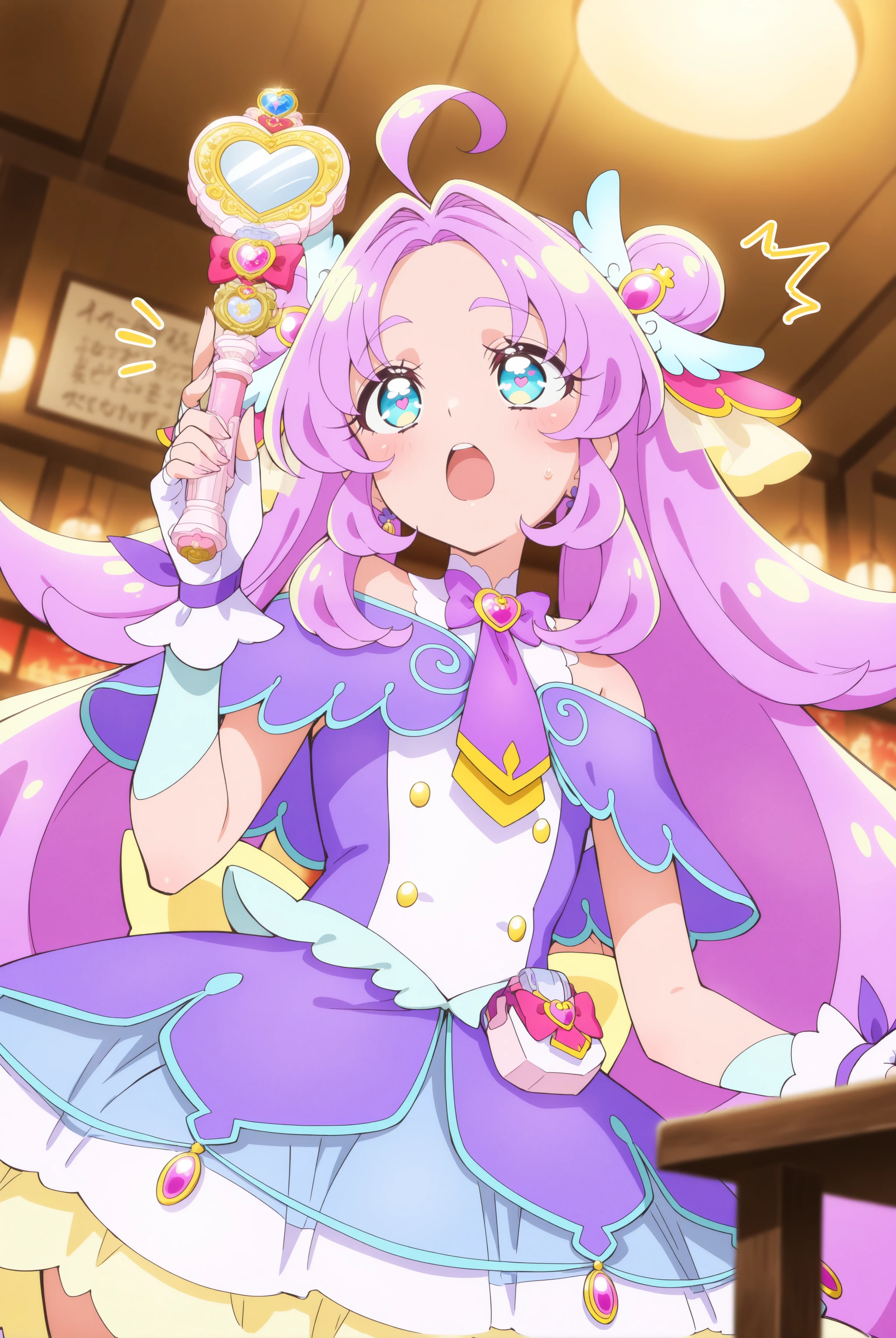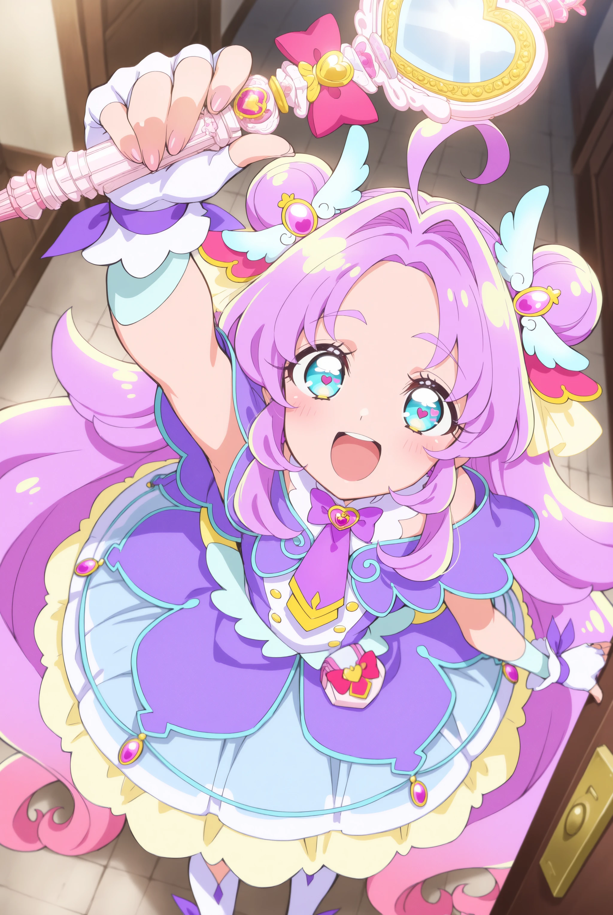 顔…magical girl, very long hair, purple hair, pink hair, ahoge, gradient hair, multicolored hair, double bun, hair intakes, blue eyes, heart in eye,