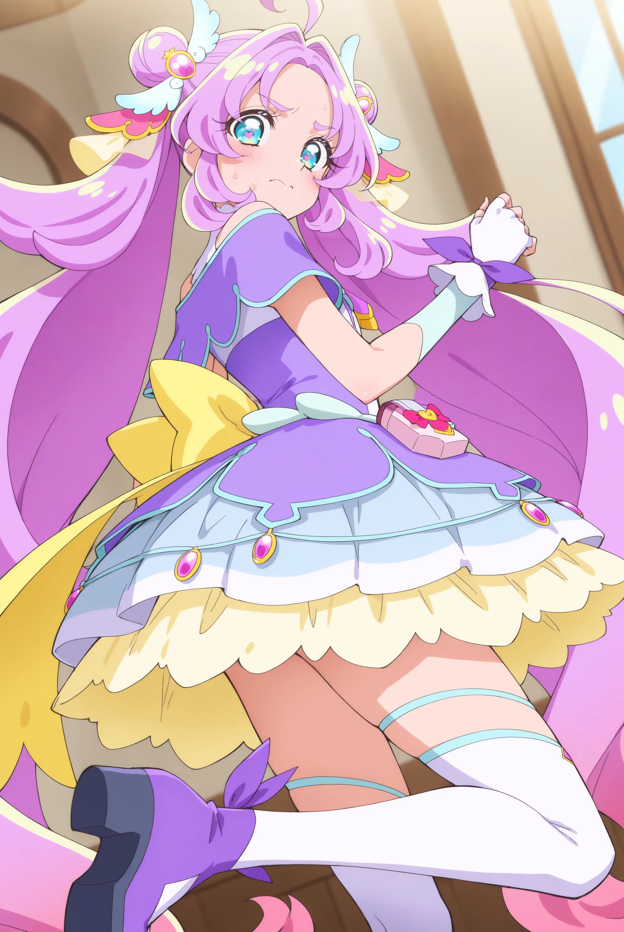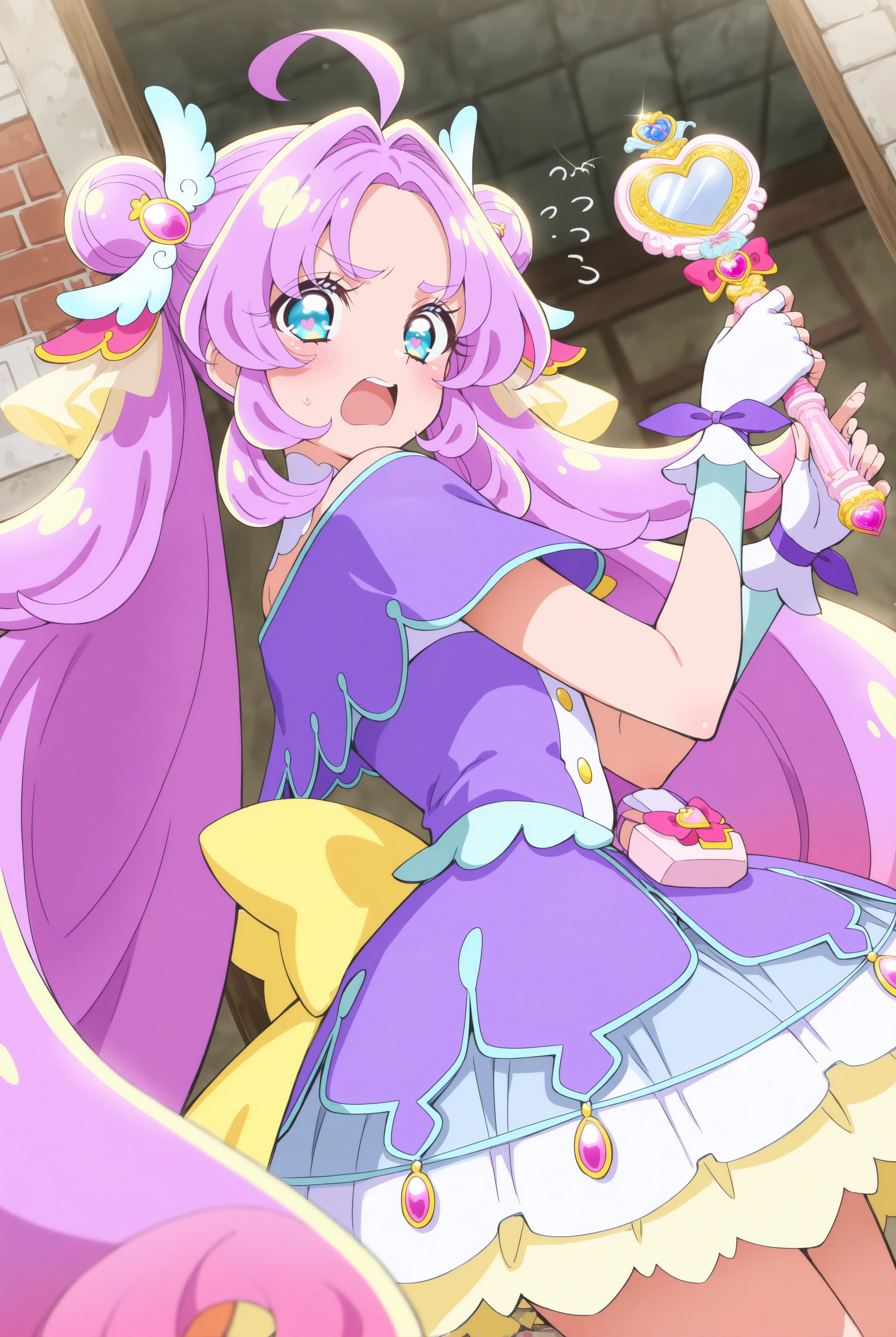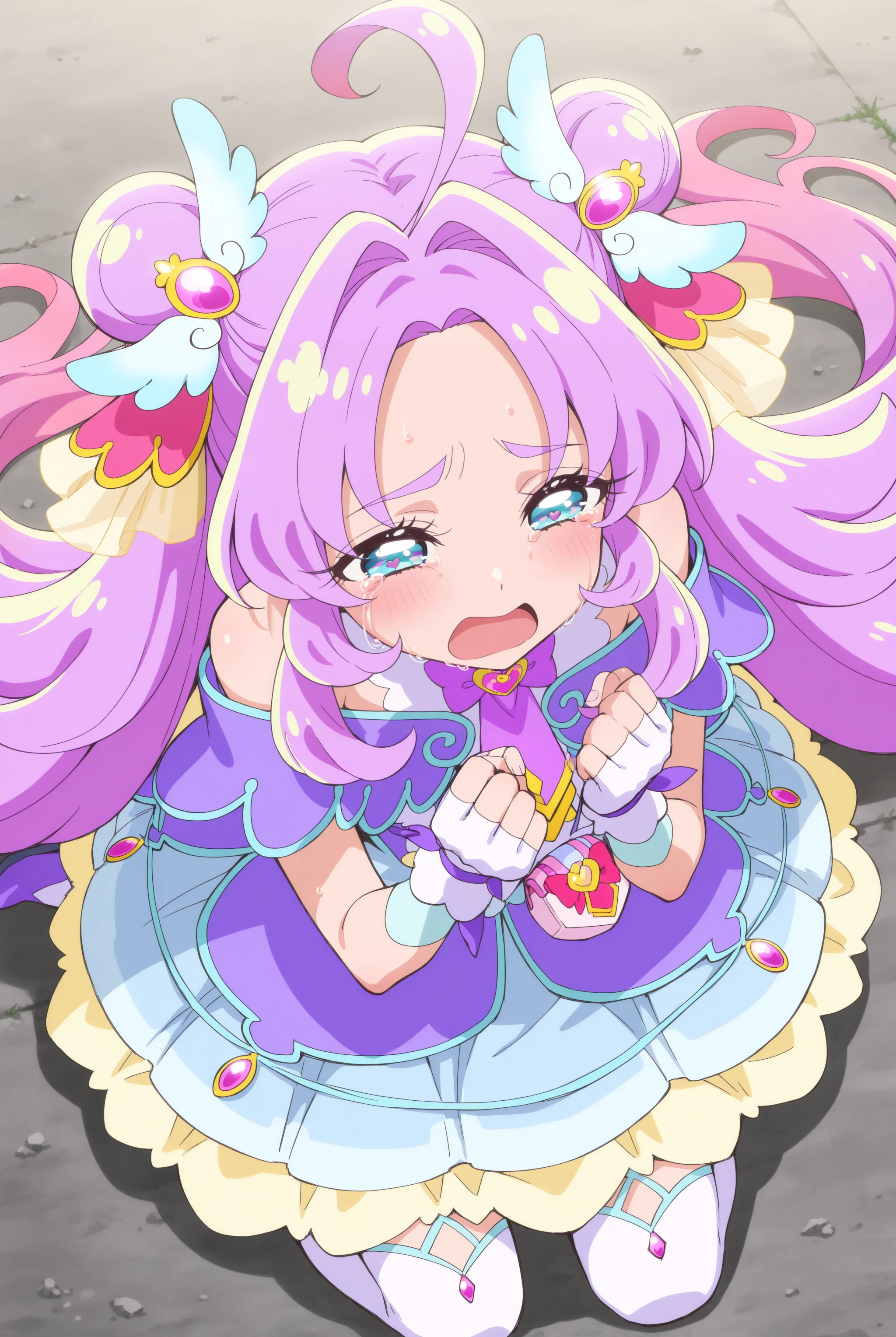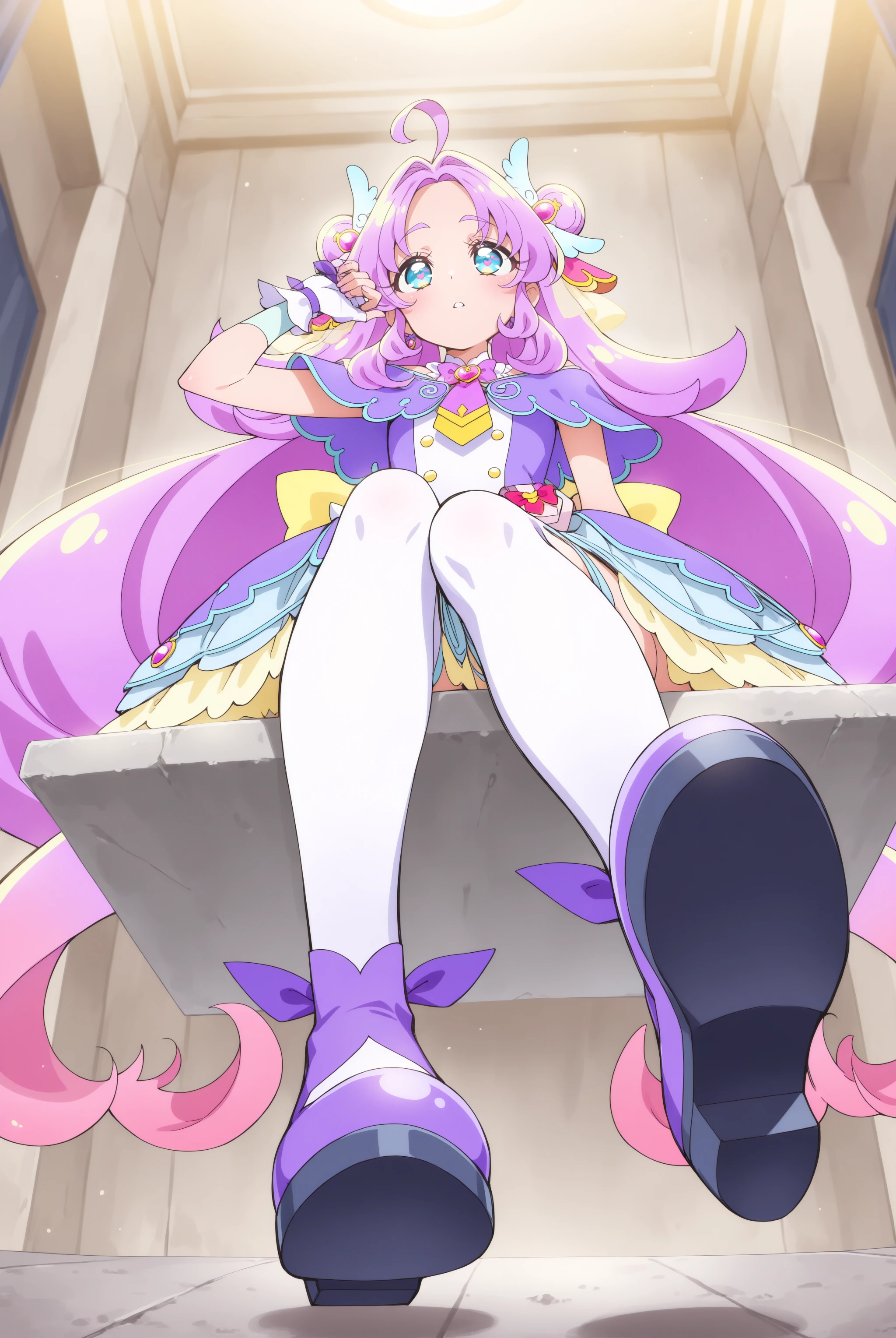 顔…magical girl, very long hair, purple hair, pink hair, ahoge, gradient hair, multicolored hair, double bun, hair intakes, blue eyes, heart in eye,