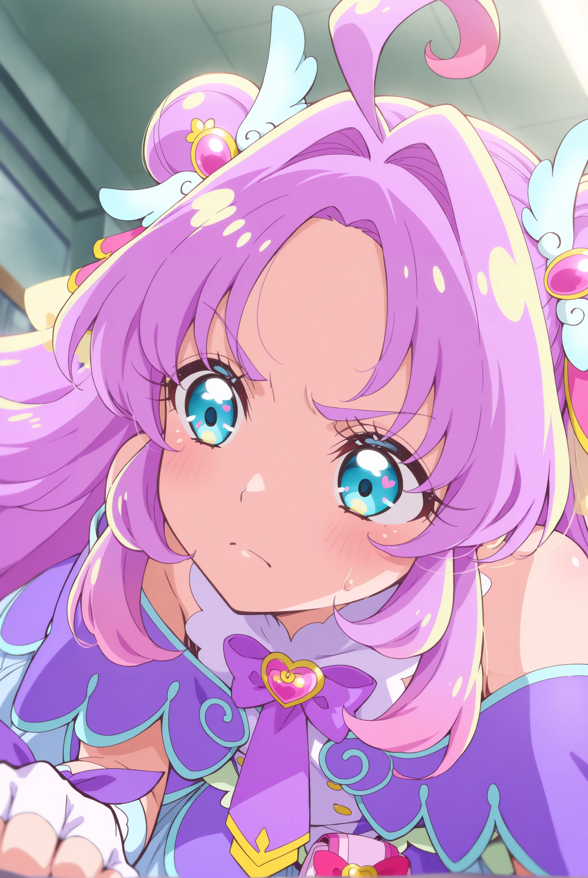 Face...magical girl, very long hair, purple hair, pink hair, ahoge, gradient hair, multicolored hair, double bun, hair intakes, blue eyes, heart in eye,