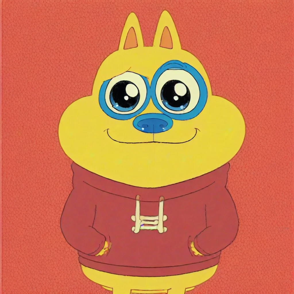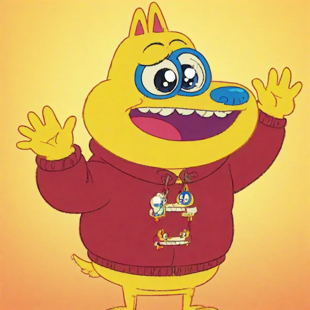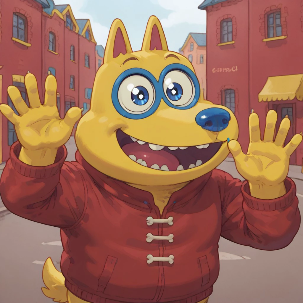 Max, Yellow dog, red jacket with a bone on it, one blue spot on right eye, blue nose, male, solo, no humans