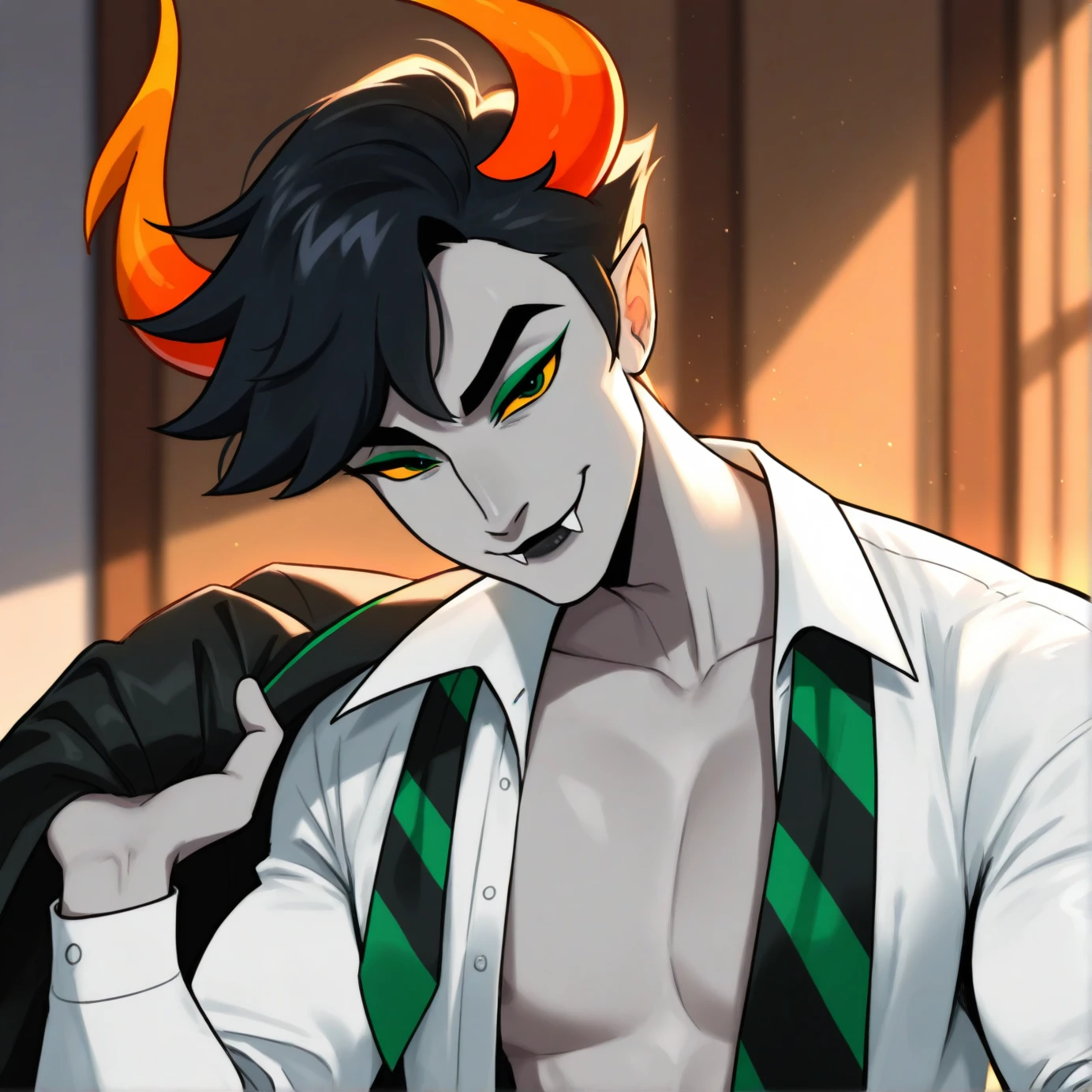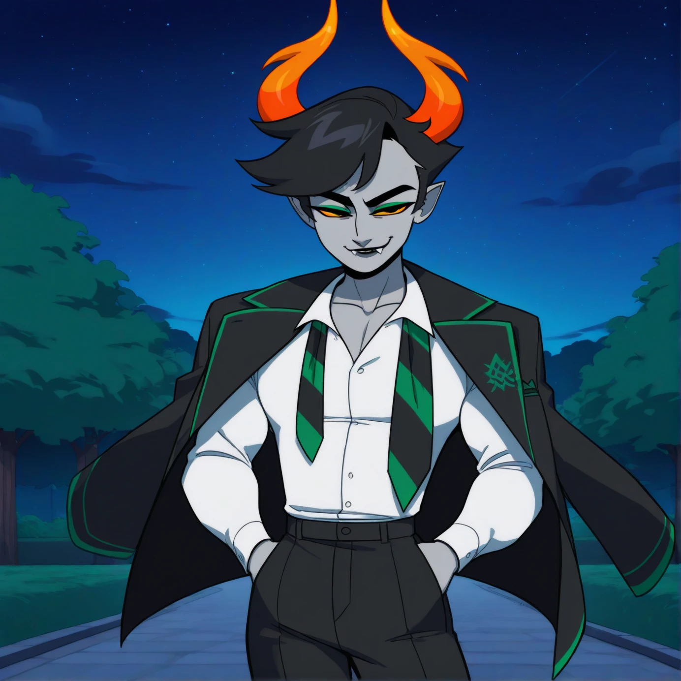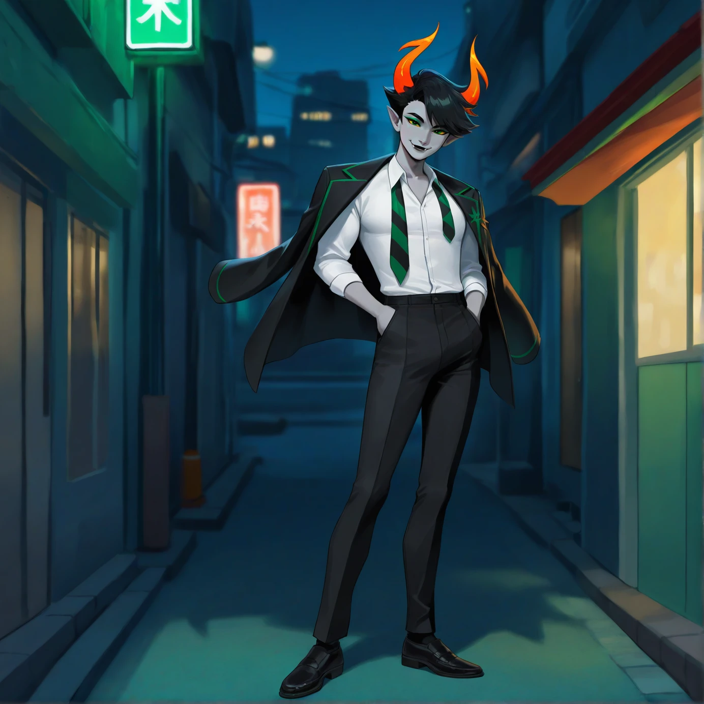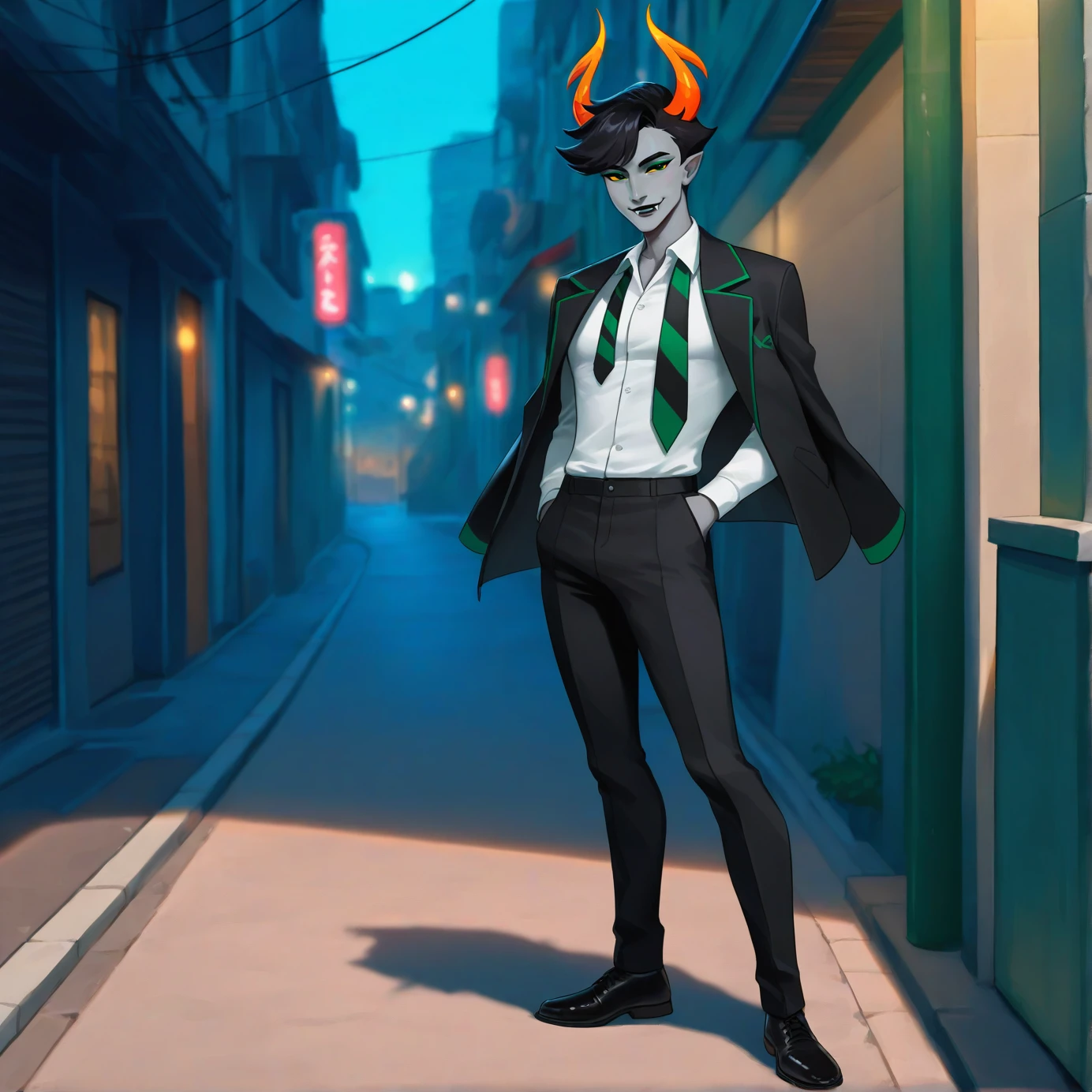 Secondary tags: black hair, short hair, horns, orange horns, green lips, fangs, green eyelashes, green eyes, colored sclera, yellow sclera, pointy ears, striped necktie, untied necktie, white shirt, black jacket, black jacket, green accents, jacket on shoulders, symbol on jacket, napkin in pocket, red napkin, black pants, black shoes