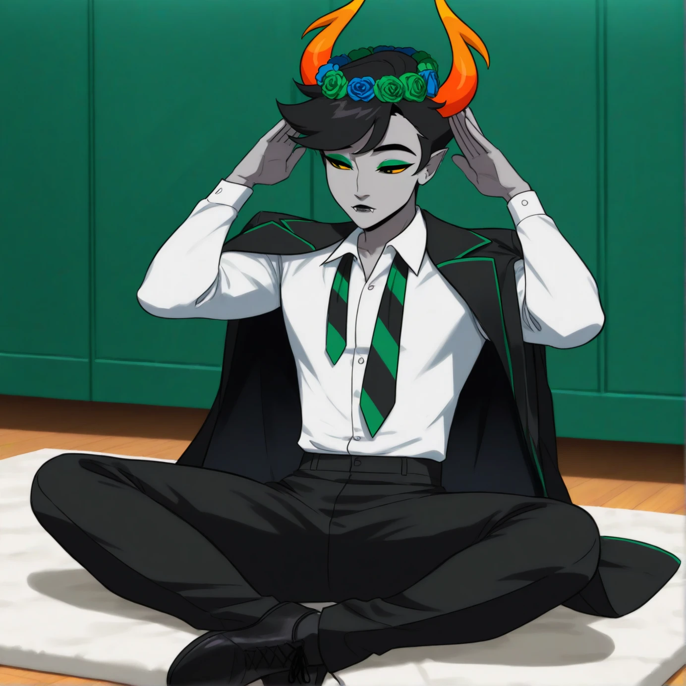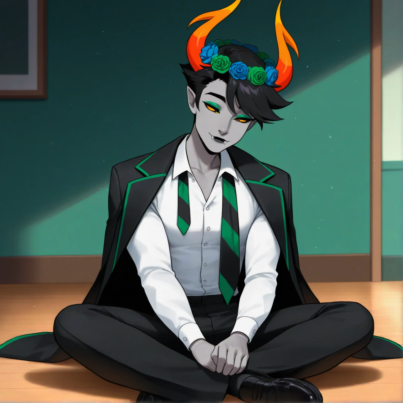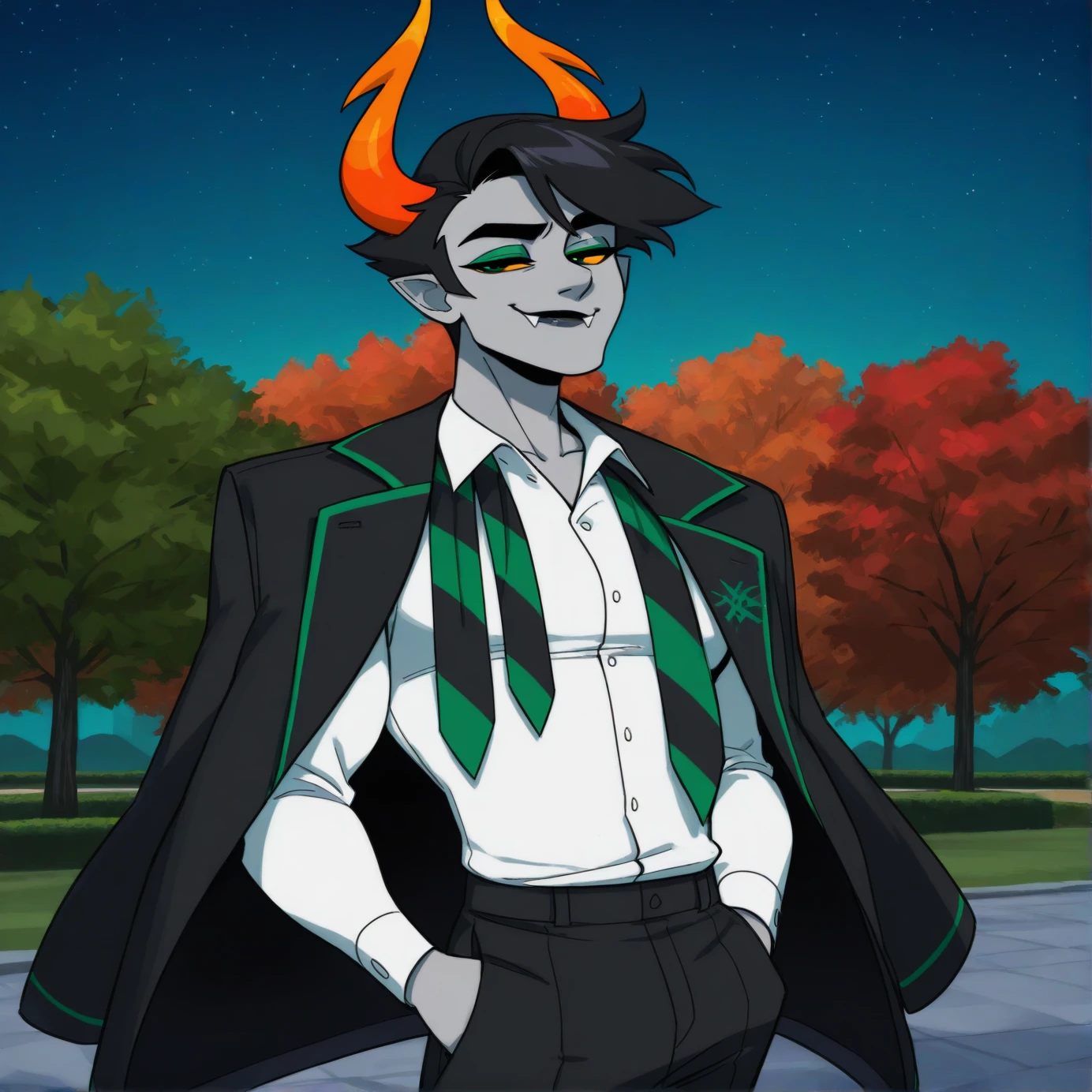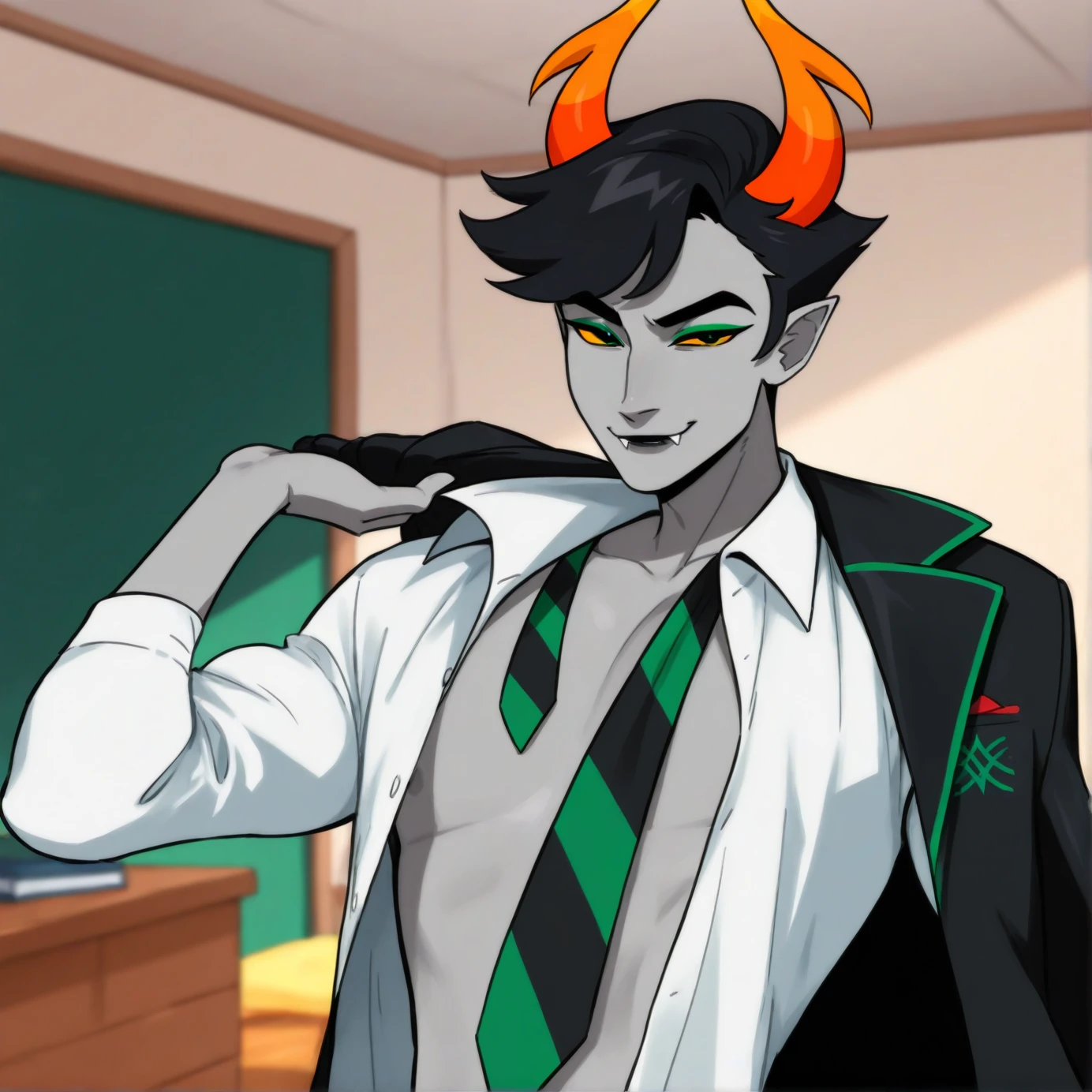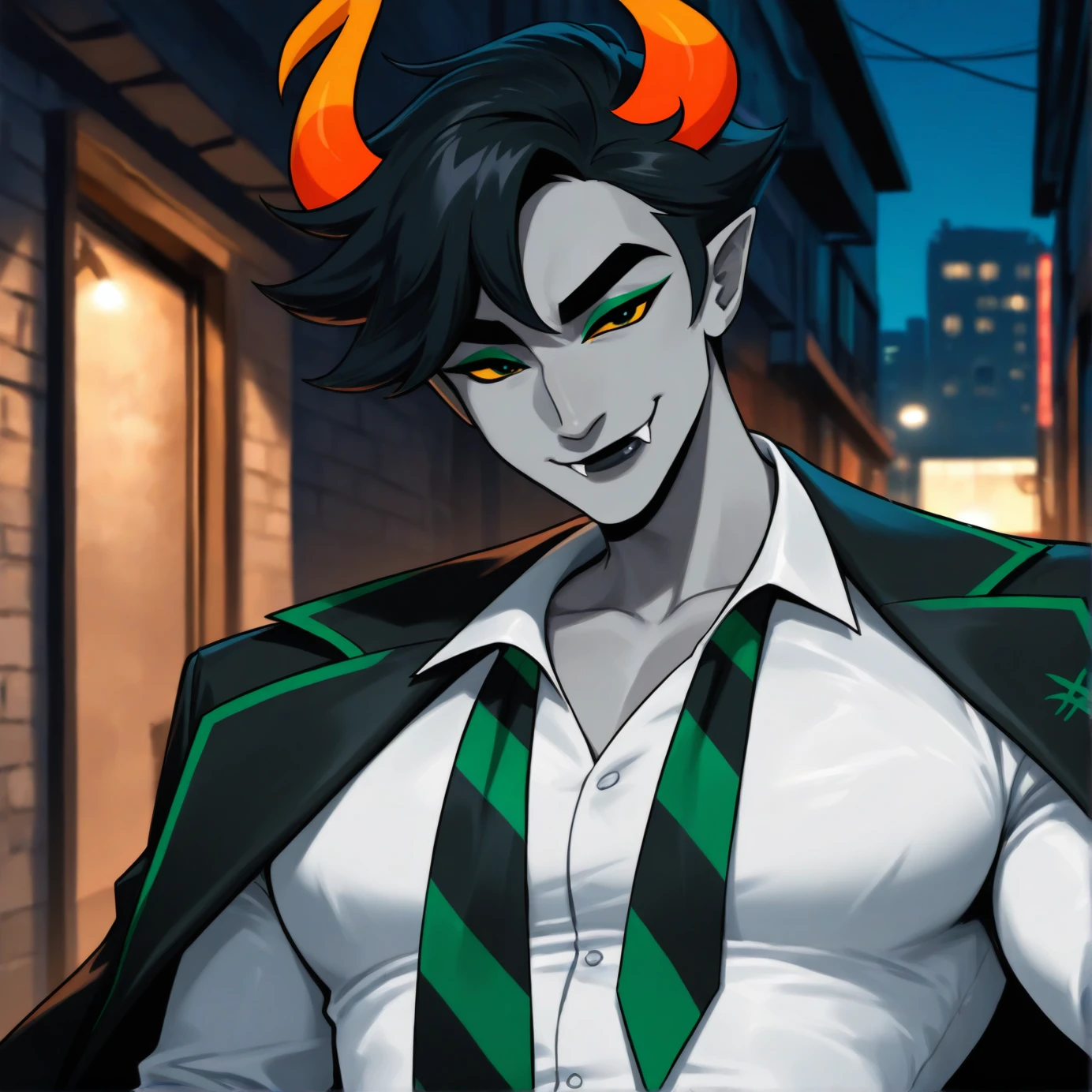 Secondary tags: black hair, short hair, horns, orange horns, green lips, fangs, green eyelashes, green eyes, colored sclera, yellow sclera, pointy ears, striped necktie, untied necktie, white shirt, black jacket, black jacket, green accents, jacket on shoulders, symbol on jacket, napkin in pocket, red napkin, black pants, black shoes