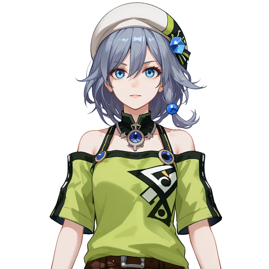 fu hua, fu hua cgver, bangs, blue eyes, hair between eyes, grey hair, blue hair, hair ornament, hat, beret, green shirt, short sleeves, bare shoulders