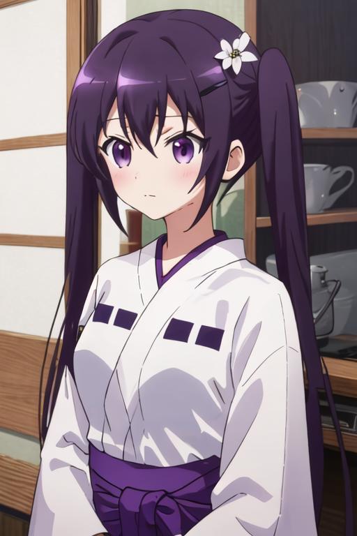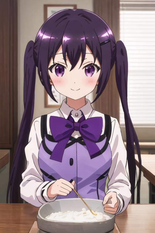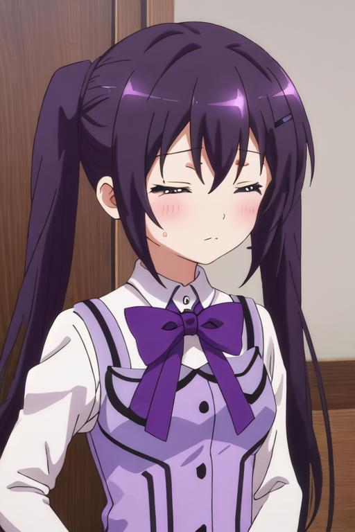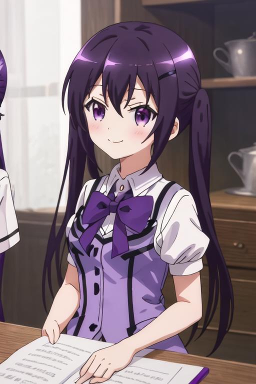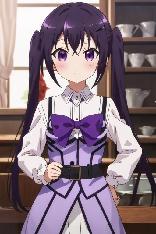 The trigger word is tedeza_rize_istheorderarabbit, and the recommended tags are best quality, masterpiece, highres, solo, {tedeza_rize_istheorderarabbit:1.15}, purple_hair, long_hair, twintails, purple_eyes, bangs, hair_ornament, blush, hairclip, hair_between_eyes, closed_mouth, indoors.