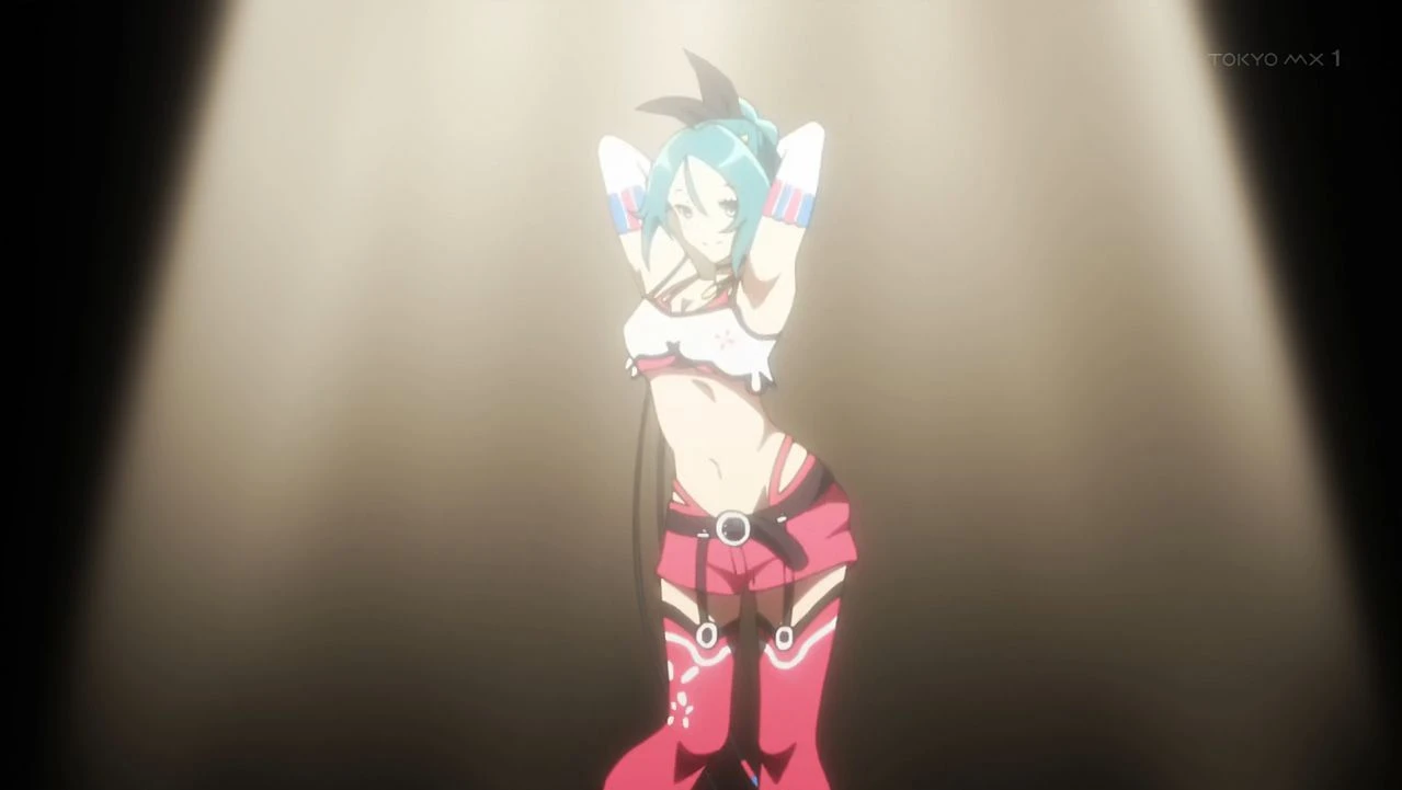 1girl, farun_(Conception_2), blue eyes, short hair, high_ponytail, turquoise hair, pointy ears, earrings, thighhighs, pink_short_shorts, pink_highleg_panties, pink_thighhighs, jewelry, necklace, black ribbon with blue and pink stripes, bracelets, choker, garter straps, navel, detached_sleeves, midriff, choker, belt