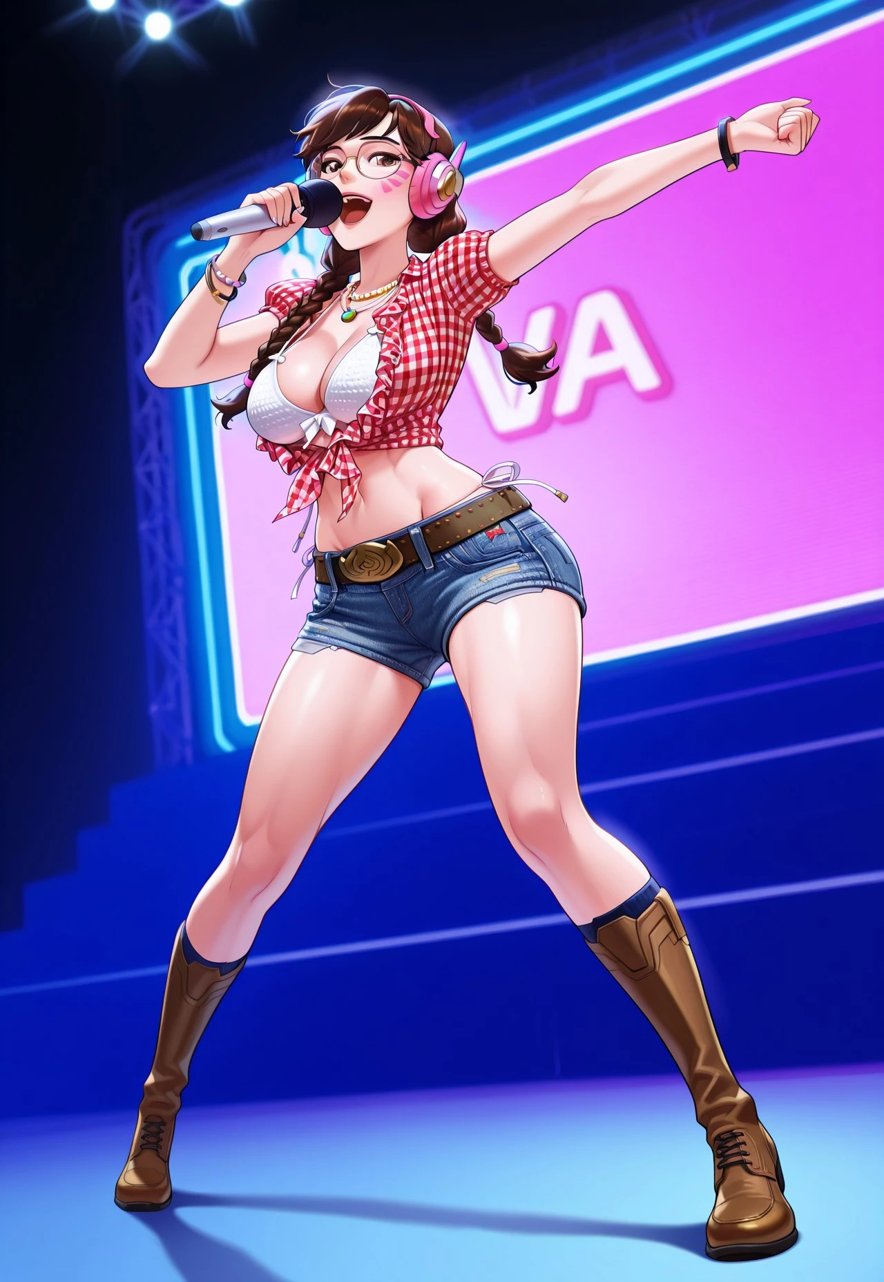 Red gingham check blouse, Crochet bikini top, Ruffled sleeves, frayed hem denim shorts, Western belt, Layered necklaces, bracelets,