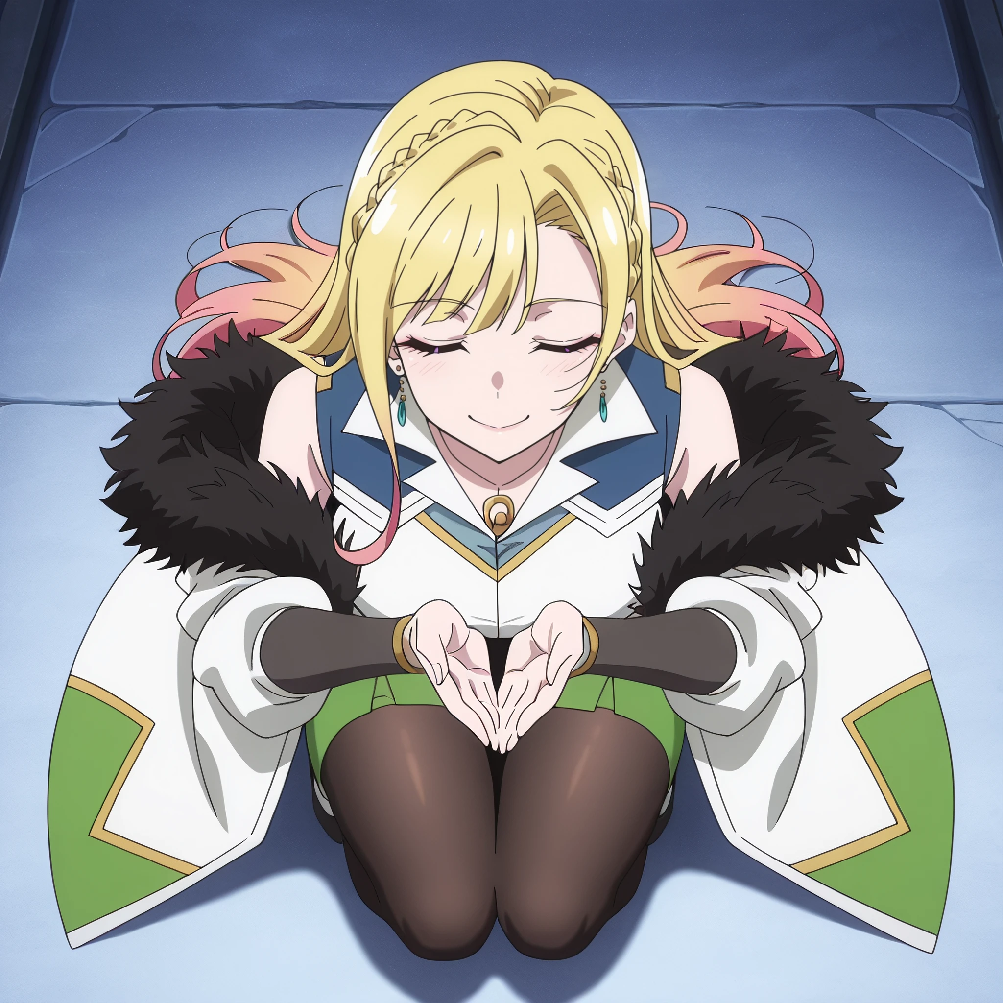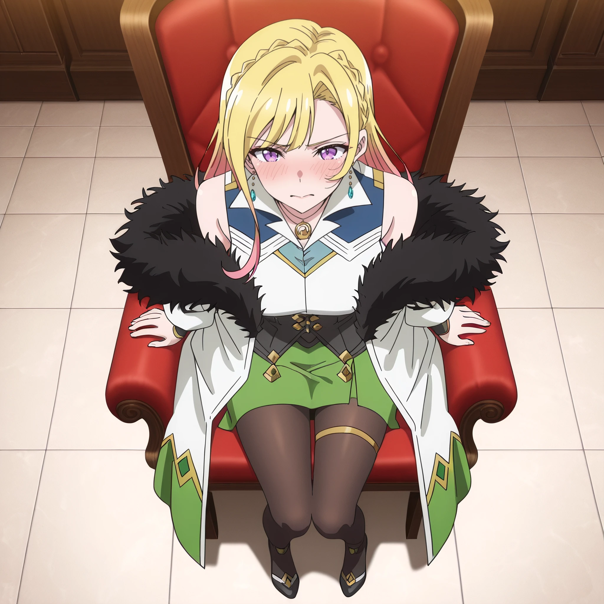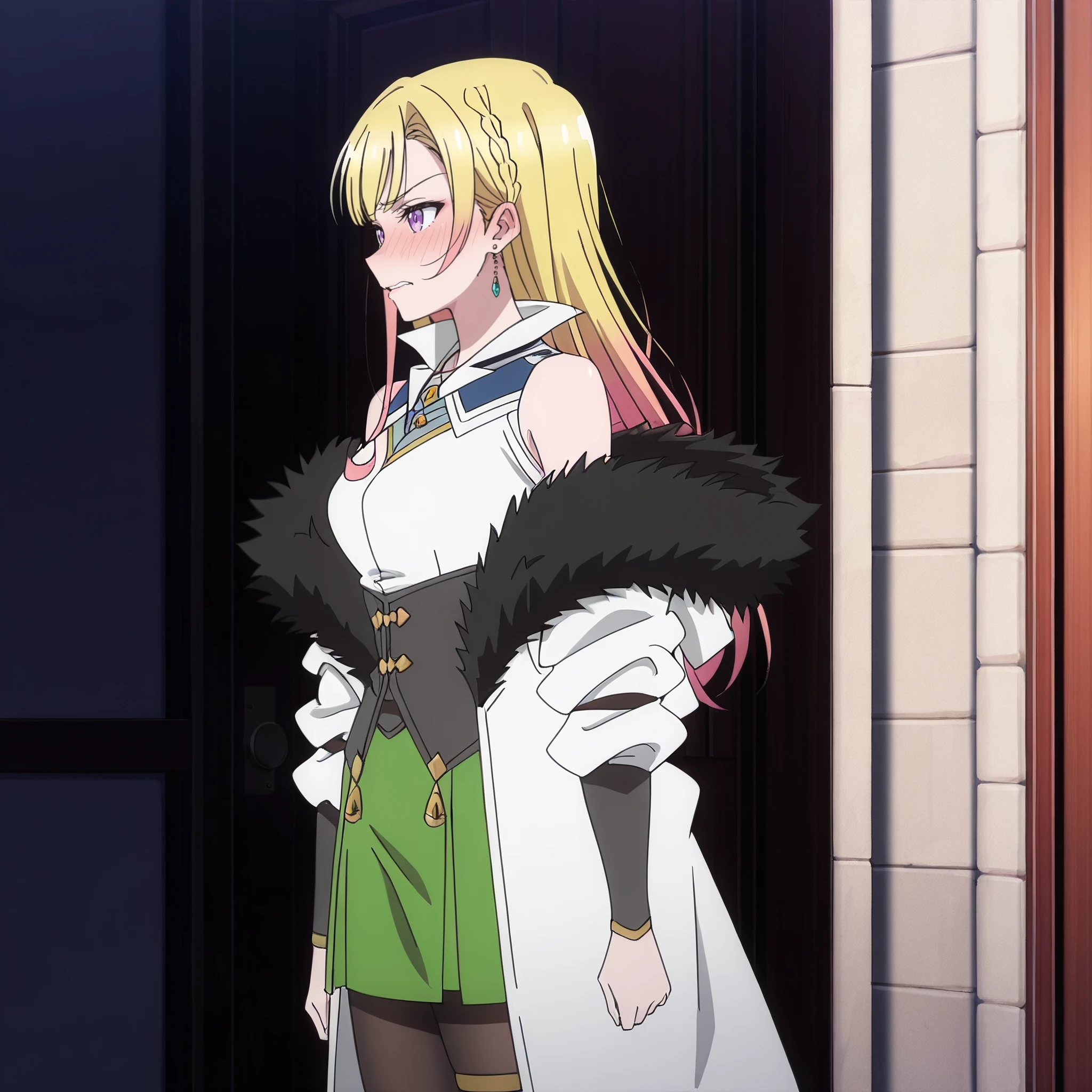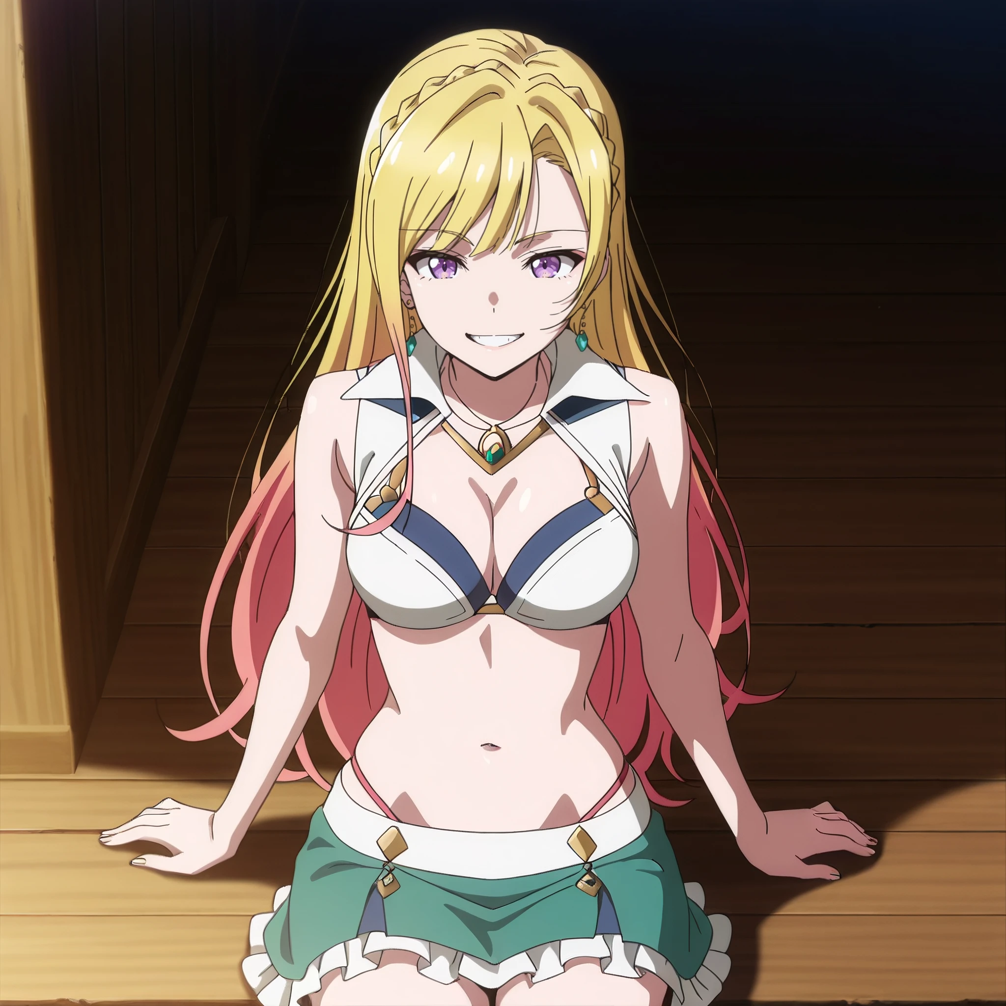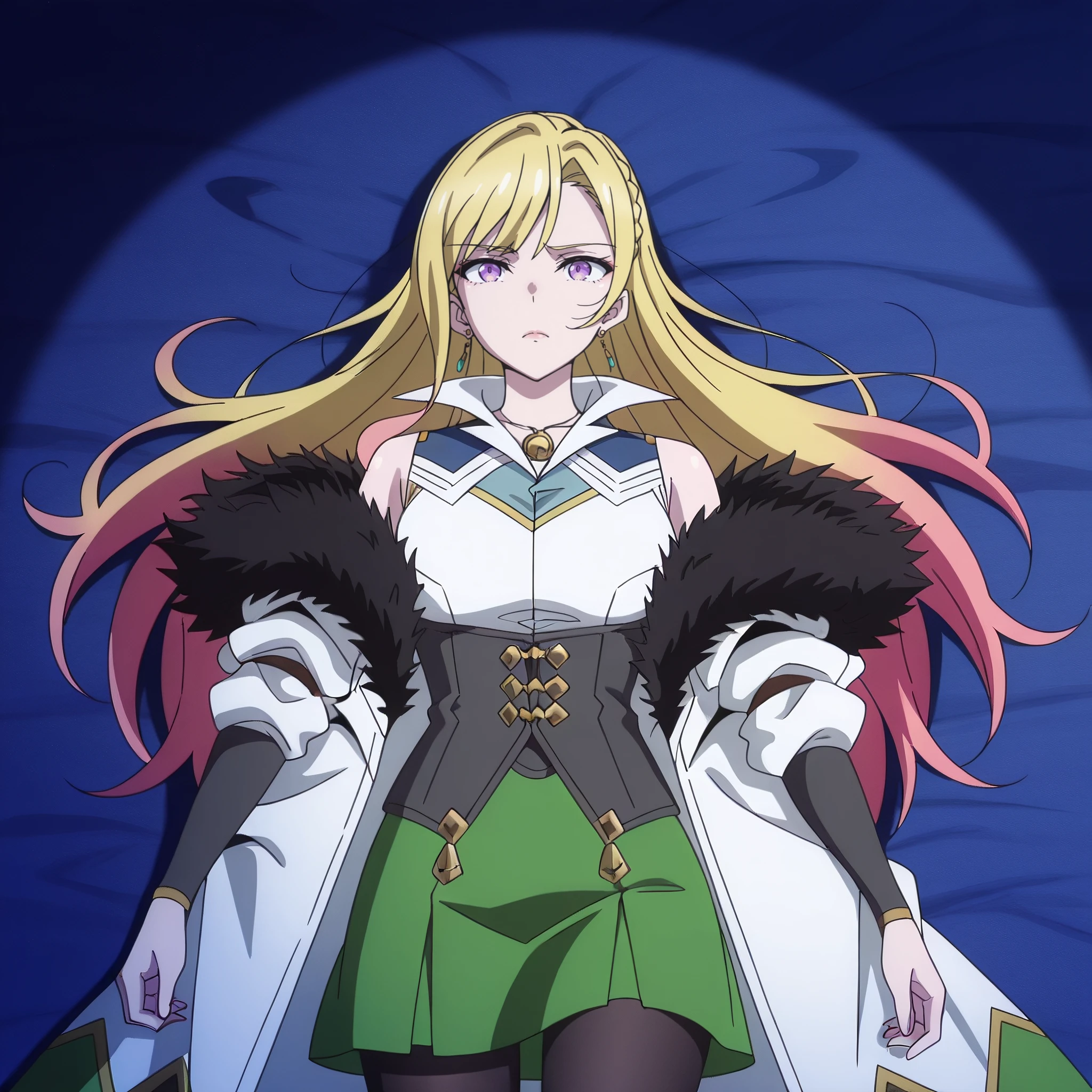 SRAMerlin, blonde hair, purple eyes, long hair, jewelry, earrings, braid, multicolored hair, gradient hair, pink hair, crown braid,