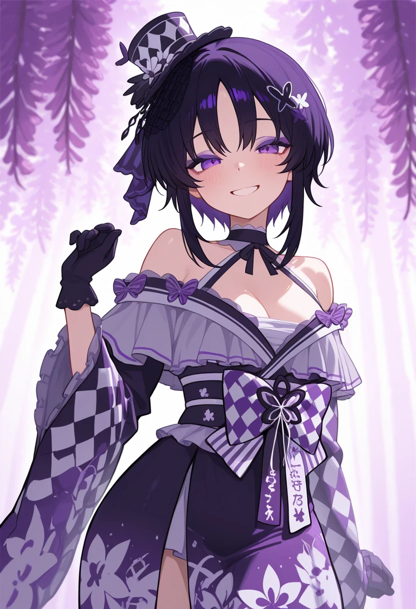 mini_top_hat,japanese_clothes, kimono, black gloves,