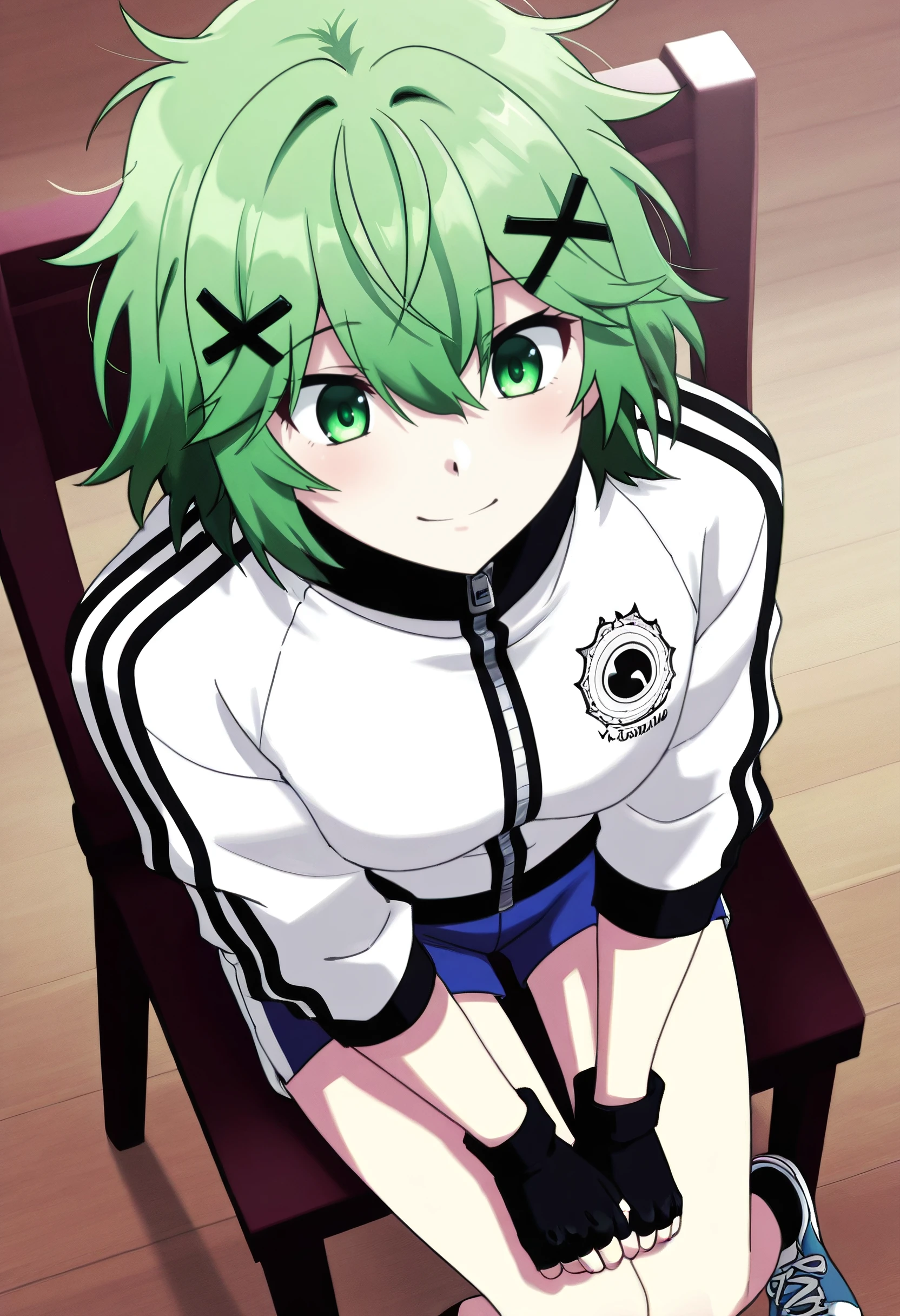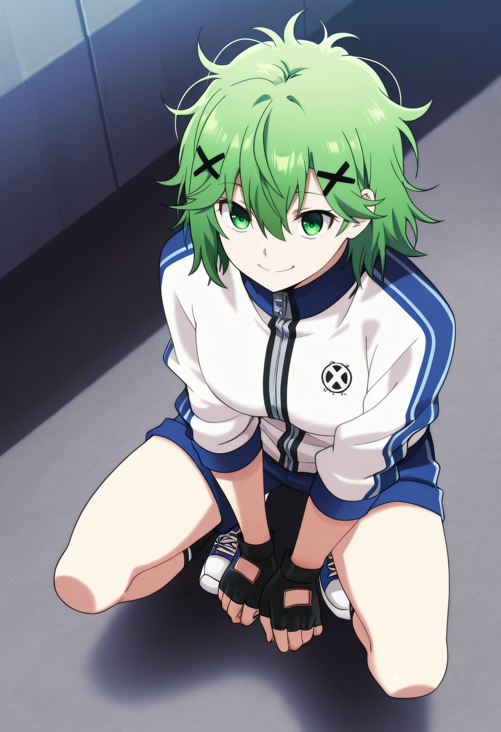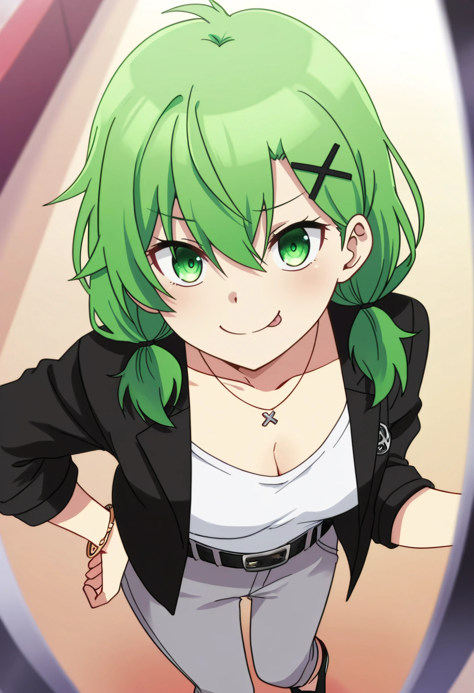 VLoMisa, green hair, short hair, green eyes, x hair ornament, hairclip, hair between eyes,