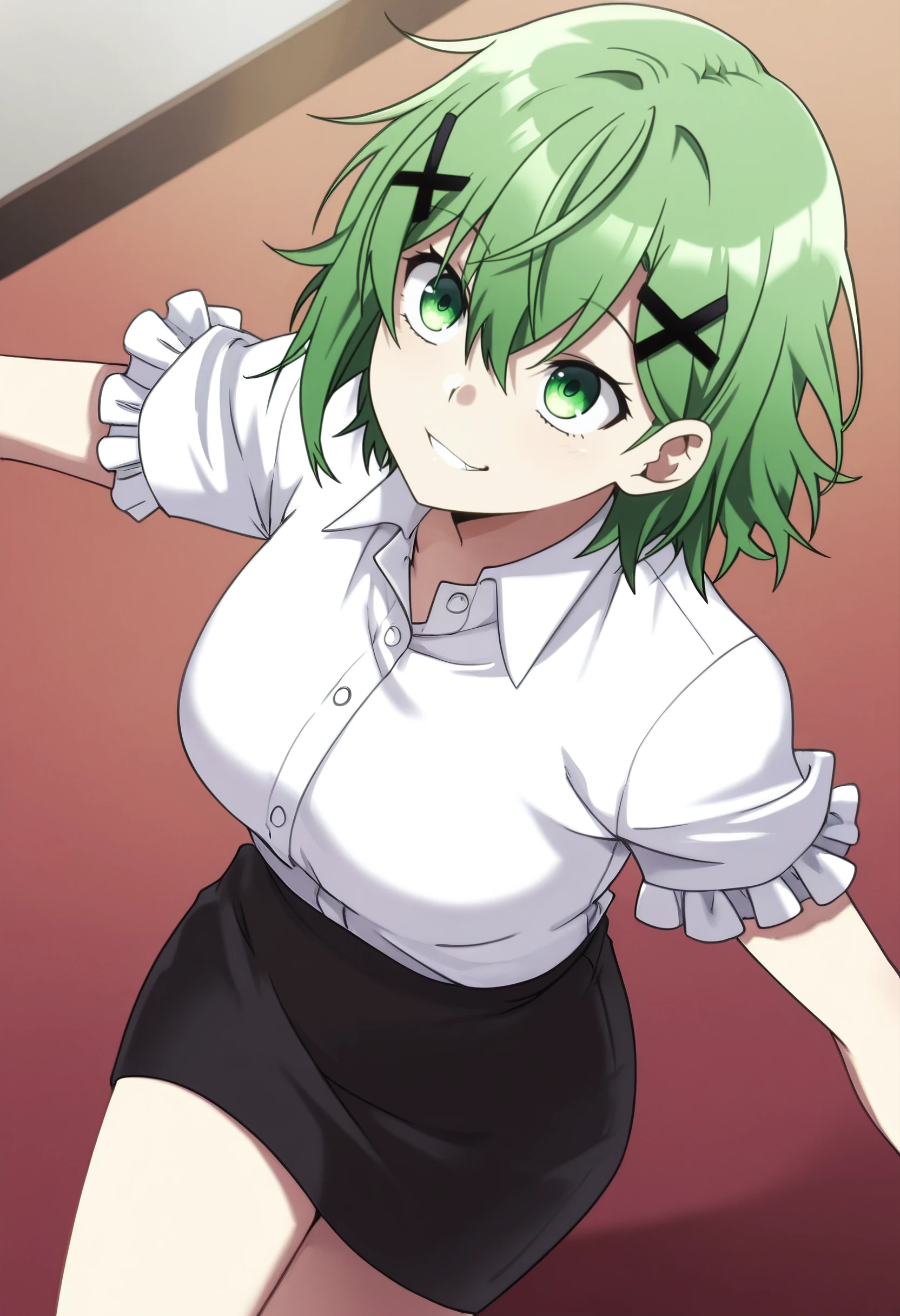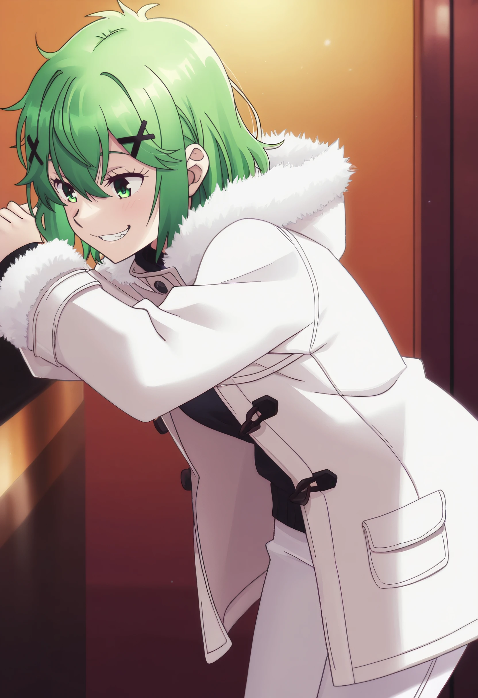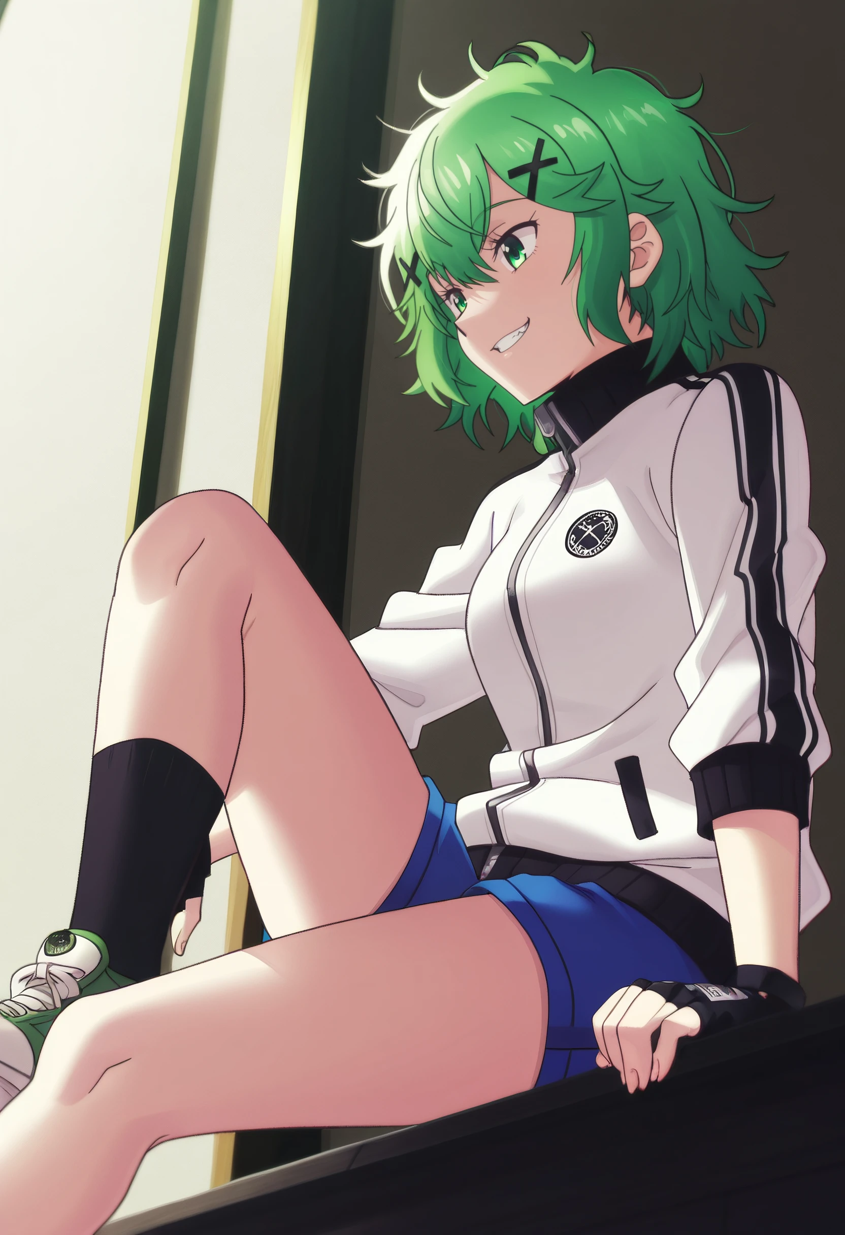 VLoMisa, green hair, short hair, green eyes, x hair ornament, hairclip, hair between eyes,