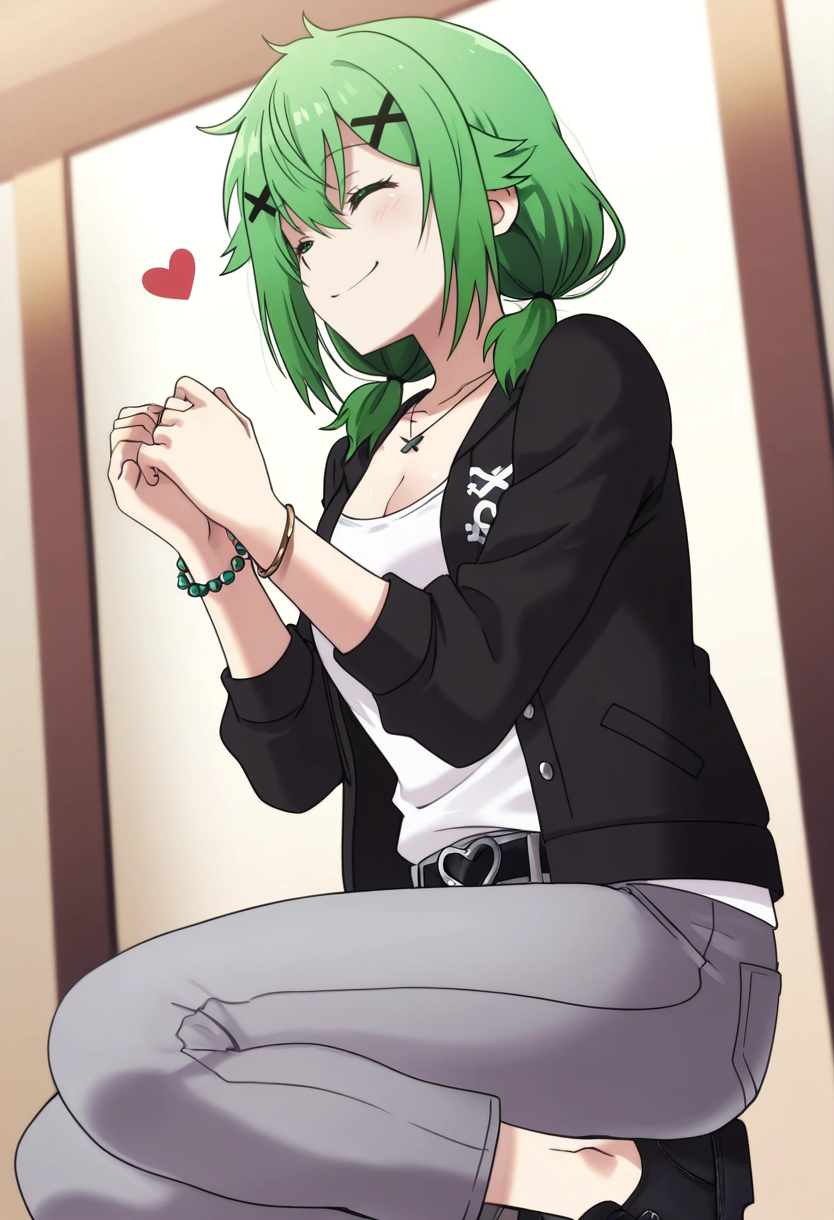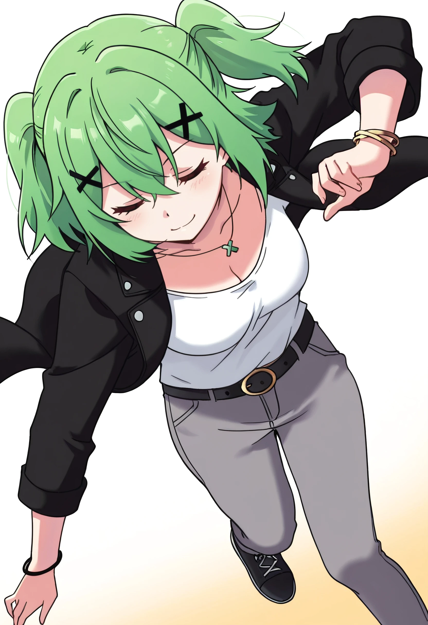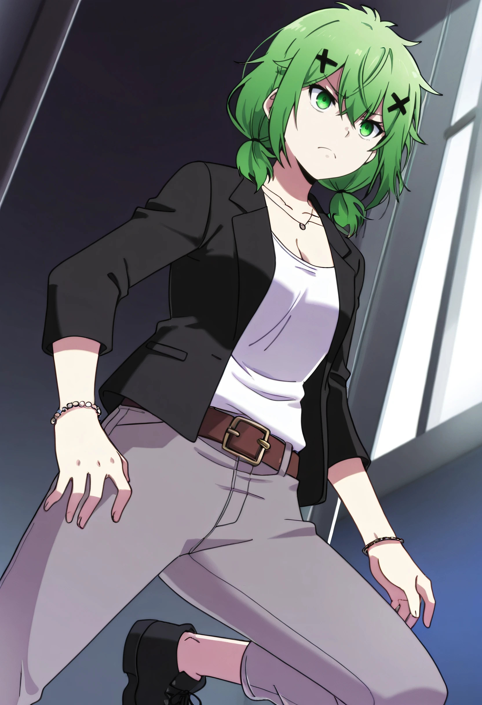 MisaJacketA, jewelry, necklace, jacket, twintails, shirt, hair ornament, low twintails, black jacket, white shirt, open jacket, open clothes, short twintails, casual, pants, long sleeves, bracelet, grey pants, belt, black footwear, cleavage,