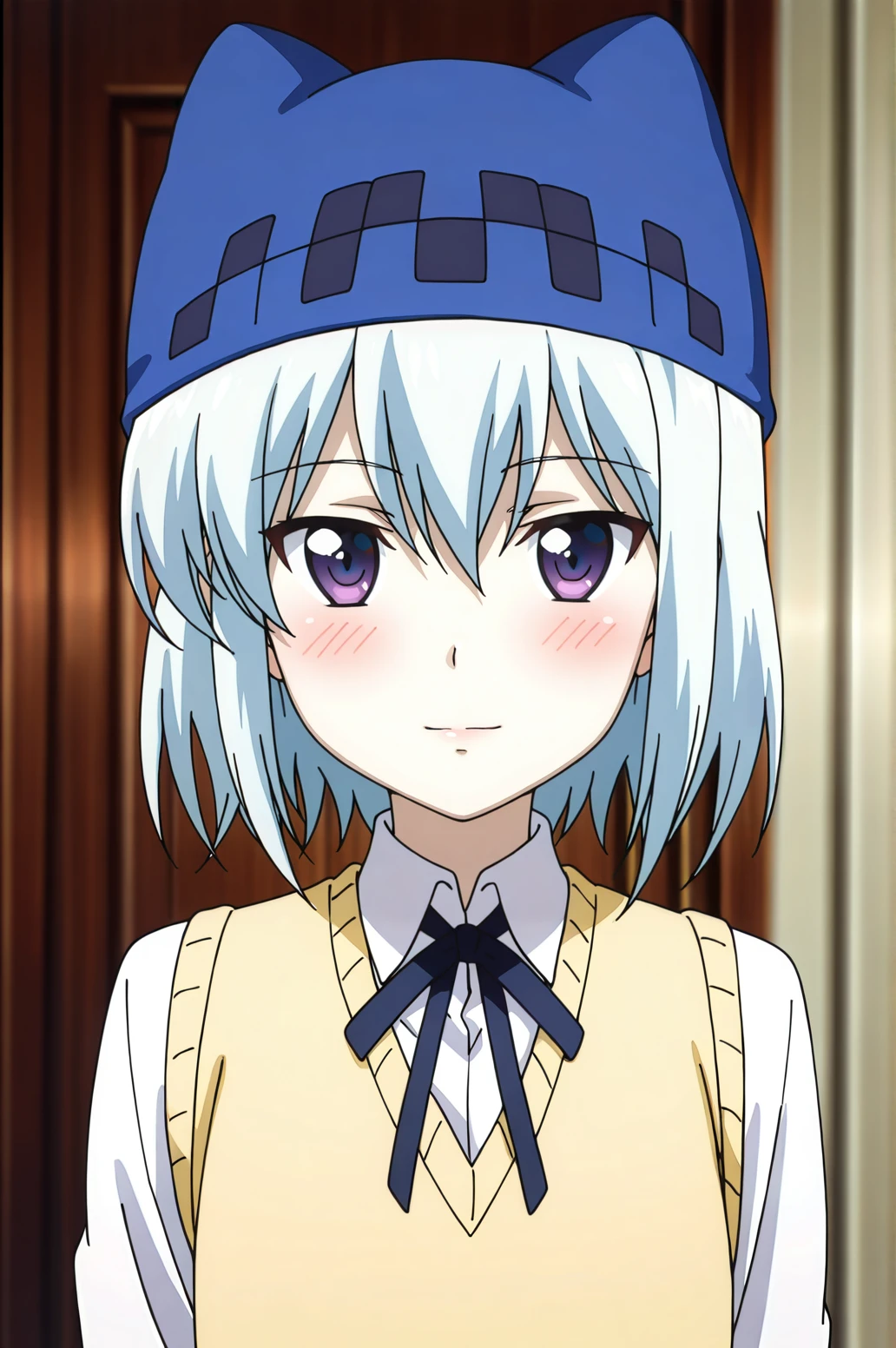 blue beanie, yellow sweater vest, long sleeves, skirt, blue thighhighs,