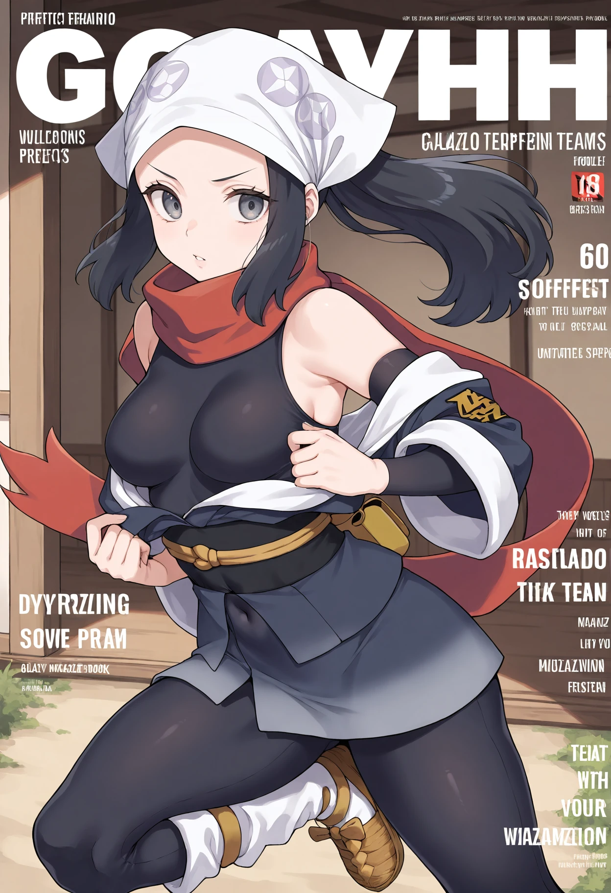 breasts,galaxy expedition team survey corps uniform,sash,medium breasts,white headwear,black bodysuit,red scarf,skin tight,japanese clothes,bodysuit,obi,scarf,socks,kimono,detached sleeves,bodystocking,pantyhose,shirt,covered navel,black pantyhose,bare shoulders,bodysuit under clothes,black undershirt,brown footwear