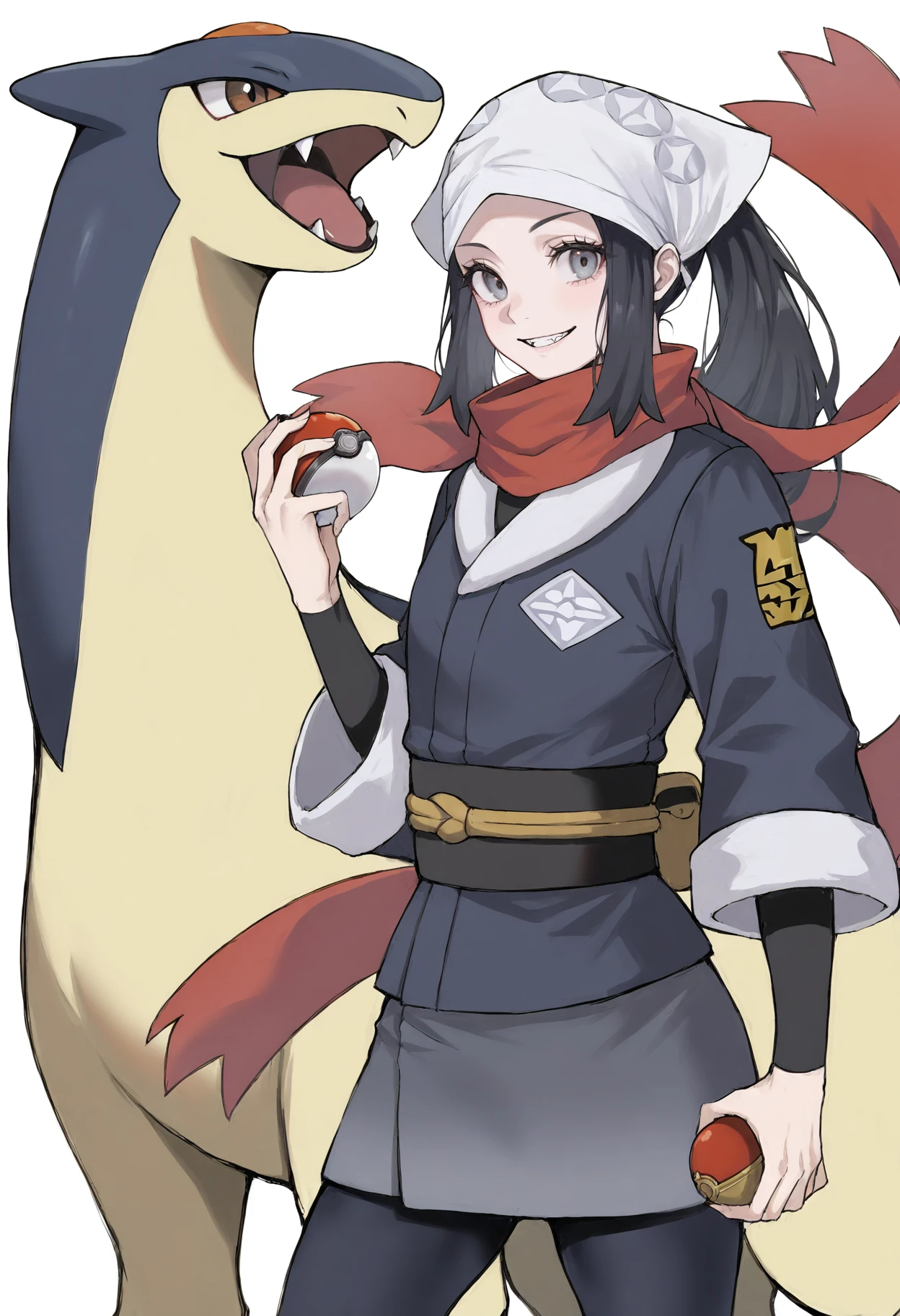 scarf,red scarf,galaxy expedition team survey corps uniform,white headwear,sash,socks,pantyhose,loose socks,brown footwear,jacket,shoes,black shirt,shirt,skirt,japanese clothes,sandals,black pantyhose,undershirt