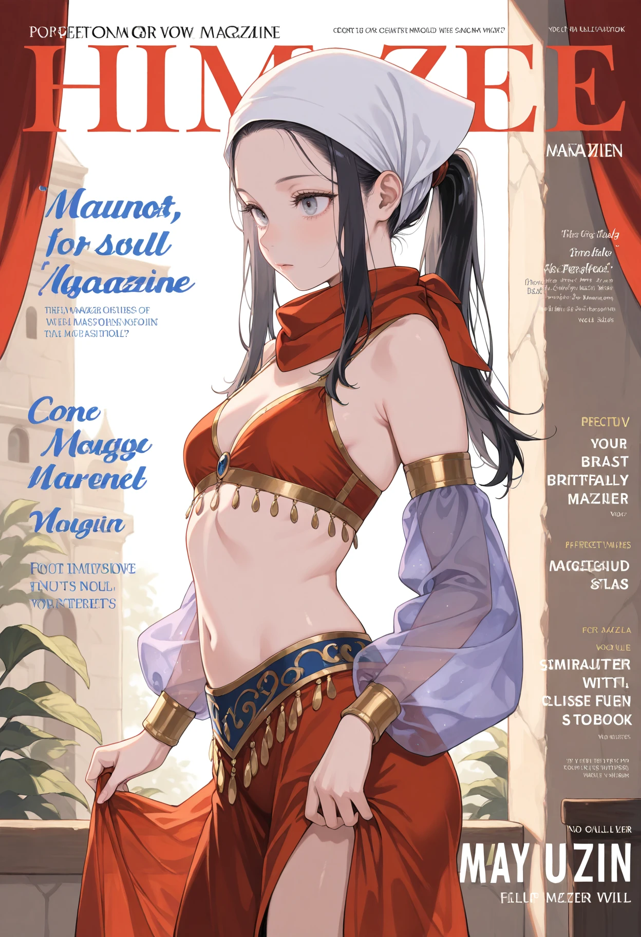 red scarf,breasts,scarf,detached sleeves,white headwear,see-through,small breasts,midriff,arabian clothes,skirt,alternate costume,bare shoulders,harem outfit,see-through sleeves,long sleeves,jewelry,underwear