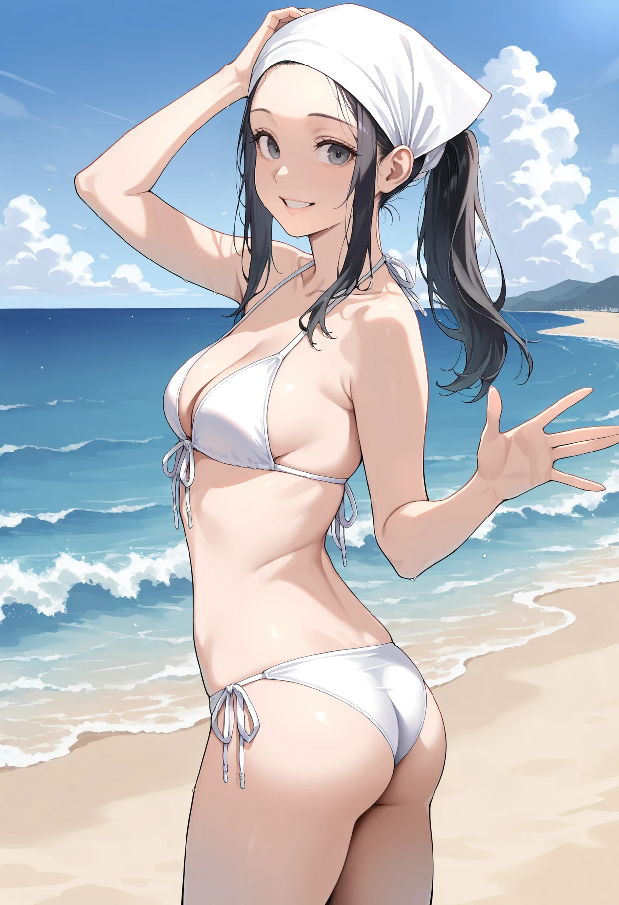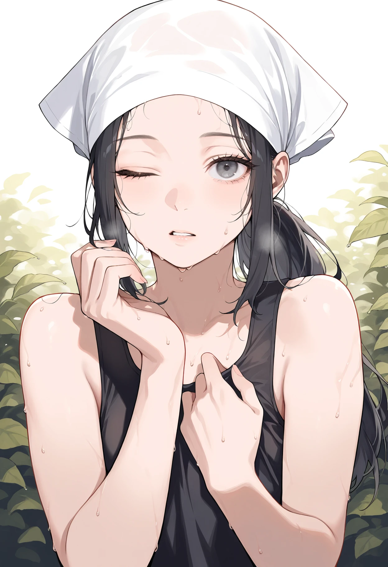 1girl,eyelashes,grey eyes,black eyes,black hair,long hair,ponytail,sidelocks,head scarf
