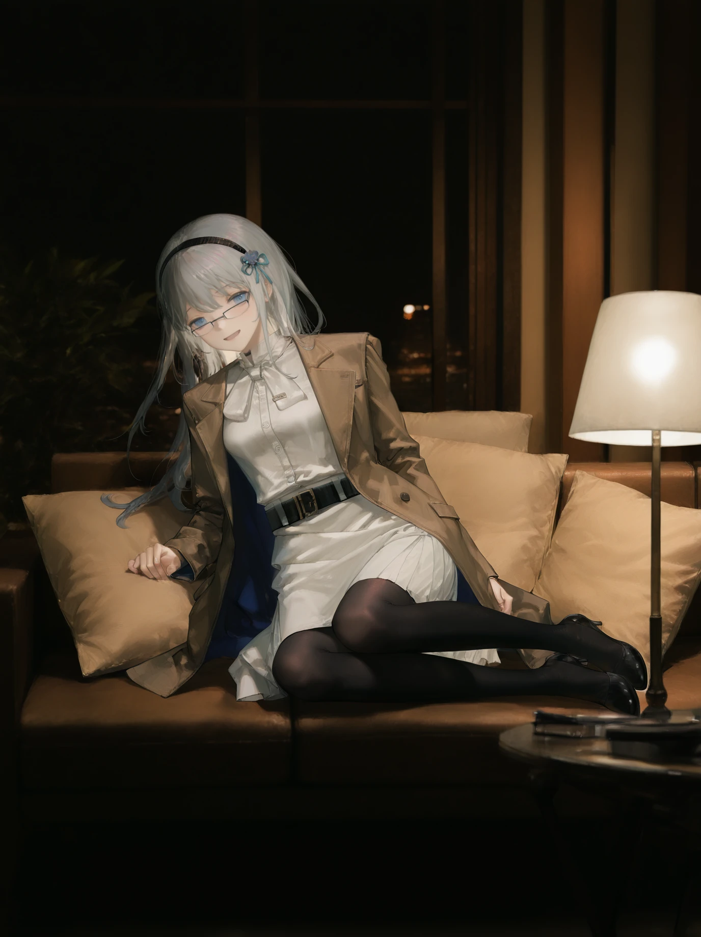 tags:blyd3,1girl,solo,long hair,silver hair,hair ornament,blue eyes,black-framed eyewear,white bowtie,brown coat,long sleeves,open coat,white shirt,belt buckle,black belt,black hairband,white skirt,black pantyhose,black high heels,
