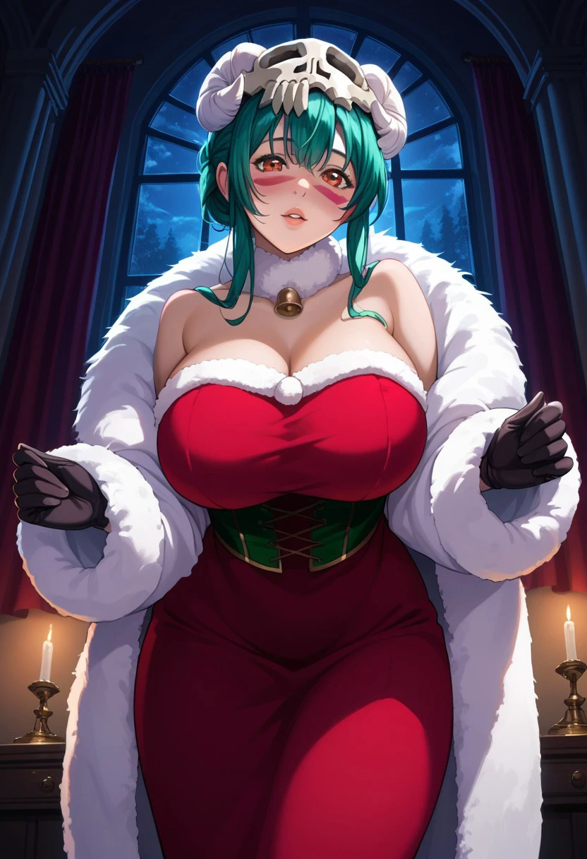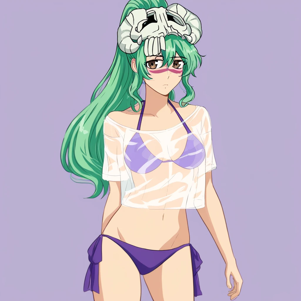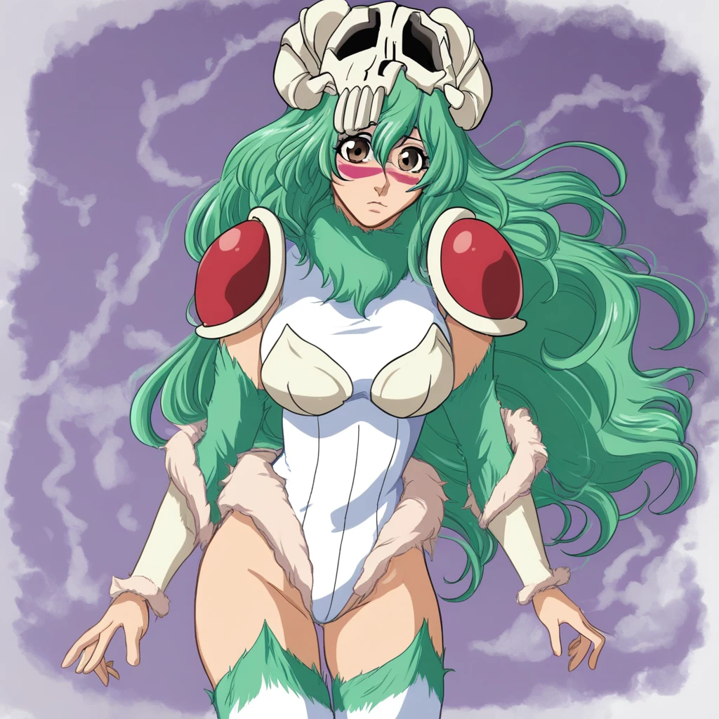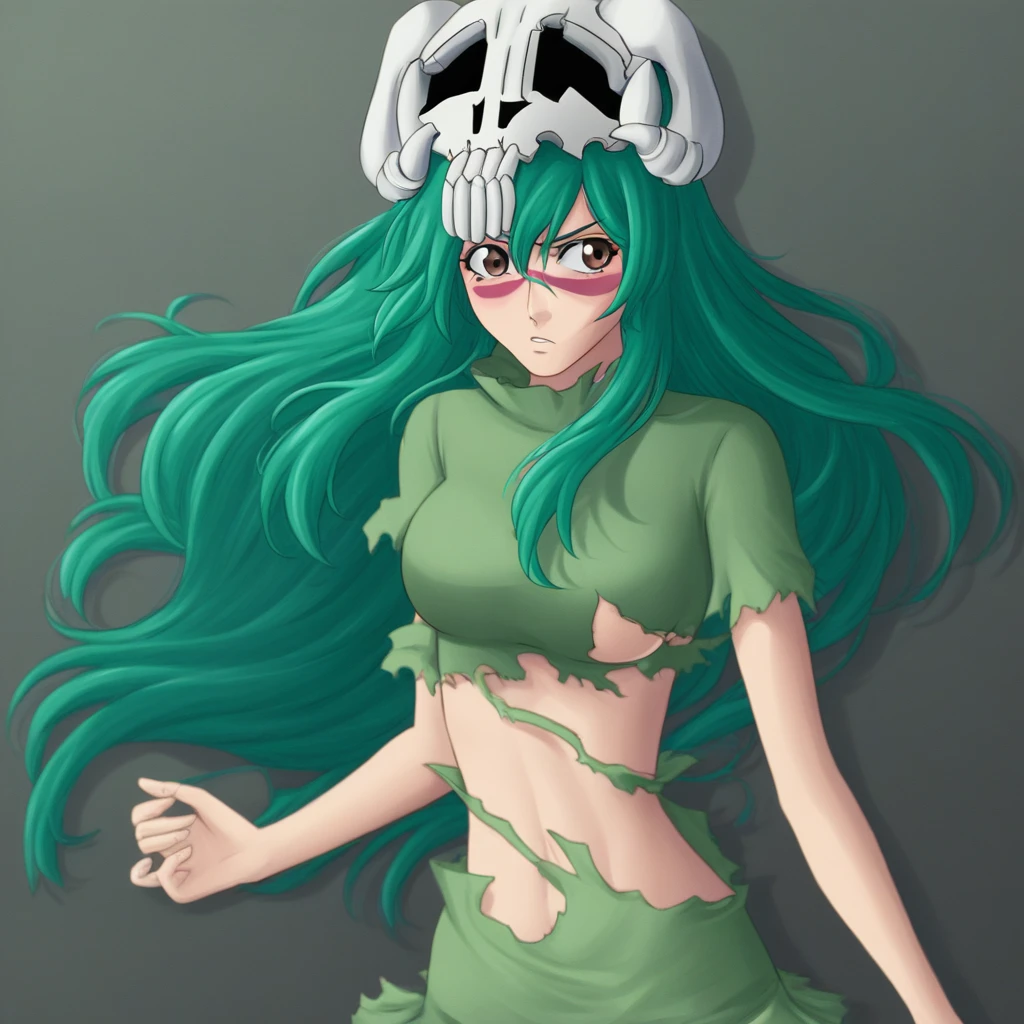 nelliel tu odelschwanck, brown eyes, green hair, long hair, facial mark, skull,