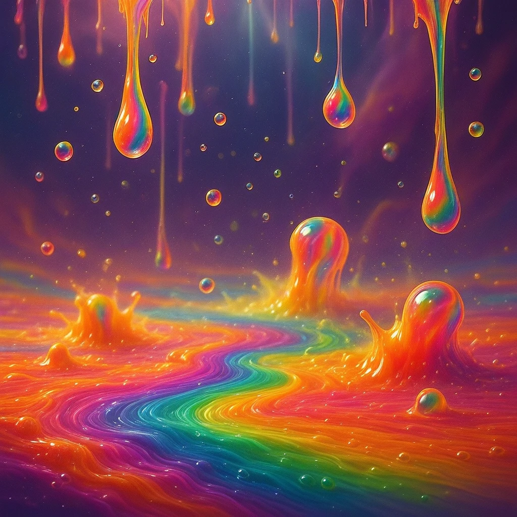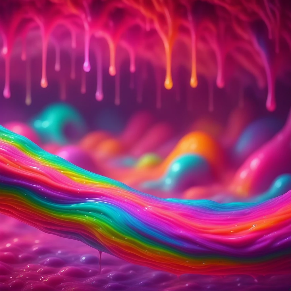 vibrant colors, rainbow slime, glossy texture, photorealistic lighting, high contrast, semi-translucent goo, sticky surface, colorful fluid, liquid motion, cinematic glow, surreal lighting, volumetric glow, slime bubbles, macro details, dripping effect, rainbow streaks, psychedelic slime, colorful reflections, thick slime, organic shapes, hyper saturated colors, shiny liquid, glowing goo, wet surface, multicolored storm, surreal environment, colorful waves, bouncing blobs, dreamy lighting, slime physics