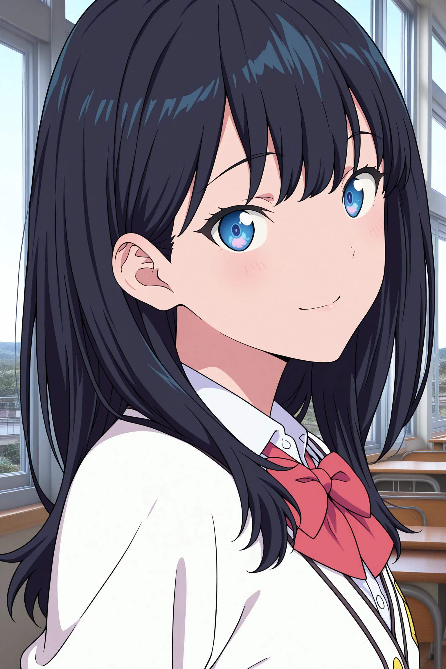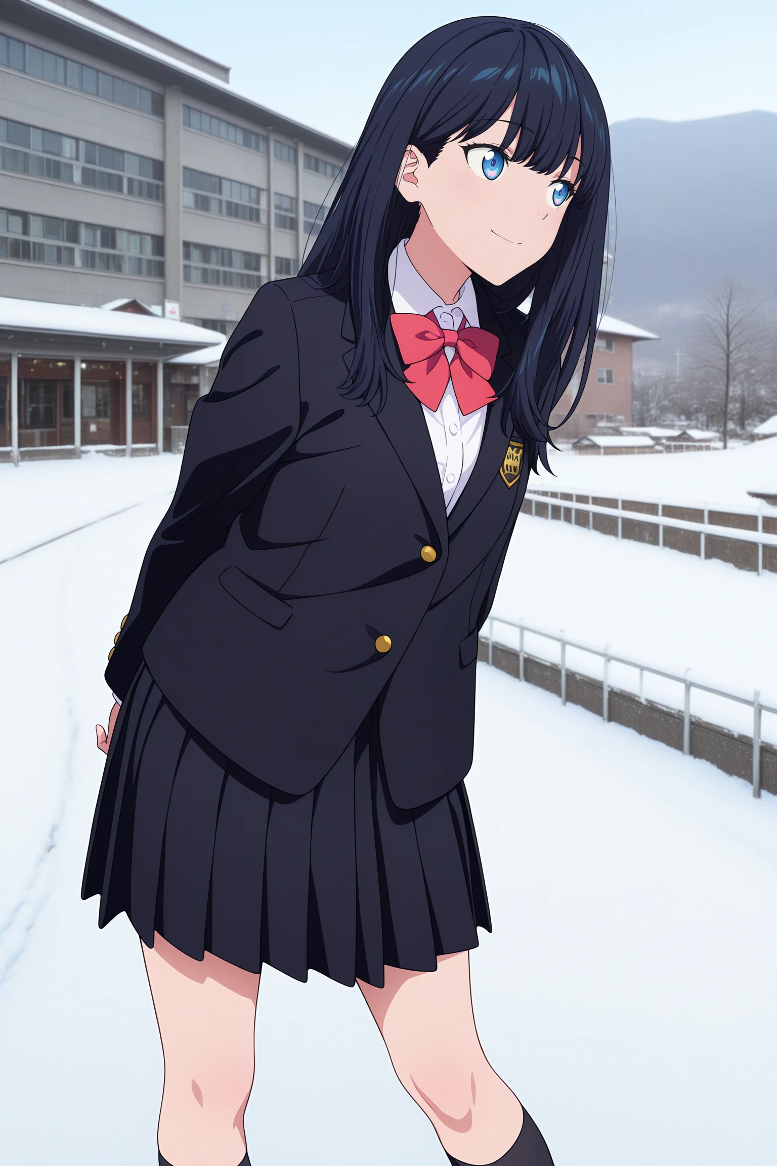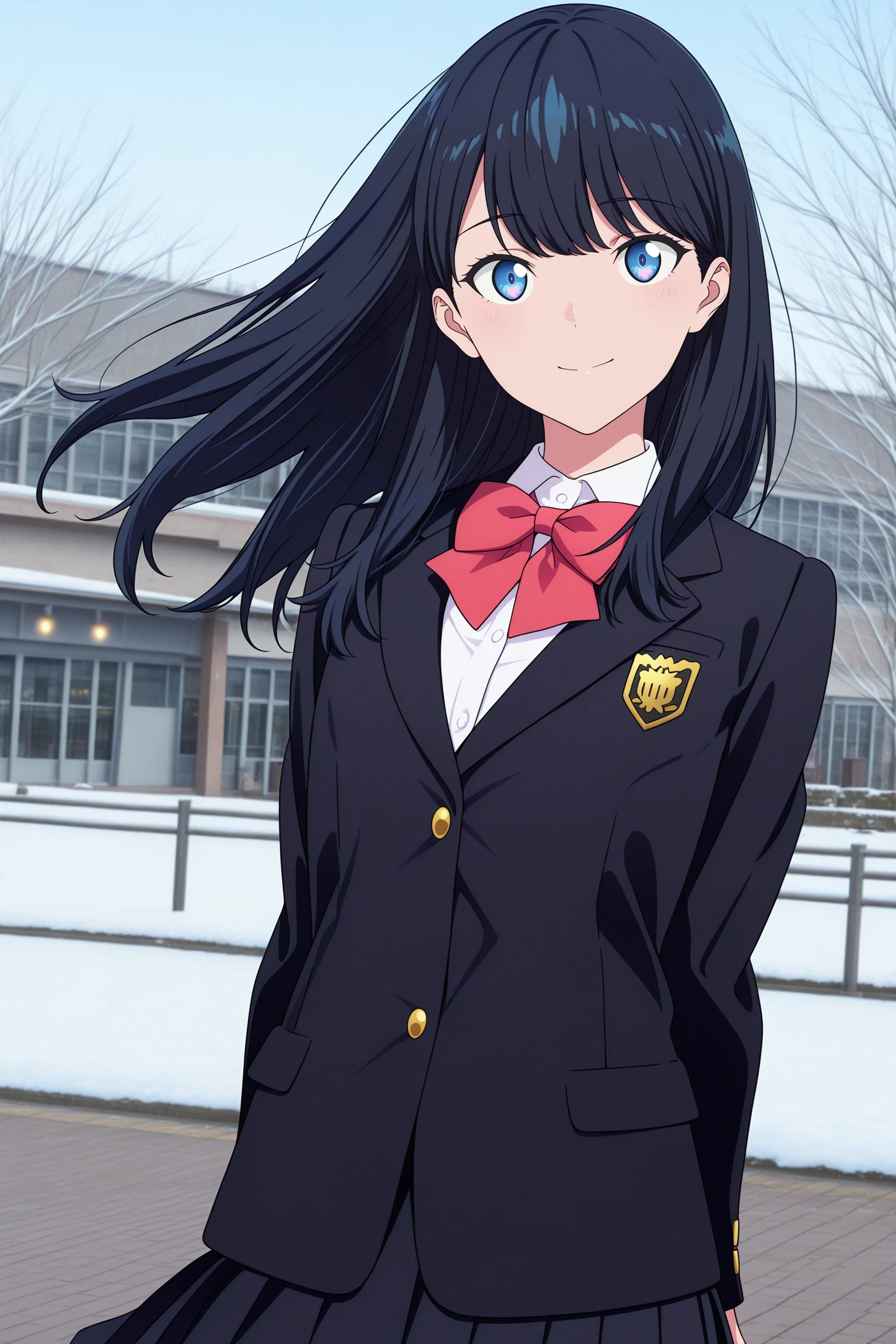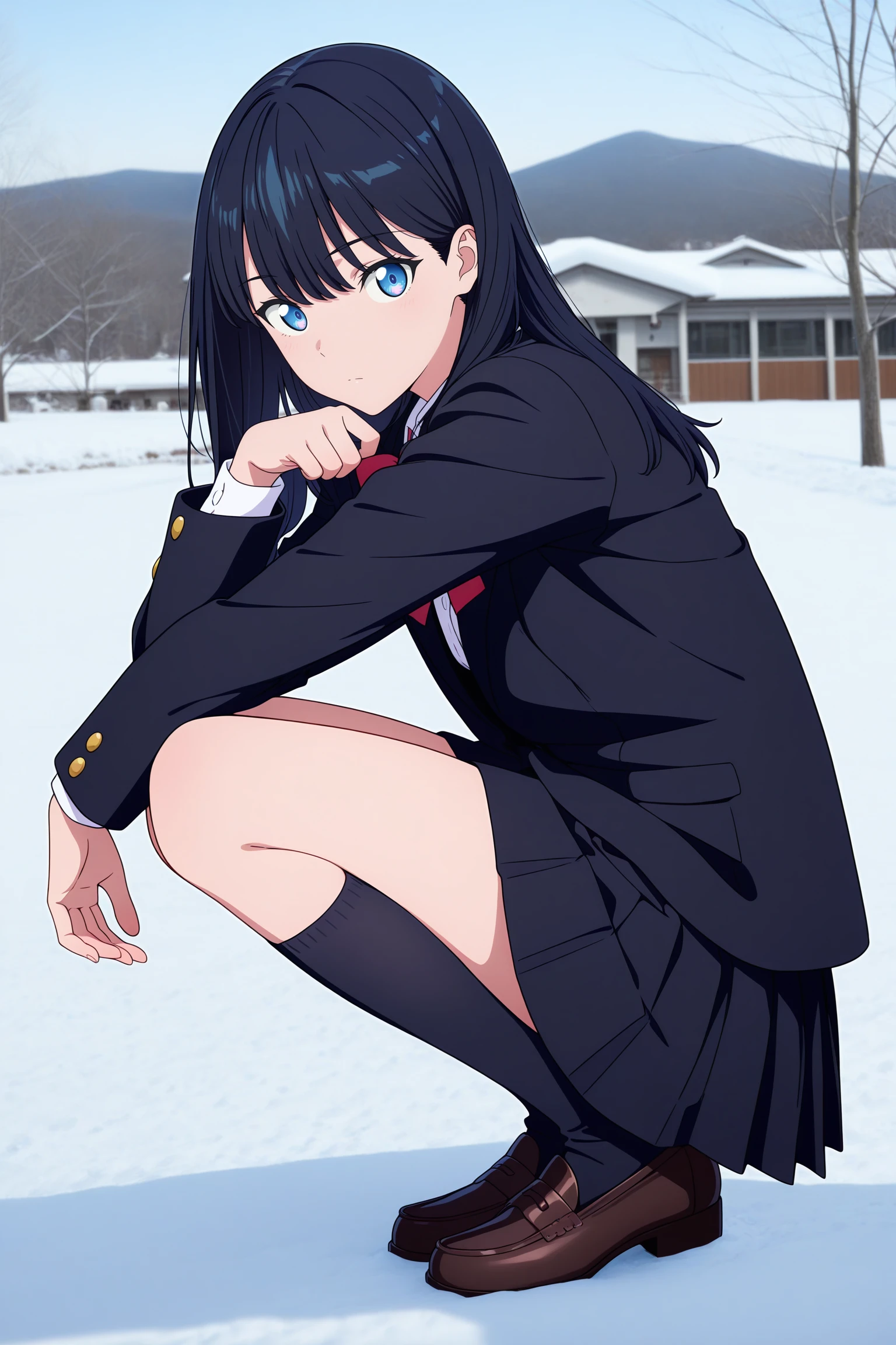 tkrdrkk, long hair, black hair, choppy bangs, blue eyes, long sleeves, black jacket, white shirt, collared shirt, red bowtie, black skirt, pleated skirt, black socks, kneehighs, brown footwear, loafers