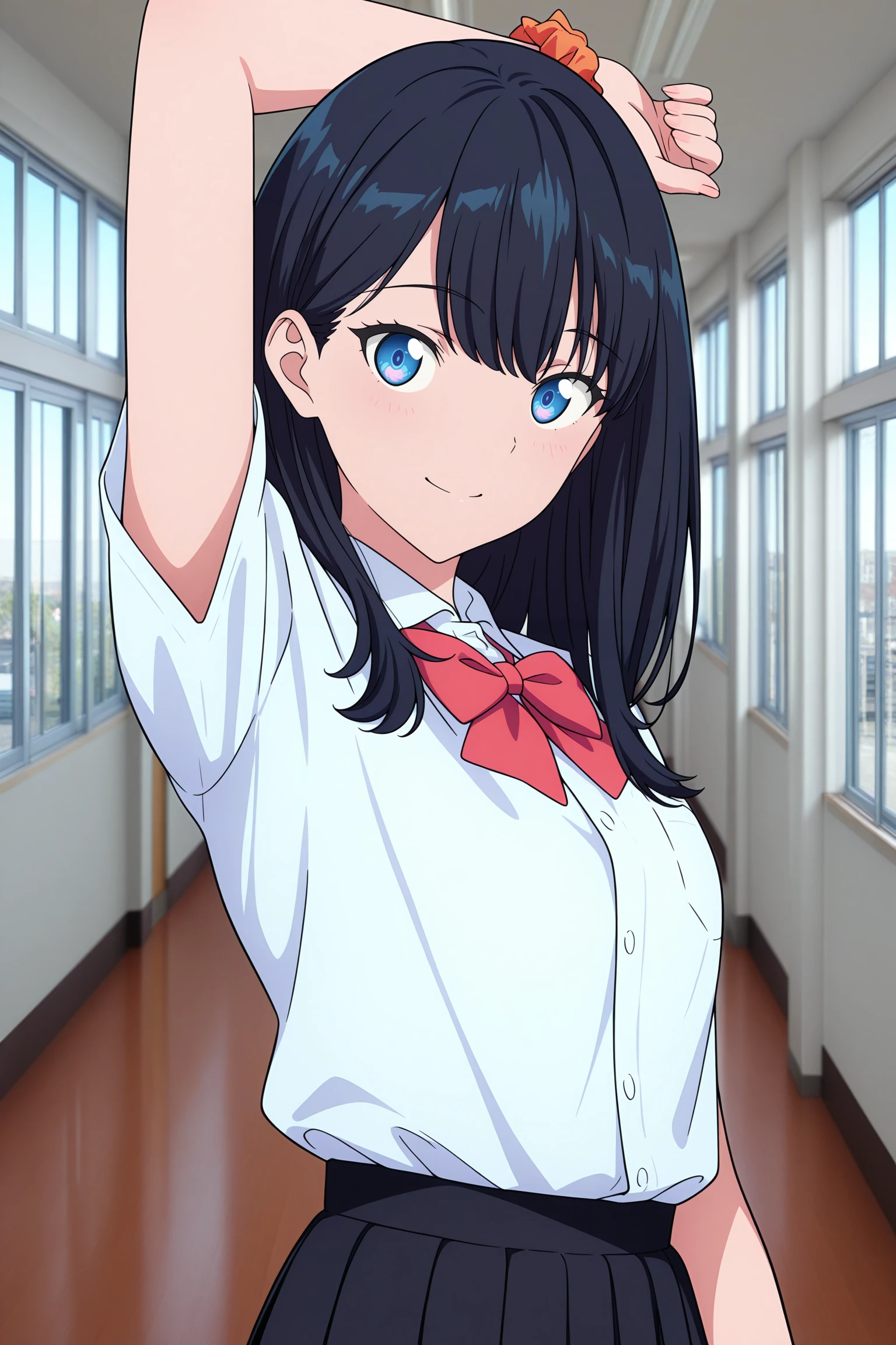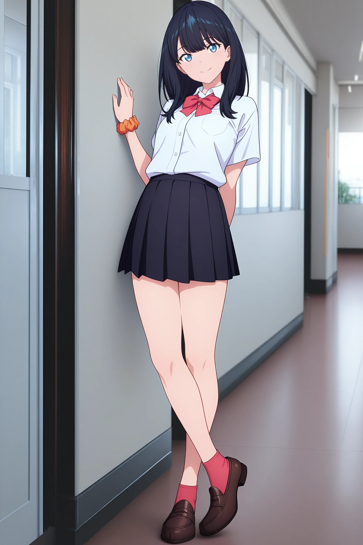 tkrdrkk, long hair, black hair, choppy bangs, blue eyes, short sleeves, orange scrunchie, white shirt, collared shirt, red bowtie, black skirt, miniskirt, pleated skirt, red socks, ankle socks, brown footwear, loafers