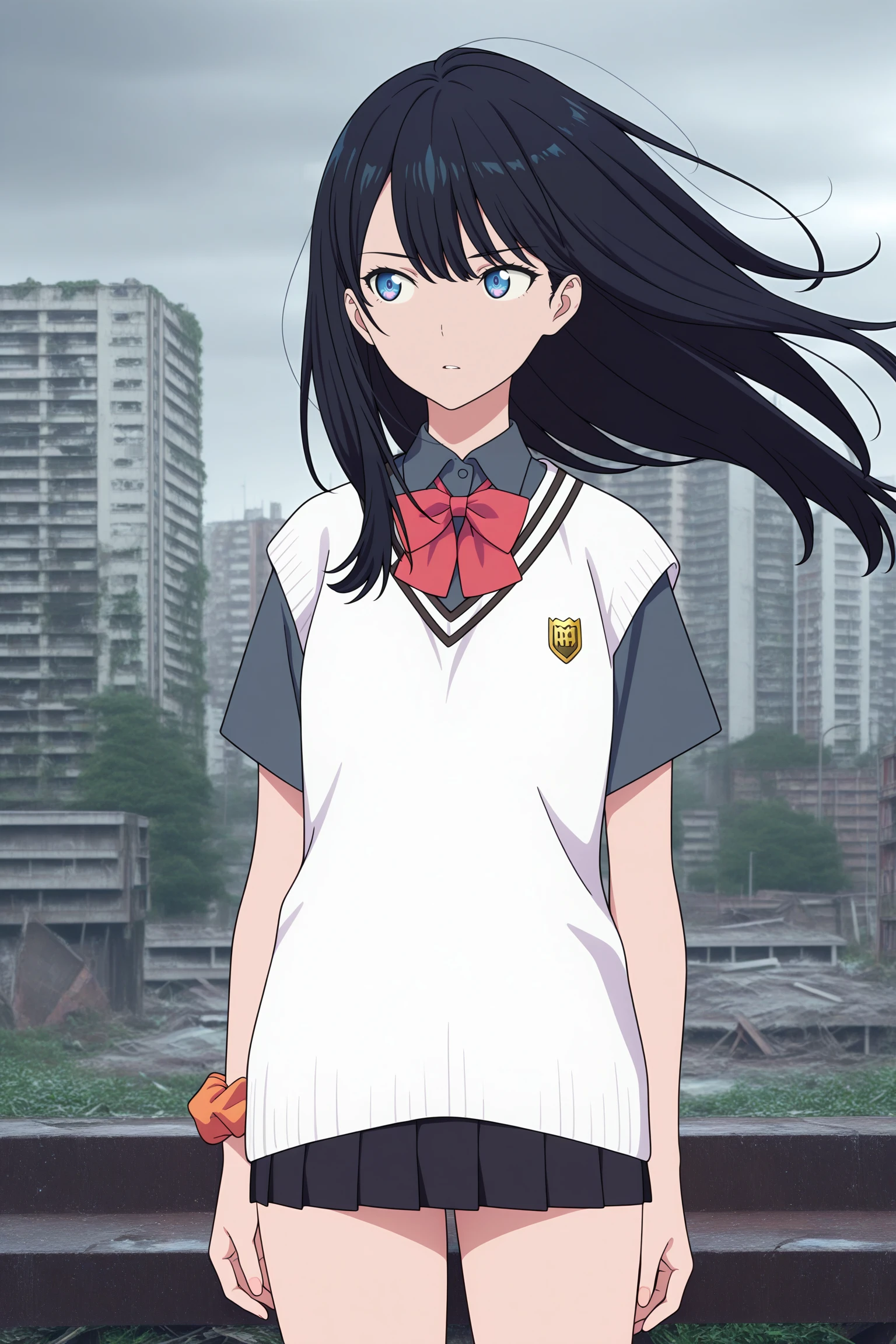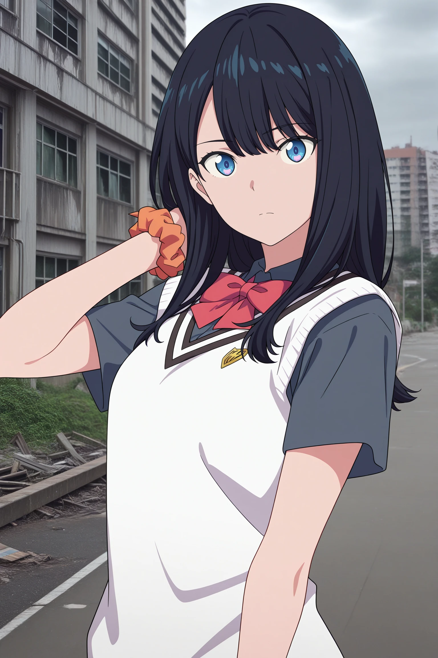 tkrdrkk, long hair, black hair, choppy bangs, blue eyes, short sleeves, orange scrunchie, white sweater vest, grey shirt, collared shirt, red bowtie, black skirt, pleated skirt, red socks, striped socks, kneehighs, brown footwear, loafers