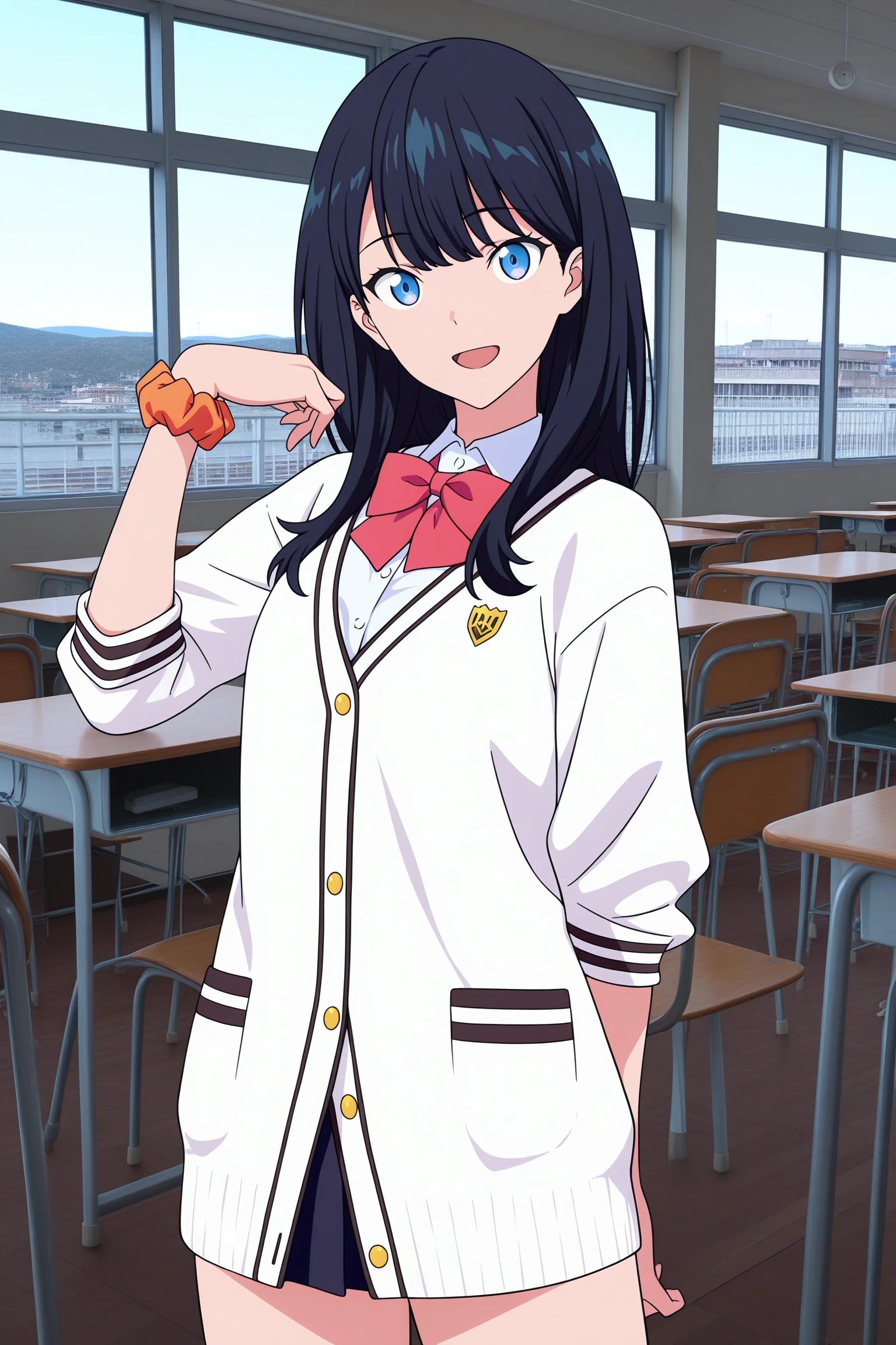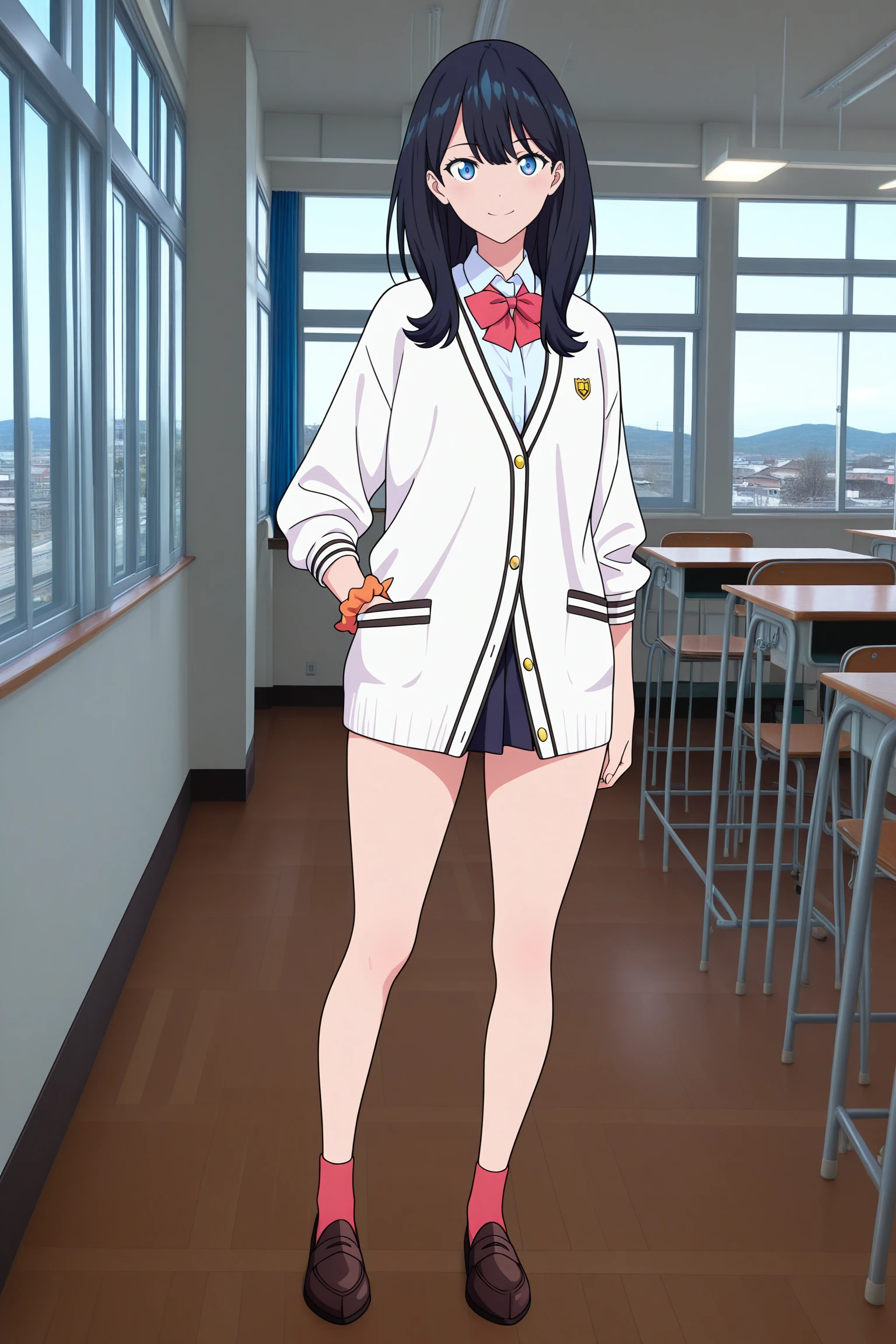 tkrdrkk, long hair, black hair, choppy bangs, blue eyes, three-quarter sleeves, orange scrunchie, white cardigan, white shirt, collared shirt, red bowtie, red socks, ankle socks, brown footwear, loafers