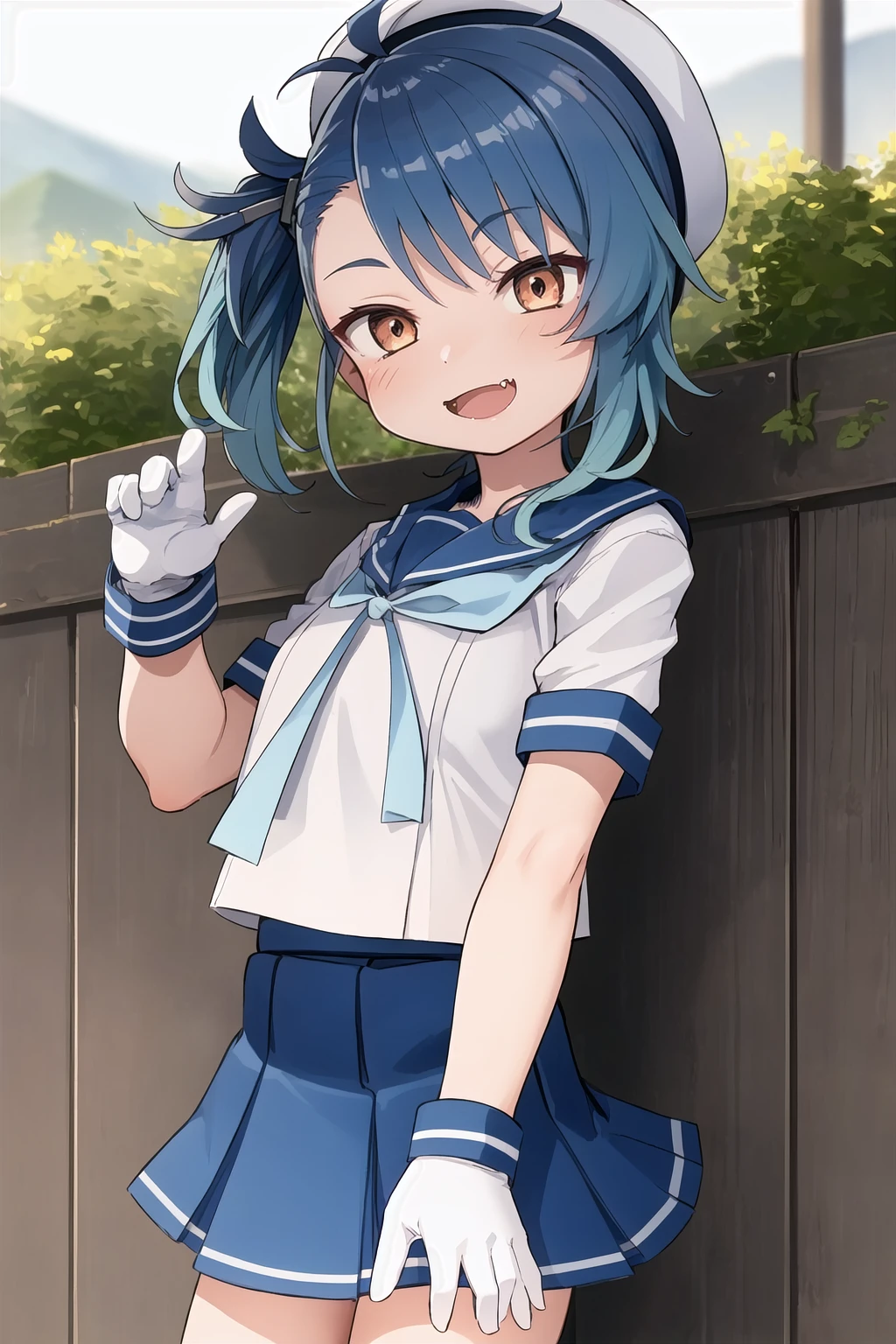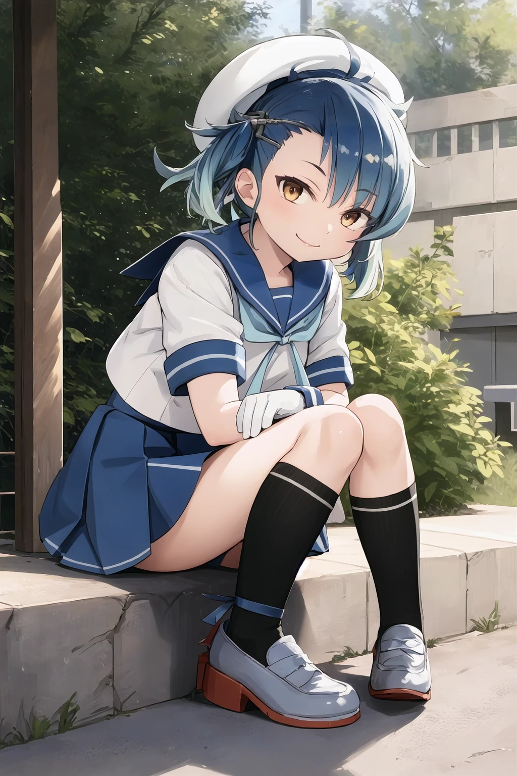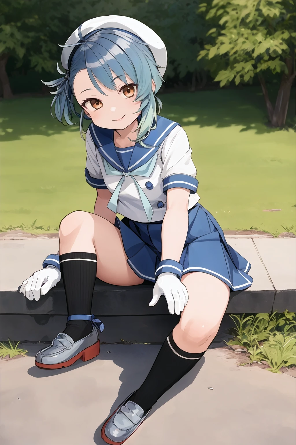 Outfit : school uniform, hat, blue sailor collar, blue ribbon, blue neckerchief, short sleeves, arm warmers, white gloves, blue skirt, pleated skirt, black socks, kneehighs, shoes, grey footwear,